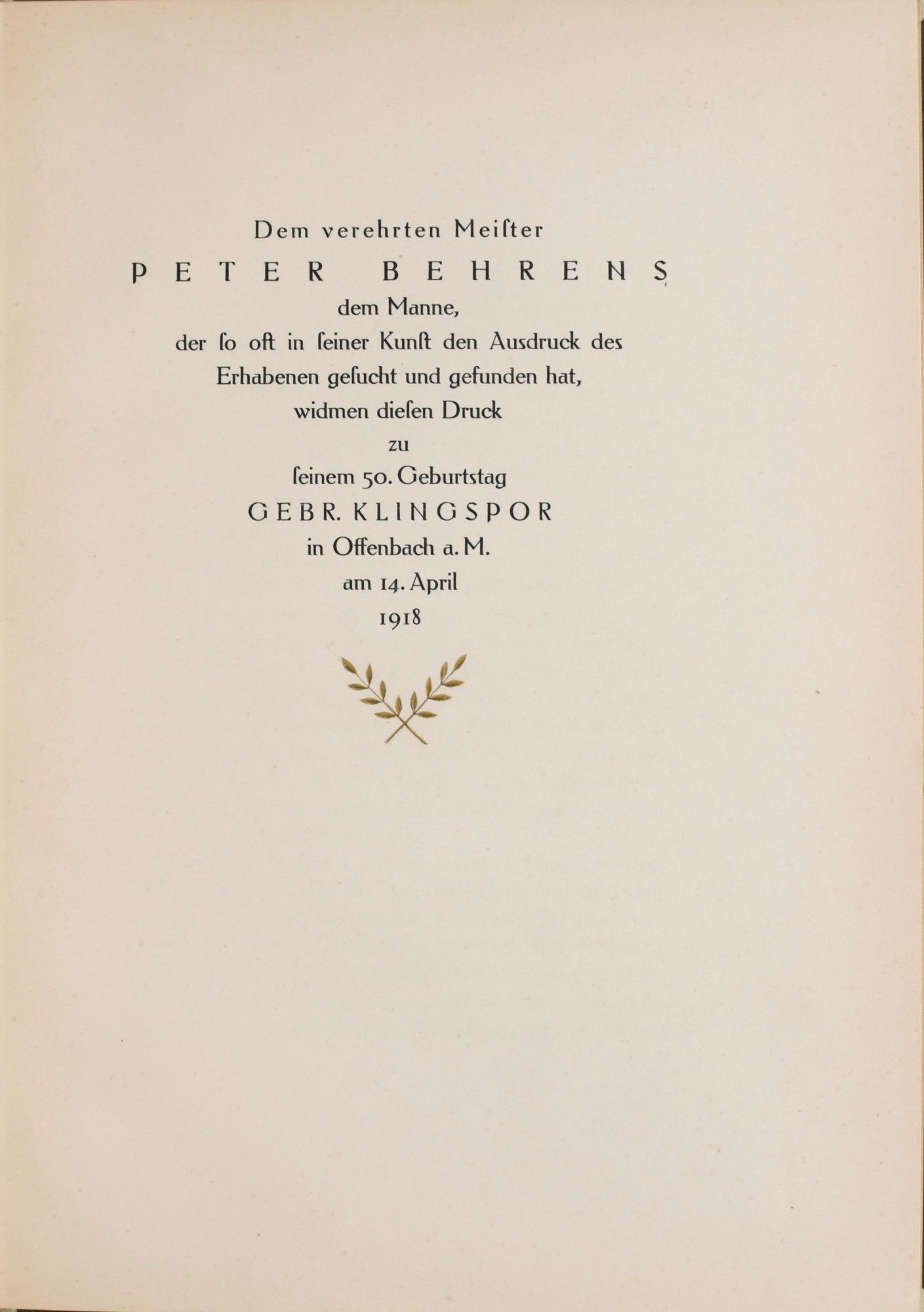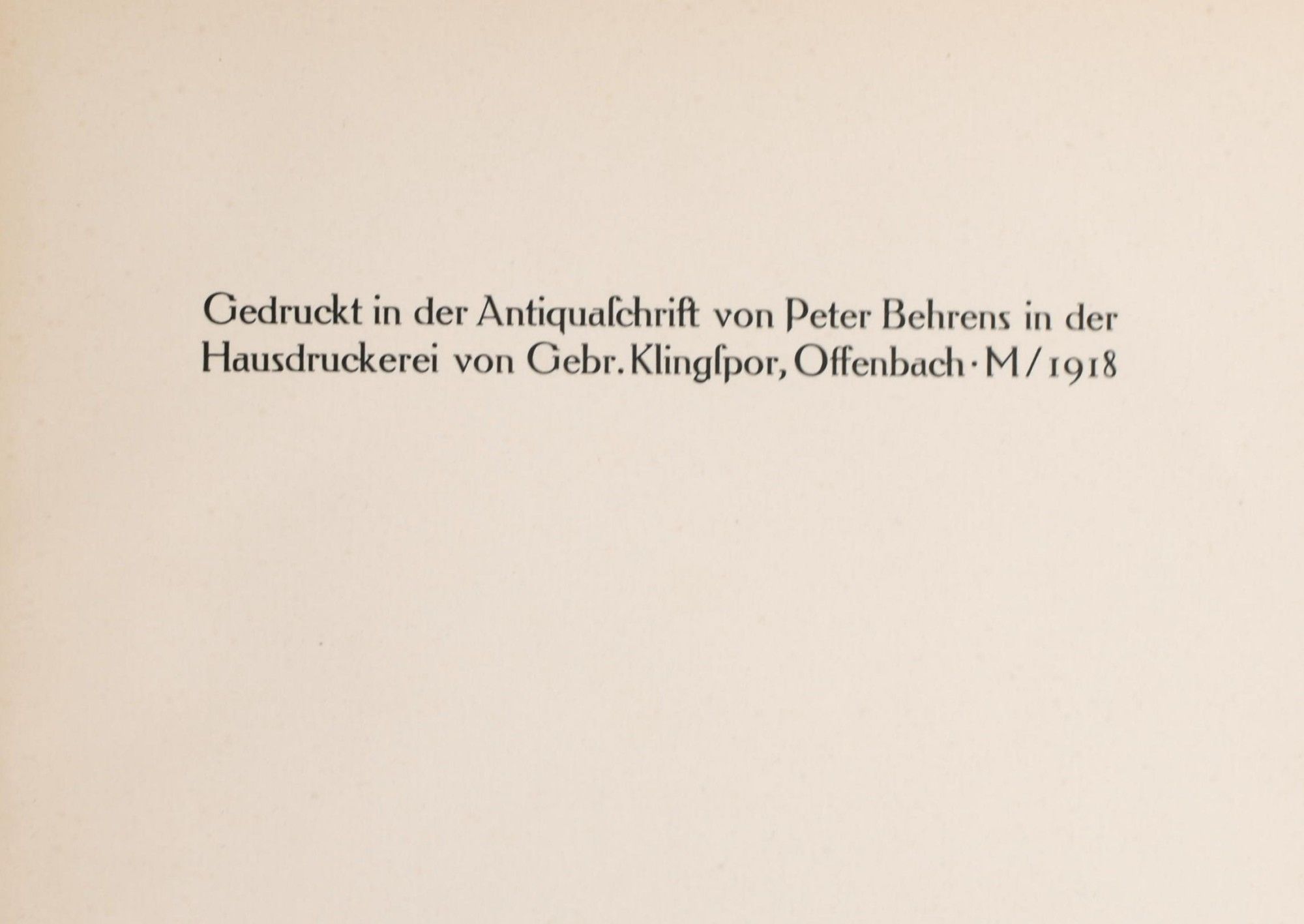 Offenbach am Main: Klingspor Press, 1918. Quarto; n black paper-covered boards with vellum spine and tips; titling in gilt on the upper board and the spine; 27 pages; there is a very faint stain to the upper board from a round sticker, now removed. ~~With the splendid type of Karl Klingspor, and two attractively subtle decorations in gilt; designed by Peter Behrens, an architect and graphic designer; one of his was Mies van der Rohe.