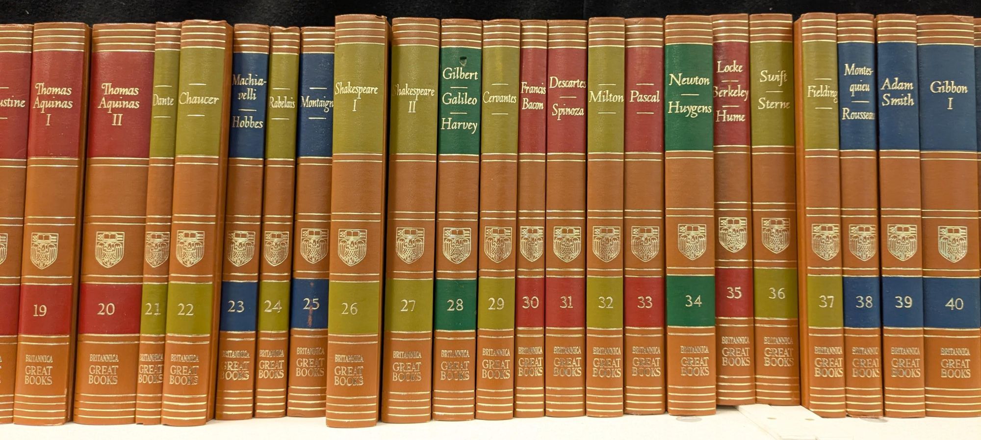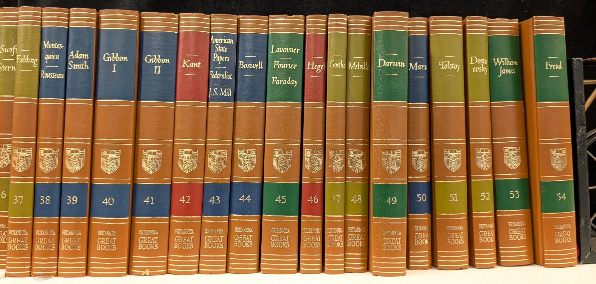 Chicago, London, Toronto: Encyclopaedia Britannica, Inc., William Benton, 1952. Hardcover. Very Good. Octavo [24 cm] Brown hardcovers with gilt stamped titles against various colors of ink stamped backgrounds on the spines. Gilt stamped decorations on the spines. All volumes are in very good condition. Occasional light rubbing to the covers. Creasing to the preliminary pages of volume 39. Small gouge to surface of the spine of volume 28 and minor chips to the spine ends of volume 41. ***Will require extra postage due to number of volumes and weight. "From the ancient classics to recent masterpieces, the Great Books of the Western World is the ultimate introduction to the ideas, stories, and discoveries that have shaped modern civilization." - Encyclopaedia Brittanica.