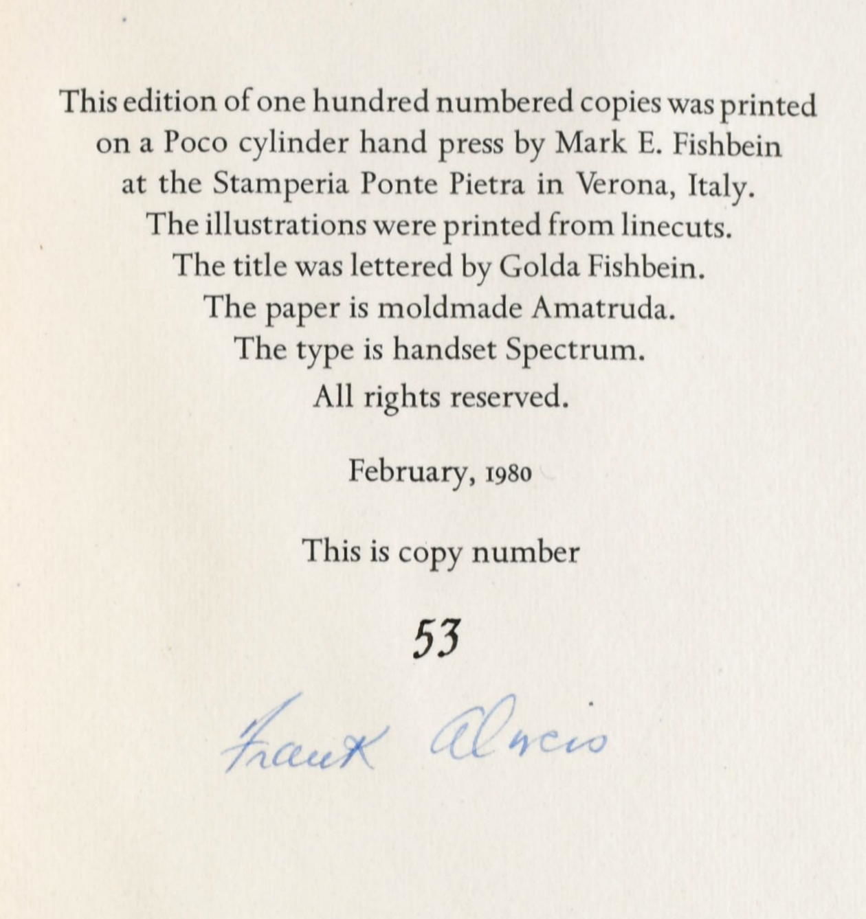 Verona, Italy: Stamperia Ponte Pietra, 1980. Limited Edition. Near Fine binding. 8vo.; blue silk binding, titled in gilt to the upper board; issued in an edition of 100 numbered copies of which this is #53, signed by Frank Alweis; [17] pages, with color illustrations.~~The illustrations were printed from linecuts; the whole on moldmade Amatruda paper. ~~The blue silk binding has just the faintest bit of fade to the spine; it is housed in the publisher's card stock case. Near Fine binding.