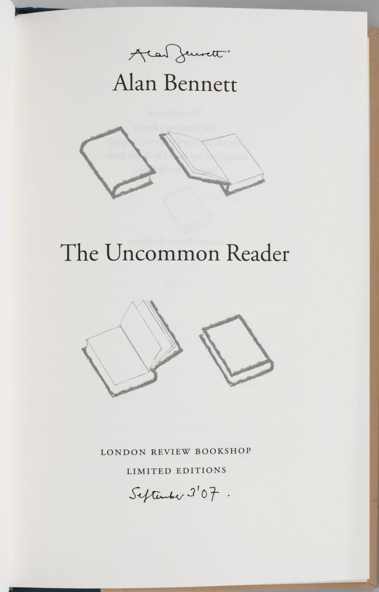 London: London Review Bookshop, 2007. Limited Edition. Hard Cover. Near Fine binding. Signed. Large 8vo.; in quarter-bound blue morocco over tan paper-covered boards, housed in a slipcase; spine is titled in gilt; [8], 9-99 pages; this special edition is limited to 100 signed copies, of which this is number 77; it is signed by Mr. Bennett on the title page, and dated in his hand.~~Alan Bennett' amusing book. He authored ~"The History Boys" and "The Madness of King George". What if Her Majesty Queen Elizabeth II were suddenly to become a voracious reader? Hilarity ensues. Near Fine binding.