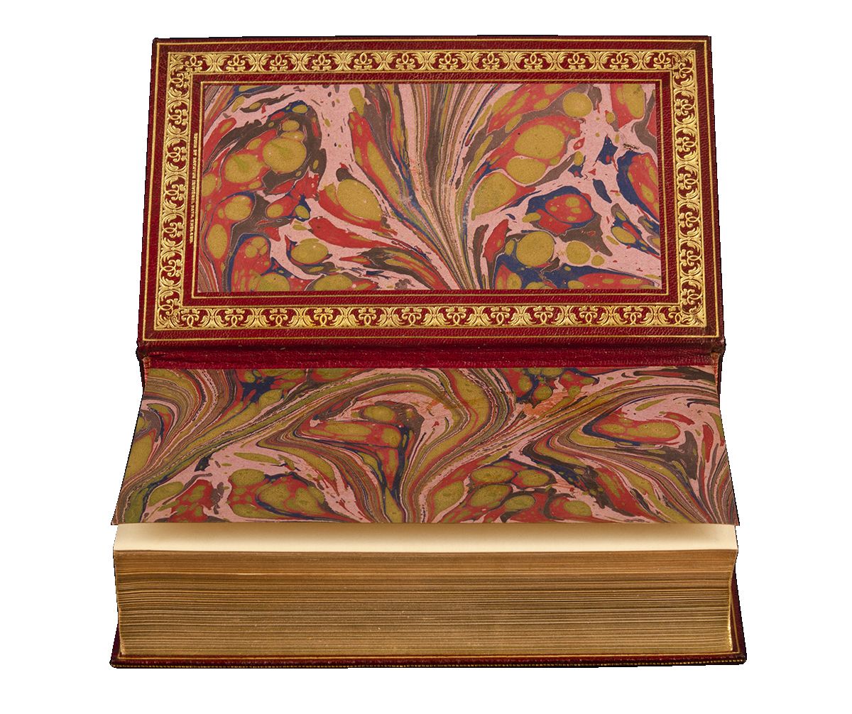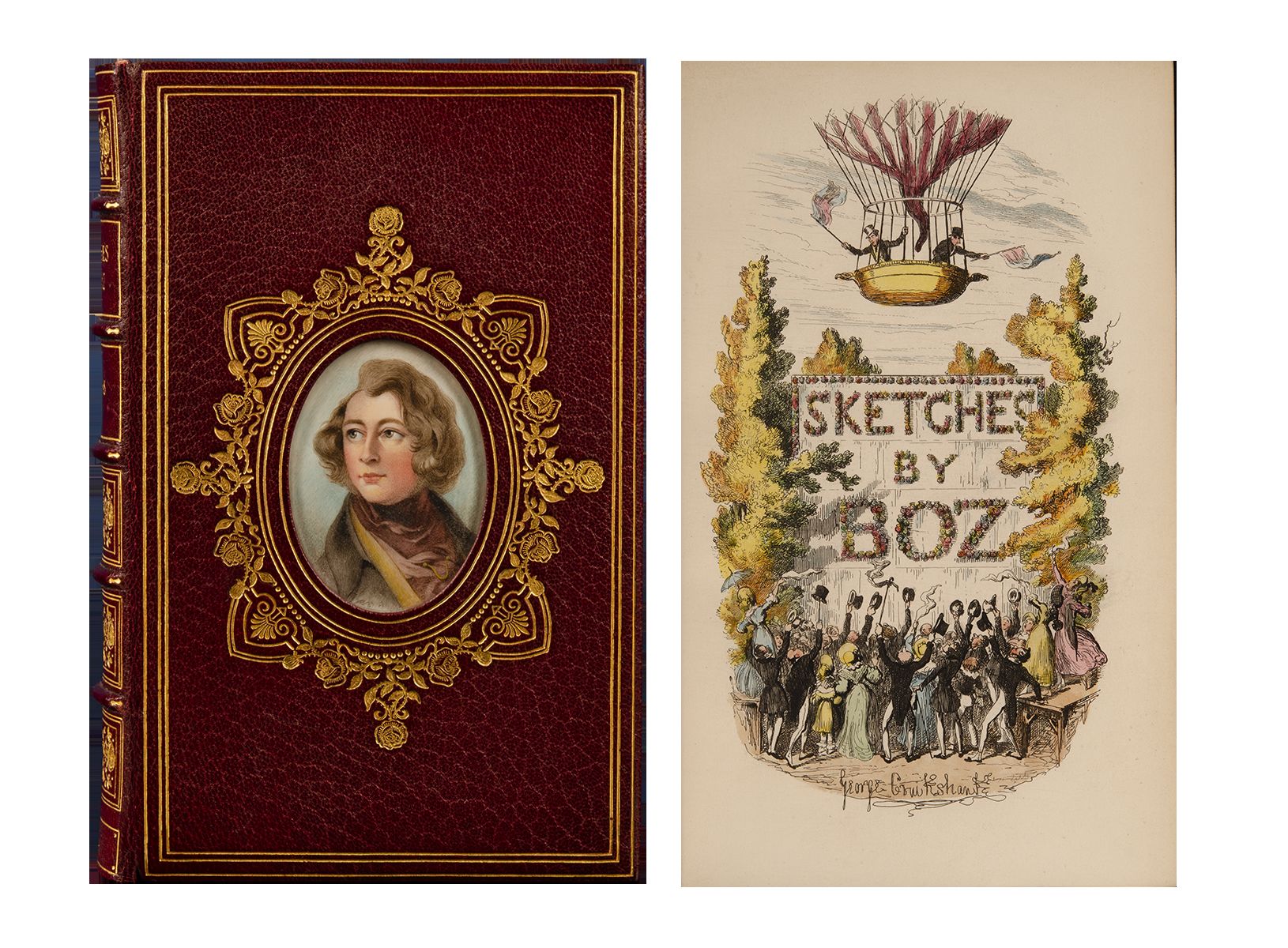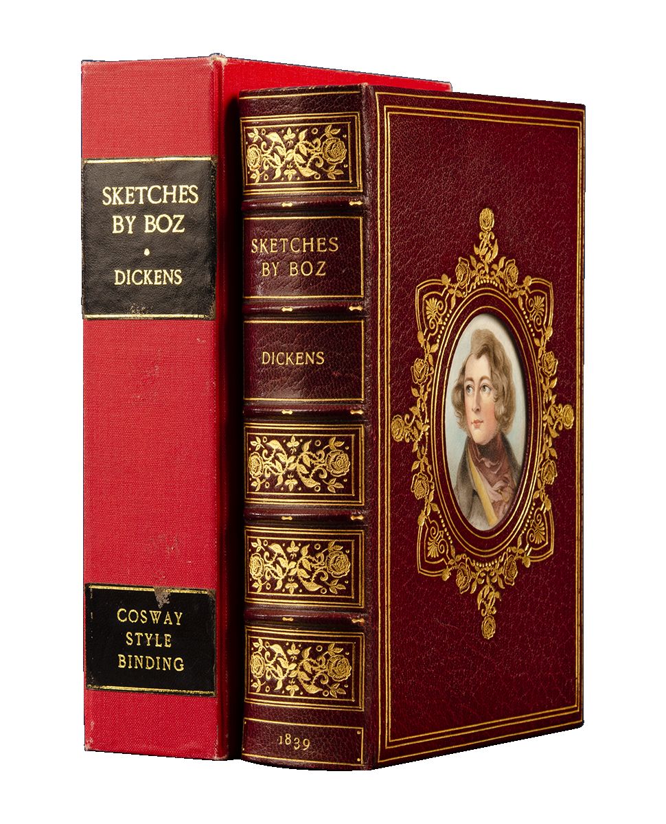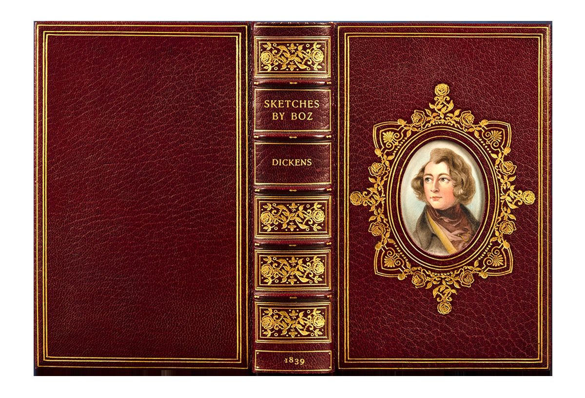 London: Chapman and Hall, 1839. Fine. First book form edition of the first and second series complete in one volume with Chapman and Hall revised texts and re-engraved plates used in their Parts issue. Octavo (8 1/8 x 5 1/4 inches; 208 x 133 mm.). [iii-vii]viii, [1-3]4-526. Forty inserted steel engravings. Extra-illustrated by the insertion of a duplicate suite of the original engravings expertly hand-colored. Bound by Bayntun (Rivière) Bath ca. 1955 (stamp-signed in gilt on front turn-in) in full wine red crushed levant morocco over beveled boards. Covers triple-ruled in gilt, front cover with an elaborate central gilt floral and thistle design surrounding a fine hand-painted portrait miniature (2 3/4 x 2 inches; 70 x 51 mm.) of a young Charles Dickens set under glass. Spine with five raised bands elaborately tooled and lettered in gilt in compartments. Decorative gilt board-edges, wide elaborate gilt turn-ins, marbled liners and endleaves, all edges gilt. Housed in the original felt-lined red cloth slipcase, spine with two black morocco labels lettered in gilt.