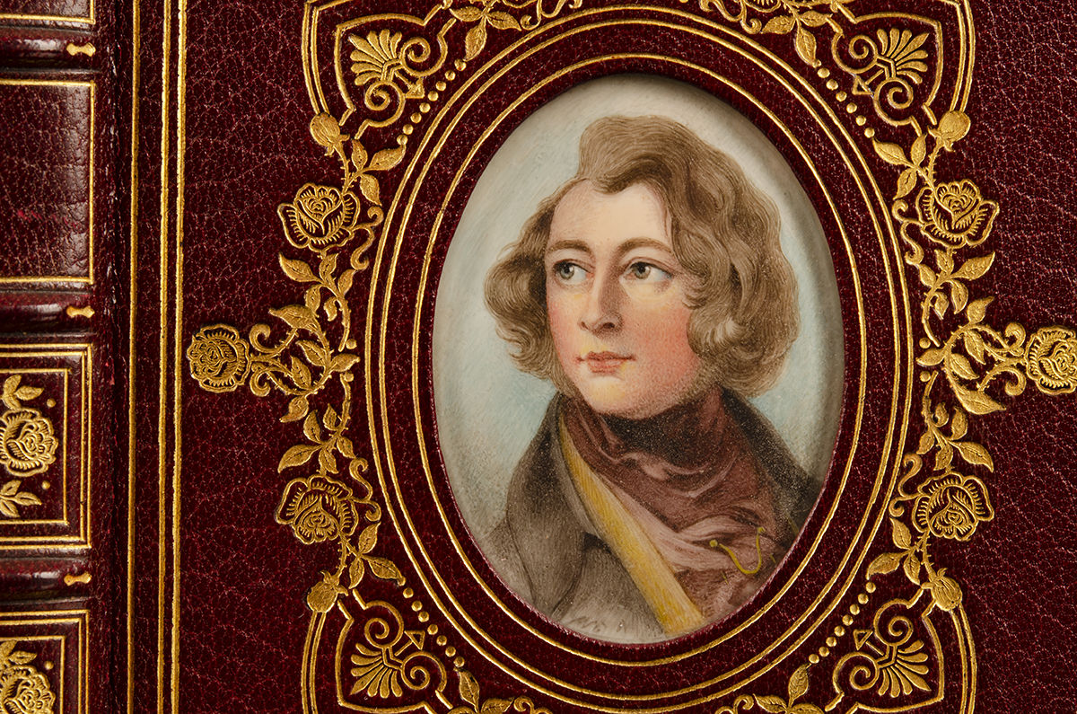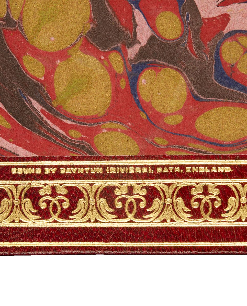 George Bayntun (1873-1940) was the founder of Bayntun Bindery (1894) dedicated to using traditional hand-crafted techniques and high-quality materials. “The Riviere Bindery was one of the most notable and prolific shops in London's West End from about 1840 through 1939” (Princeton). Bath-based Bayntun Bindery acquired the firm in 1939, transforming into the “Bayntun-Riviere bindery,” which is still in existence and family owned. Although named after the English miniaturist Richard Cosway (1742-1821), the desirable “Cosway Binding” with its jewel-like portrait miniature set into a fine binding was first developed at the turn of the century by J.H. Stonehouse, director of London’s Henry Sotheran Booksellers. Their miniatures were painstakingly crafted by the talented painter Miss C. B. Currie (1849-1940). As the style grew in popularity, other publishing houses quickly began to reproduce this technique—each developing their own desirable take on the aesthetic—referred to as “Cosway style.”