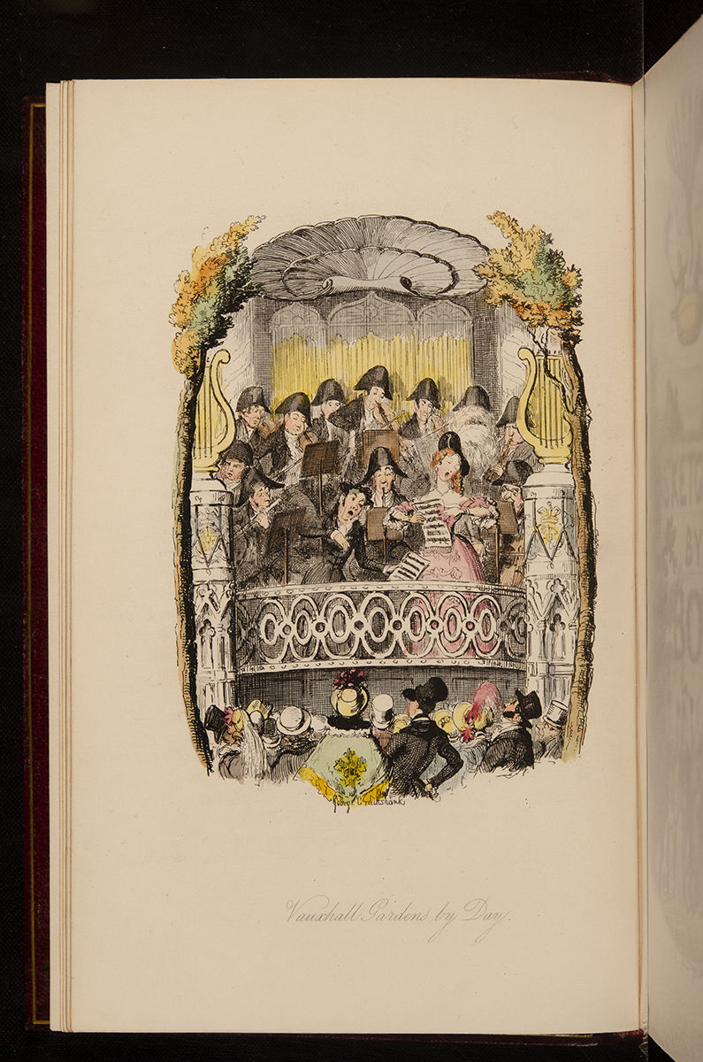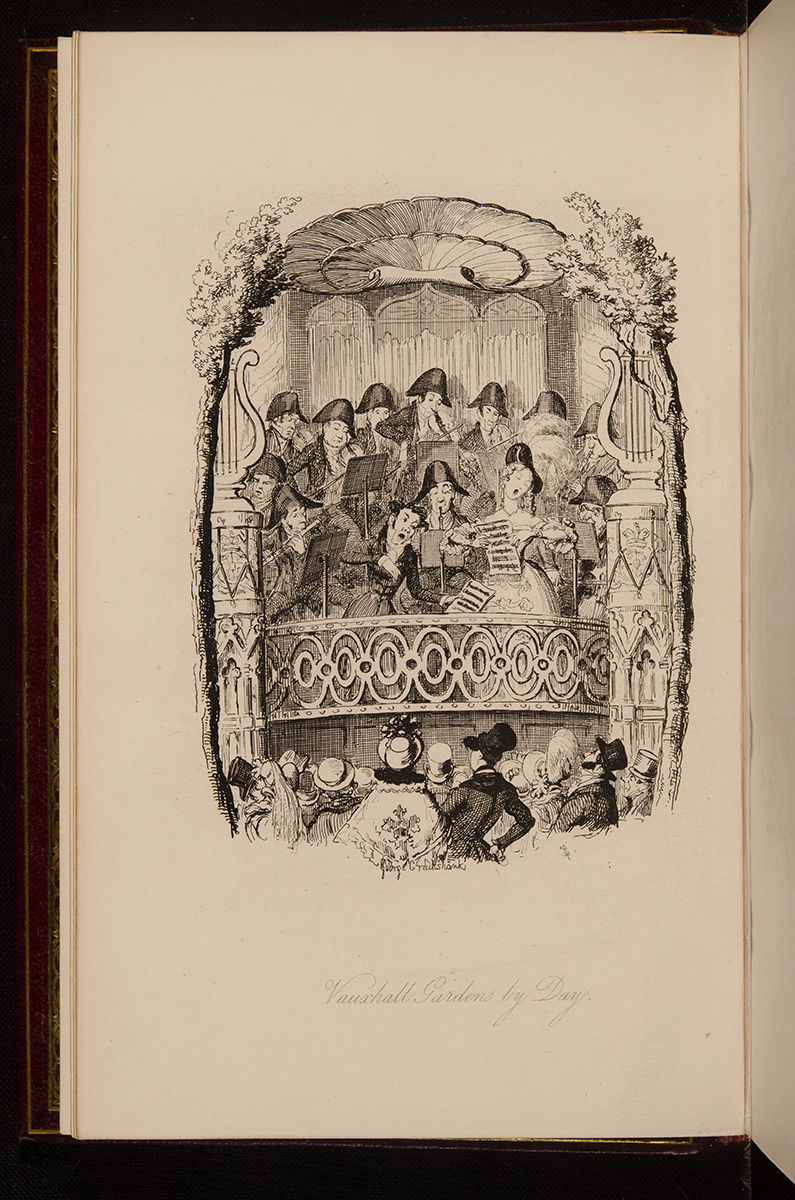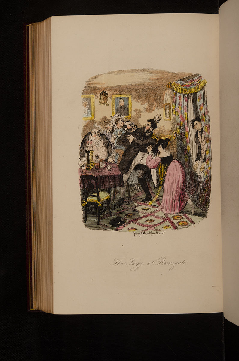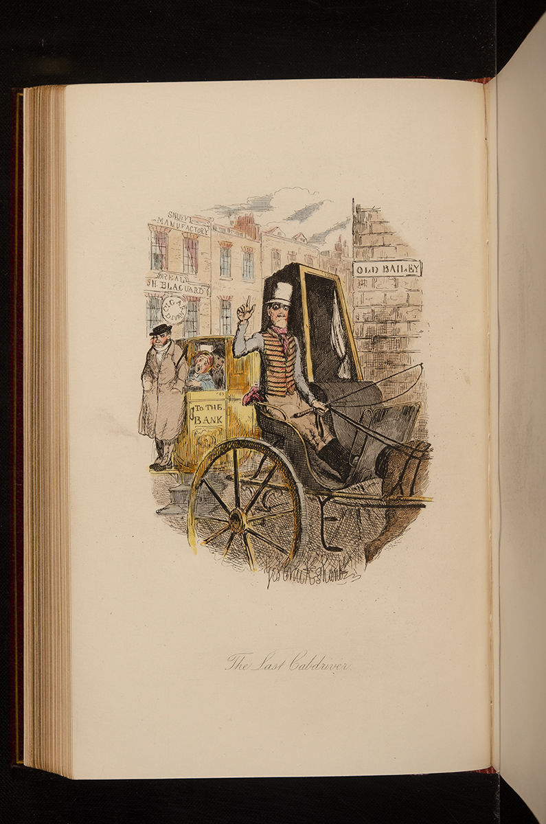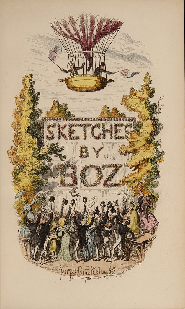 "This collection of short pieces contains the earliest of Dickens's work. It is undoubtedly the most valuable from the antiquarian's point of view, containing references and descriptions of life in the 30's to be found nowhere else" (Hayward). Sketches by Boz contains stories and vignettes about daily life in London that Dickens first published in various newspapers and other periodicals between 1833 and 1836. The book is divided into four sections: "Our Parish", "Scenes", "Characters" and "Tales." A classic example of Dickensian observation. A total of forty plates were drawn and etched by George Cruikshank for this octavo edition, of which twenty-seven are the original designs as they appeared in the First and Second Series of the Sketches published in volume form, 1836-37; these, however, were enlarged in size to match an additional thirteen etchings. "When Chapman and Hall obtained the copyright of Sketches in 1837, they published all of them in twenty monthly parts from November 1837 through June 1839. Cruikshank designed a cover, enlarged the plates (except 'The Free and Easy' which was discarded), and created 13 new illustrations for these monthly parts. In may 1839, Chapman and Hall published these parts complete in one volume with all 40 of Cruikshank's illustrations" (Smith).