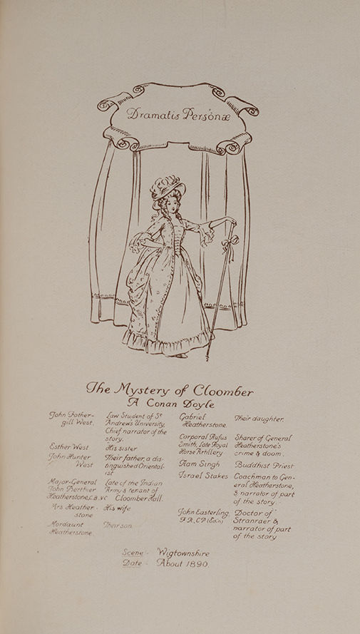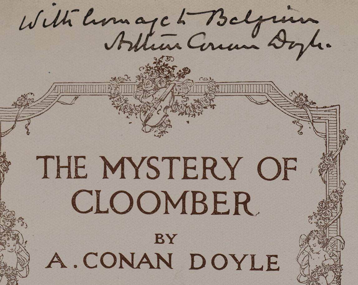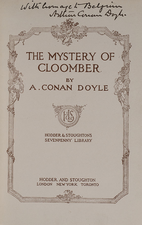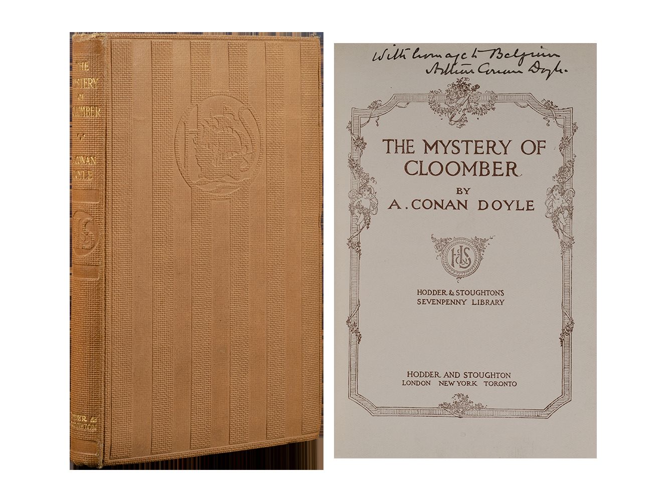 Loosely inserted in a glassine envelope is a newspaper clipping (ca. 1914): "Is the friend as to whom you are in doubt regarding what you should give for a Christmas present a book-lover? Then go to the offices of Canada's Grand Trunk Railway system, 19 Cockspur-street, S.W. There you will be able to choose for him a volume by one of his favourite writers, autographed by the author, and, if you are lucky, with a special inscription in addition. It is a wonderful collection which Miss Elizabeth Banks has got together, and is offering for sale on behalf of The Daily Telegraph Fund. Famous writes, British and American, have sent copies of their works, with their signatures on the title-page…” The Daily Telegraph Belgium Fund was a program to raise money from selling books to support Belgium’s WWI efforts. Here the title page is inscribed by Sir. A. Conan Doyle: "With homage to Belgium."