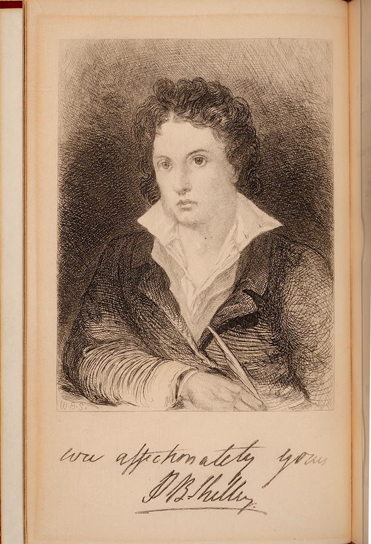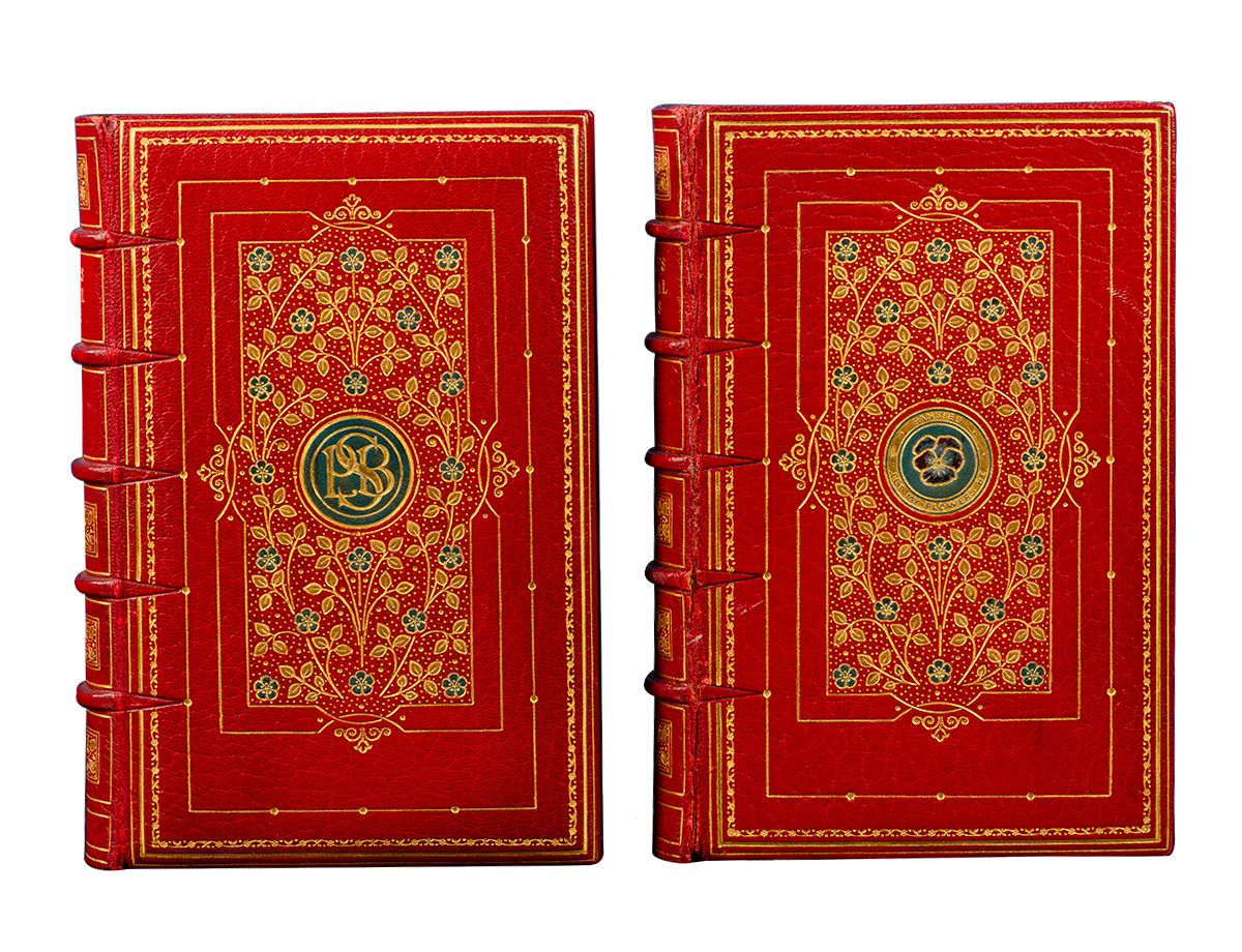 London: Reeves & Turner, 1886. Second edition. Fine. Two octavo volumes (7 1/4 x 4 11/16 inches; 184 x 119 mm.), 572; 580 pp. A spectacular ca. 1920 Cosway-Style binding by Sangorski & Sutcliffe for the J.L. Hudson Company (stamp-signed in gilt on rear turn-in). Full red crushed levant morocco over beveled boards, covers lavishly gilt in the Art Nouveau style, with inlaid green and light brown morocco inlays. The first volume with a central green morocco medallion with Percy Bysshe Shelley's initials in gilt. The second volume with a central green morocco medallion with the phrase "Pansies/Let My Flowers Be" stamped in gilt. Spines with five raised bands elaborately decorated and lettered in gilt in compartments, four of which have onlaid green morocco flowers. Double gilt-ruled board edges and elaborate gilt turn-ins, dark blue watered silk liners and endleaves, all edges gilt and gauffered. The first volume with a front doublure of dark blue crushed levant morocco, multi-ruled in gilt. In the center is a superb gilt framed, hand-painted portrait miniature (3 x 2 3/8 inches; 76 x 60 mm.) of Percy Bysshe Shelley. The miniature is surrounded by a rectangular recessed frame with eight onlaid red morocco flowers and twenty-four onlaid beige morocco leaves. The front and back joints of both volumes have been expertly and almost invisibly repaired. Housed in a custom-made, felt lined half red morocco (with a red felt divider) clamshell case, two spines paneled and lettered in gilt in compartments.