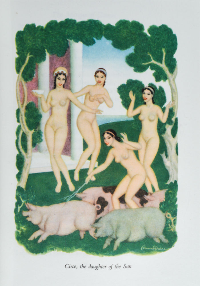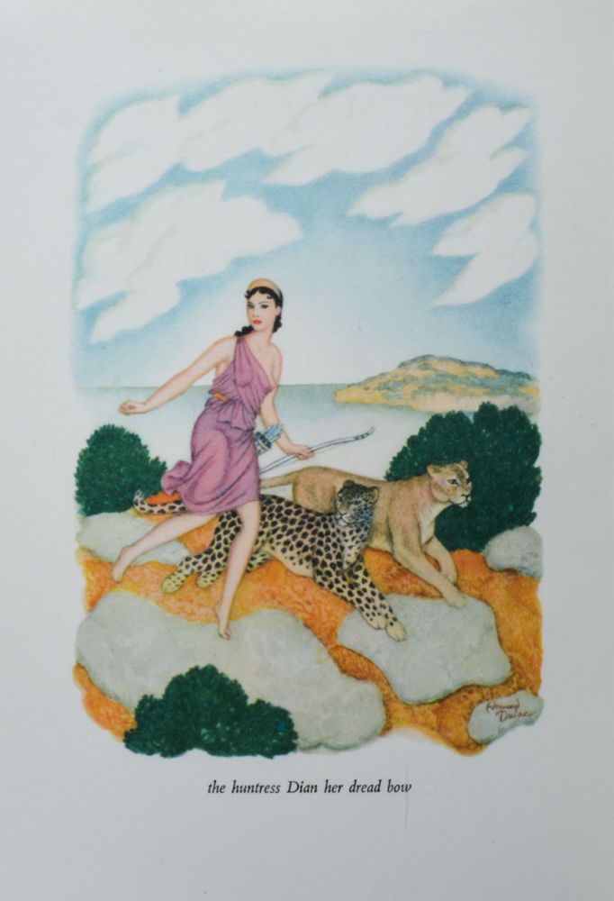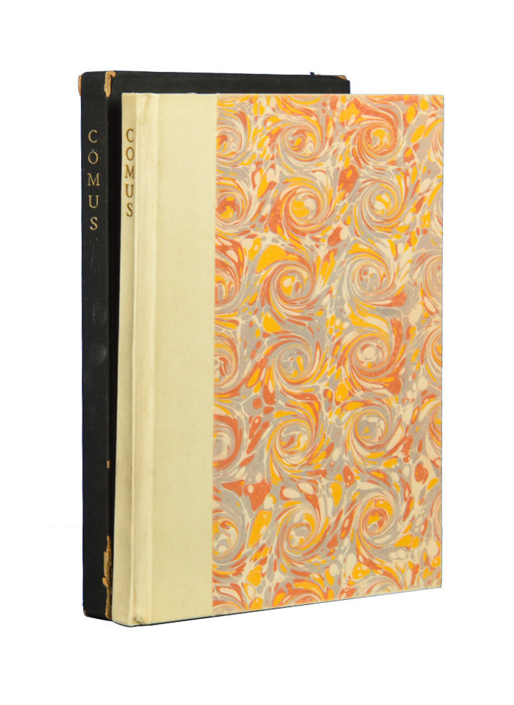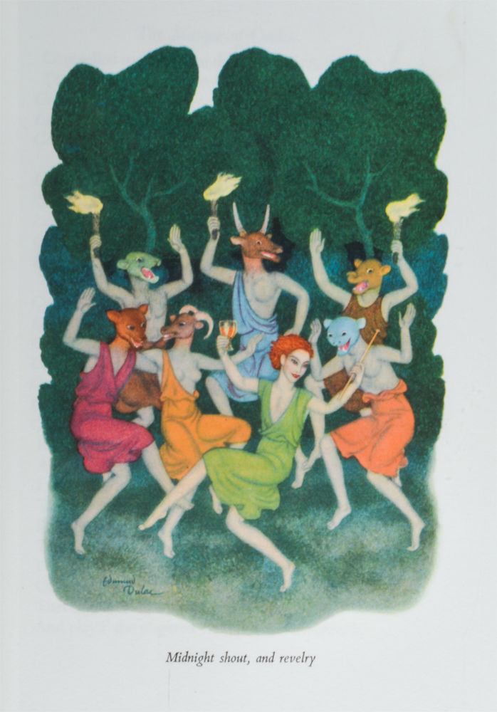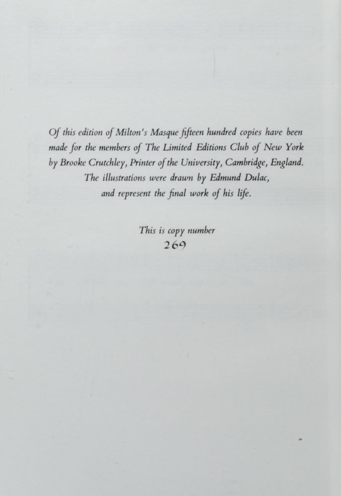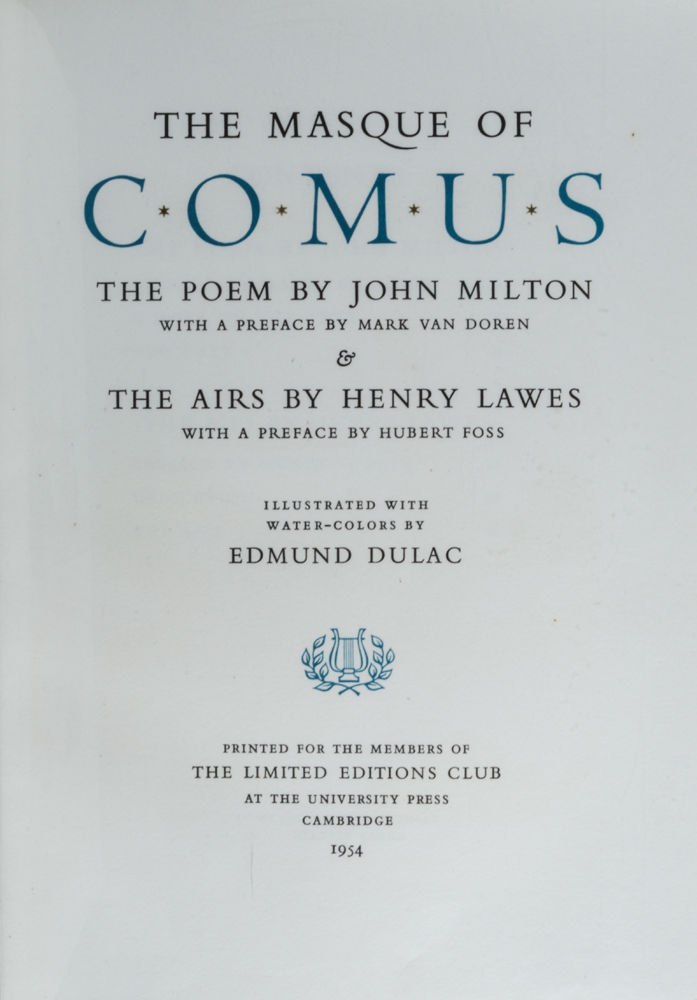 The Masque of Comus was the last book illustrated by Dulac, left incomplete at the time of his death in 1956. After missing out on a few projects due to his heart attack in 1949, Macy offered Dulac a choice of titles, eventually commissioning him to paint 10 pictures for Comus. “His pace was slow. He did not get started until June 1952. By October he had finished two illustrations. By April 24, 1953, he reported to Macy that he had completed 4 more for a total of 6. A few weeks later, on May 30, Helen Beauclerk wrote Macy of Dulac’s death on May 25th. She told Macy that as recently as May 21st, Dulac had been working on his 7th Comus illustration…Comus was the 250th book Macy had made for his Limited Editions Club…Like all his books, Macy’s Comus is a beautiful production” (Hughey).