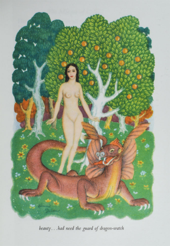 French-born anglophile Edmond Dulac (1882-1953) was one of the most prized artists of the “golden age” of book illustration. A gifted artist, especially in the medium of watercolor, Dulac’s ability to render luxurious detail and subtle emotions is otherworldly. He is best known for his illustrations for books and magazines, although he also designed for the stage and wrote music; in moments of financial insecurity he produced serialized cartoons and became an authority on postage stamp design (White).