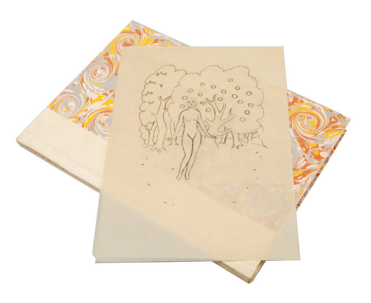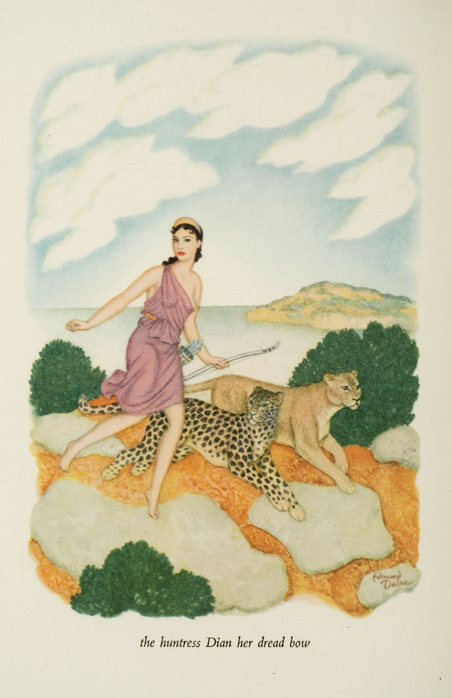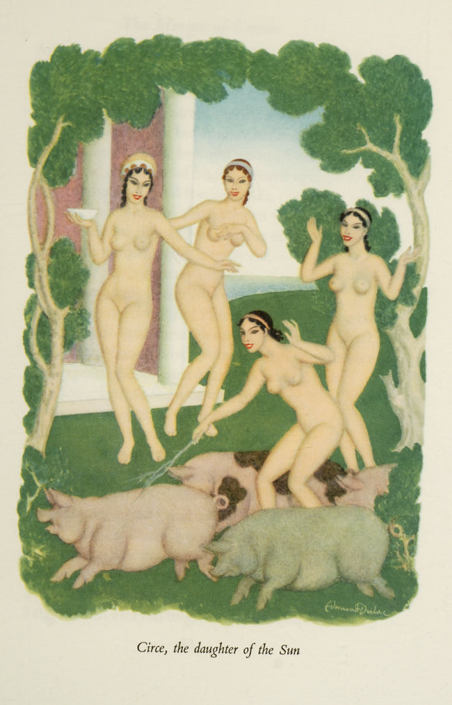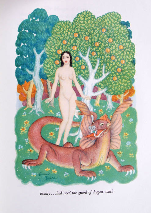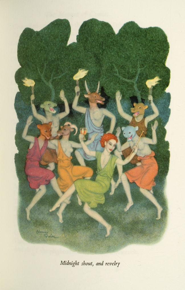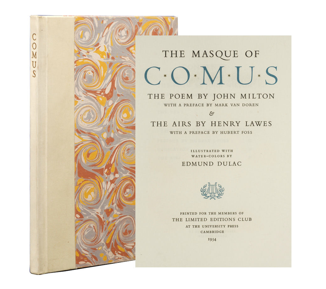 The Masque of Comus was the last book illustrated by Dulac, left incomplete at the time of his death in 1956. After missing out on a few projects due to his heart attack in 1949, Macy offered Dulac a choice of titles, eventually commissioning him to paint 10 pictures for Comus. “His pace was slow. He did not get started until June 1952. By October he had finished two illustrations. By April 24, 1953, he reported to Macy that he had completed 4 more for a total of 6. A few weeks later, on May 30, Helen Beauclerk wrote Macy of Dulac’s death on May 25th. She told Macy that as recently as May 21st, Dulac had been working on his 7th Comus illustration…Comus was the 250th book Macy had made for his Limited Editions Club…Like all his books, Macy’s Comus is a beautiful production” (Hughey). John Milton’s Comus (A Masque Presented at Ludlow Castle, 1634) was a type of courtly theatrical performance, that saw its heroine use her power of mind and virtue to debate Comus, the god of revery, and resist temptation.