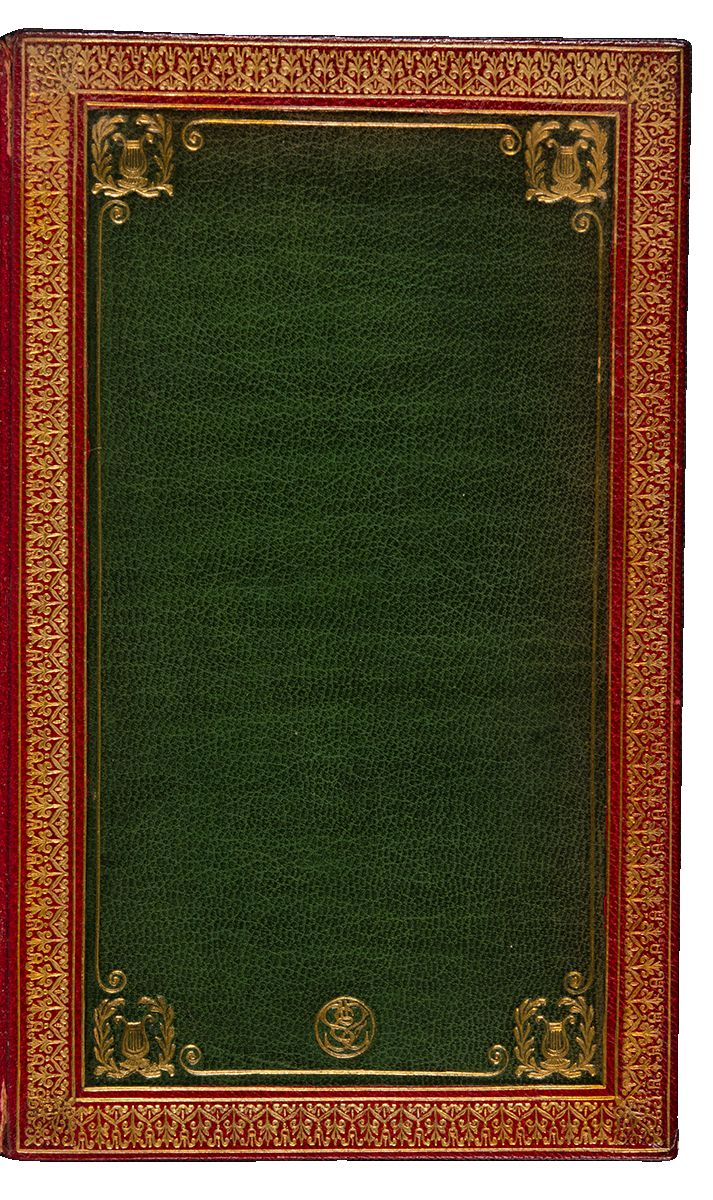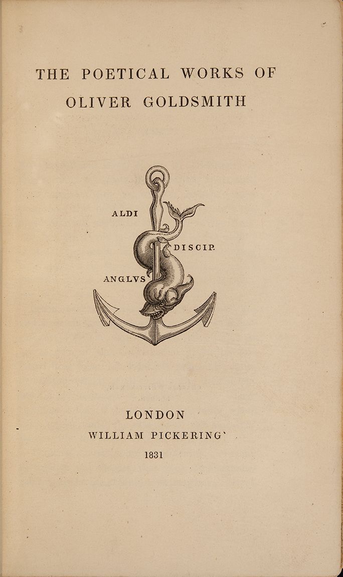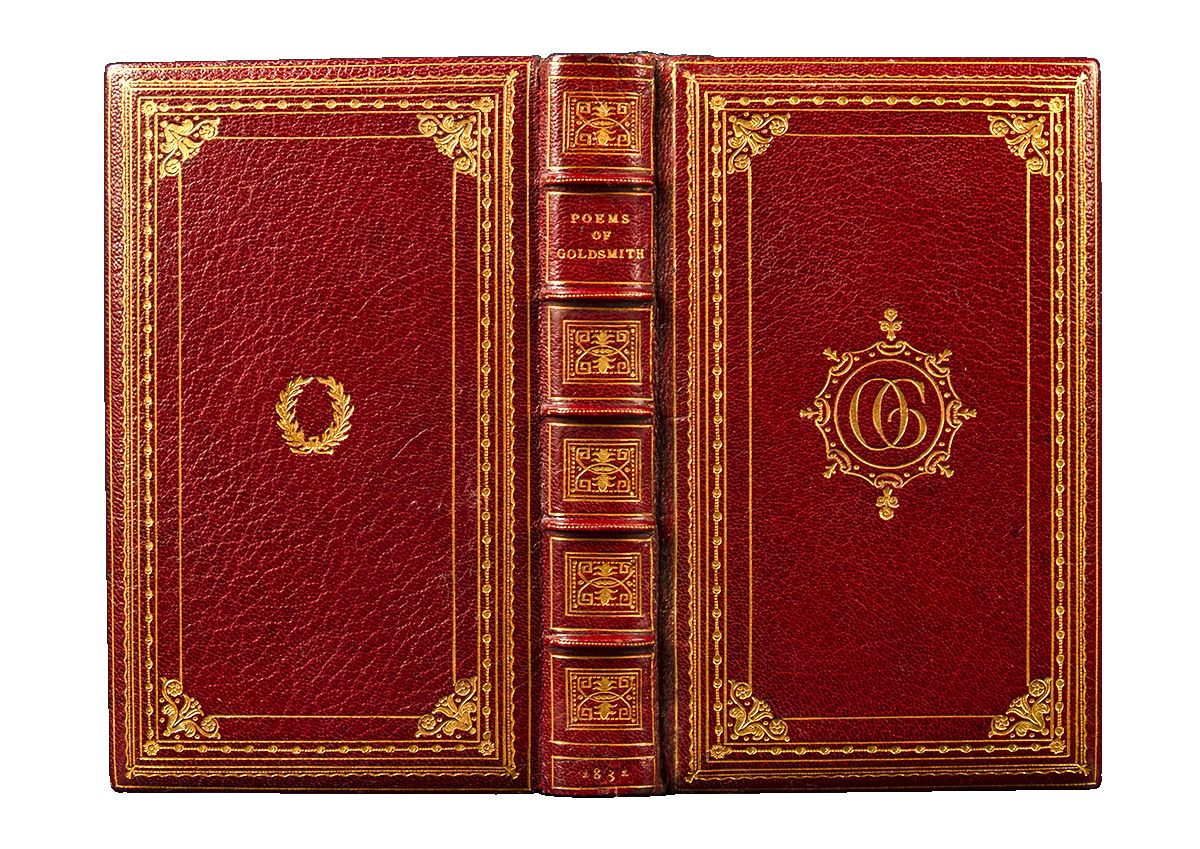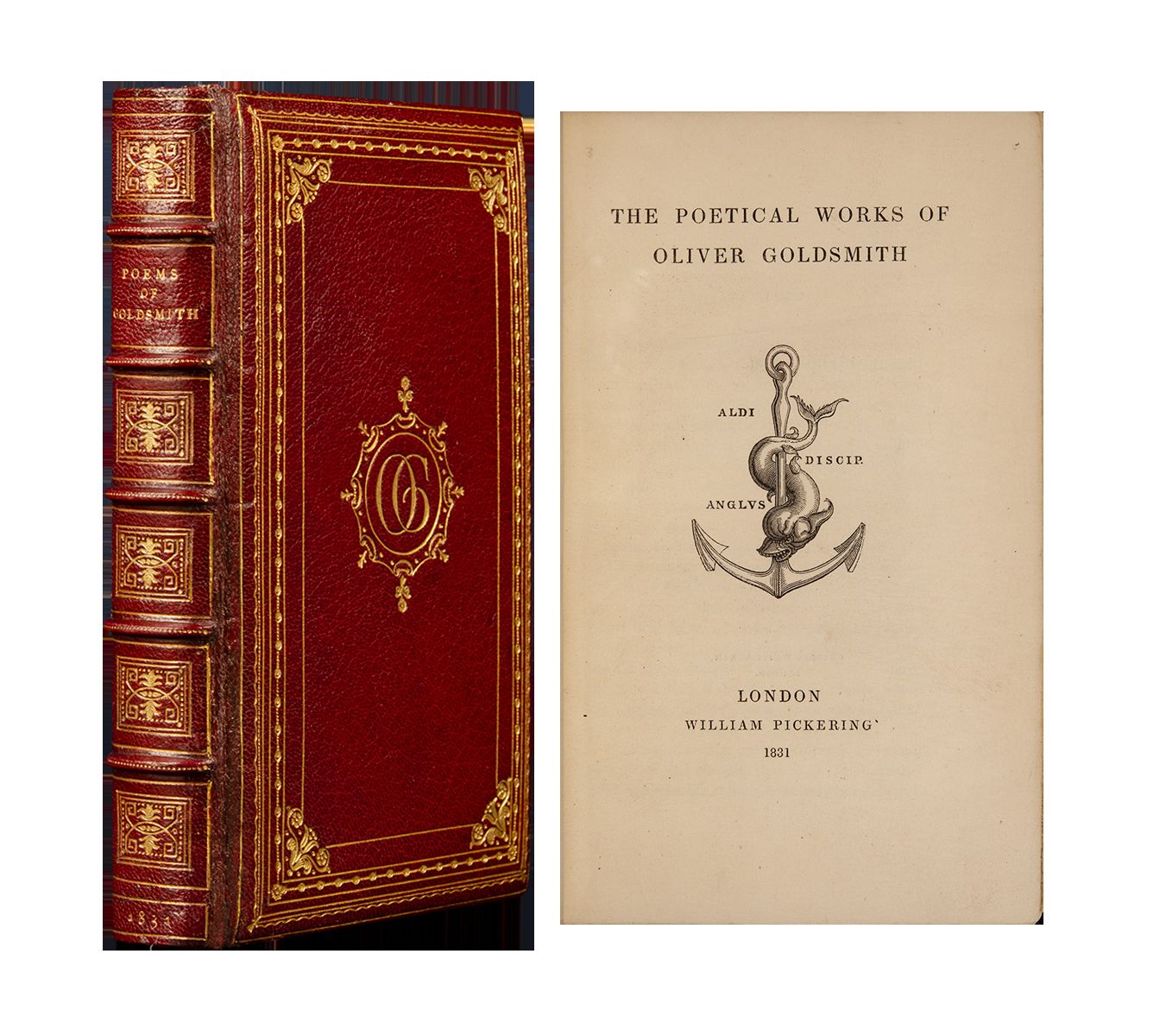 London: William Pickering, 1831. The Aldine Edition. Near Fine. Small octavo (6 1/2 x 4 inches; 166 x 101 mm.). [i]-clxxxii [Life and Anecdotes of Goldsmith], [1]-156 pp, with engraved portrait frontispiece. Bound c. 1930 by Sangorski and Sutcliffe for Chas. J. Sawyer Ltd., stamp-signed in gilt on front turn-in, with the S&S monogram stamped in gilt on rear doublure. Full dark red crushed levant morocco over beveled boards with elaborate gilt-rolled borders and gilt-tooled frame. Front cover with Oliver Goldsmith's initials within a decorative thistle tool frame. Rear cover with central gilt wreath. Spine with five raised bands elaborately decorated and lettered in gilt in compartments. Gilt-ruled board edges, broad, gilt-rolled dentelles, green silk end-leaves, top edge gilt. Gilt-tooled green calf doublures with decorative gilt corner-pieces. Front doublure with a fine gilt-framed oval portrait miniature watercolor under glass of Oliver Goldsmith. Front joint expertly and almost invisibly repaired. A Near Fine example of an S&S Cosway-Style binding.