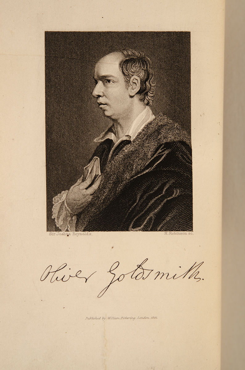 The Anglo-Irish author Oliver Goldsmith (1730-1774), is probably best known for his popular novel Vicar of Wakefield (1766). Here however readers encounter a different side to his craft. Part of The Aldine Poet Series—a twenty-year long and fifty-three volume project of new editions of classic British poets from Chaucer through to the nineteenth century—this book highlights Goldsmith’s poetry. Apart from poetry and novels, Goldsmith wrote plays and legend has it, the children's story The History of Little Goody Two-Shoes. Kept busy by writing quickly and voluminously for Grub Street, the center of London’s disreputable part of the literary world, Goldsmith nevertheless also found time to hone novels such as The Vicar of Wakefield, poems such as The Deserted Village, and plays such as She Stoops to Conquer. Contemporaries celebrated Goldsmith’s ability to craft deceptively complex characters, most notably in the case of Charles Primrose, the vicar from The Vicar of Wakefield. Goldsmith counted Samuel Johnson among his closest friends, and Johnson wrote the epitaph that appears on Goldsmith’s memorial in Westminster Abbey’s famous Poets’ Corner: “To the memory of Oliver Goldsmith, poet, philosopher and historian, by whom scarcely any style of writing was left untouched and no one touched unadorned, whether to move to laughter or tears; a powerful, yet lenient master of the affections, in genius sublime, vivid, and versatile, in expression, noble, brilliant, and delicate, is cherished in this monument by the love of his companions, the fidelity of his friends, and the admiration of his readers.”
