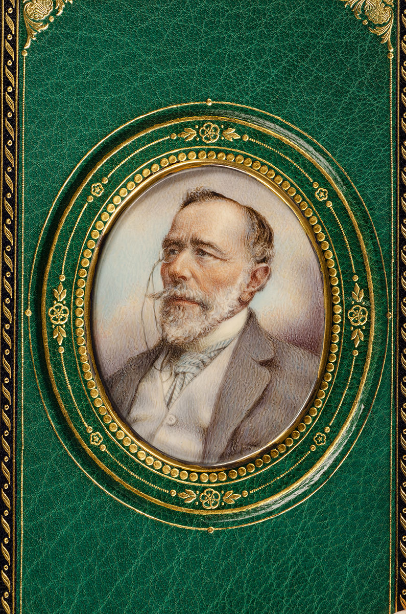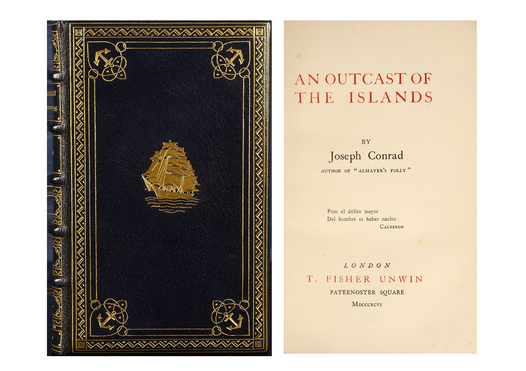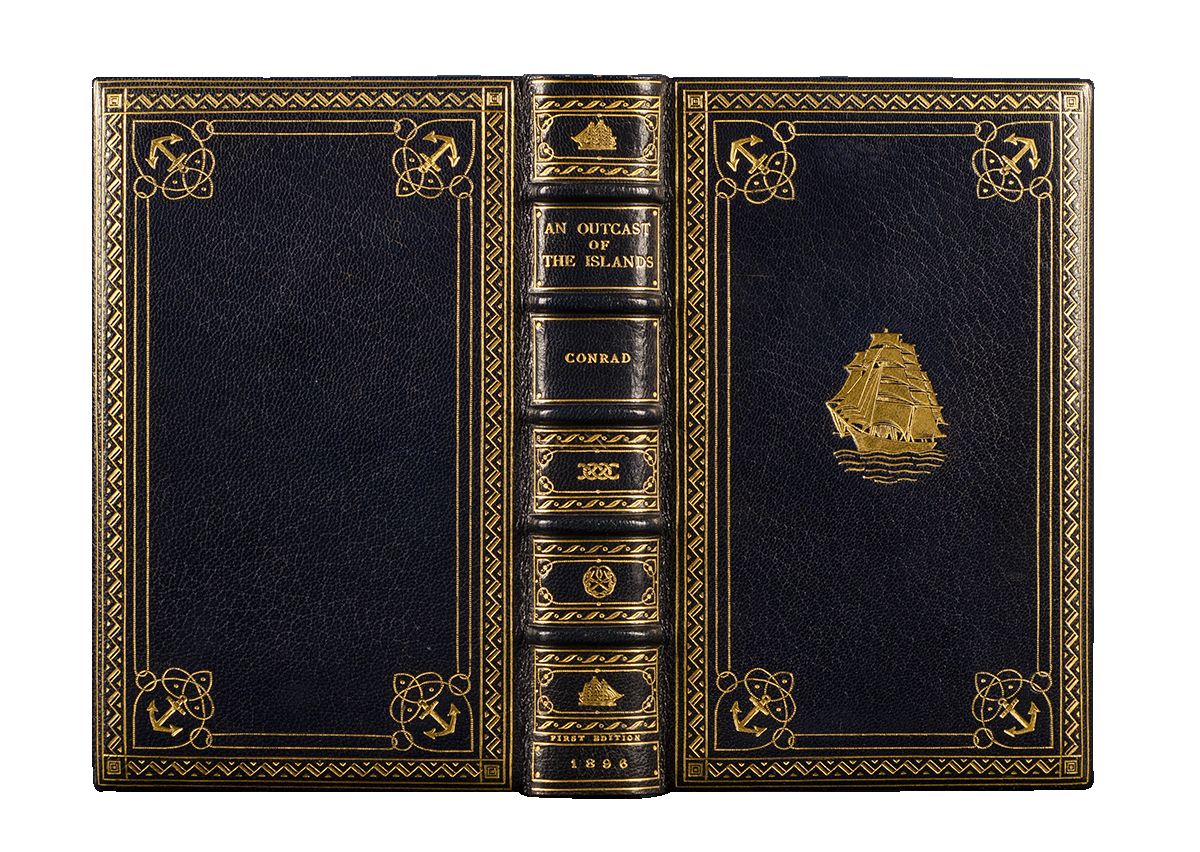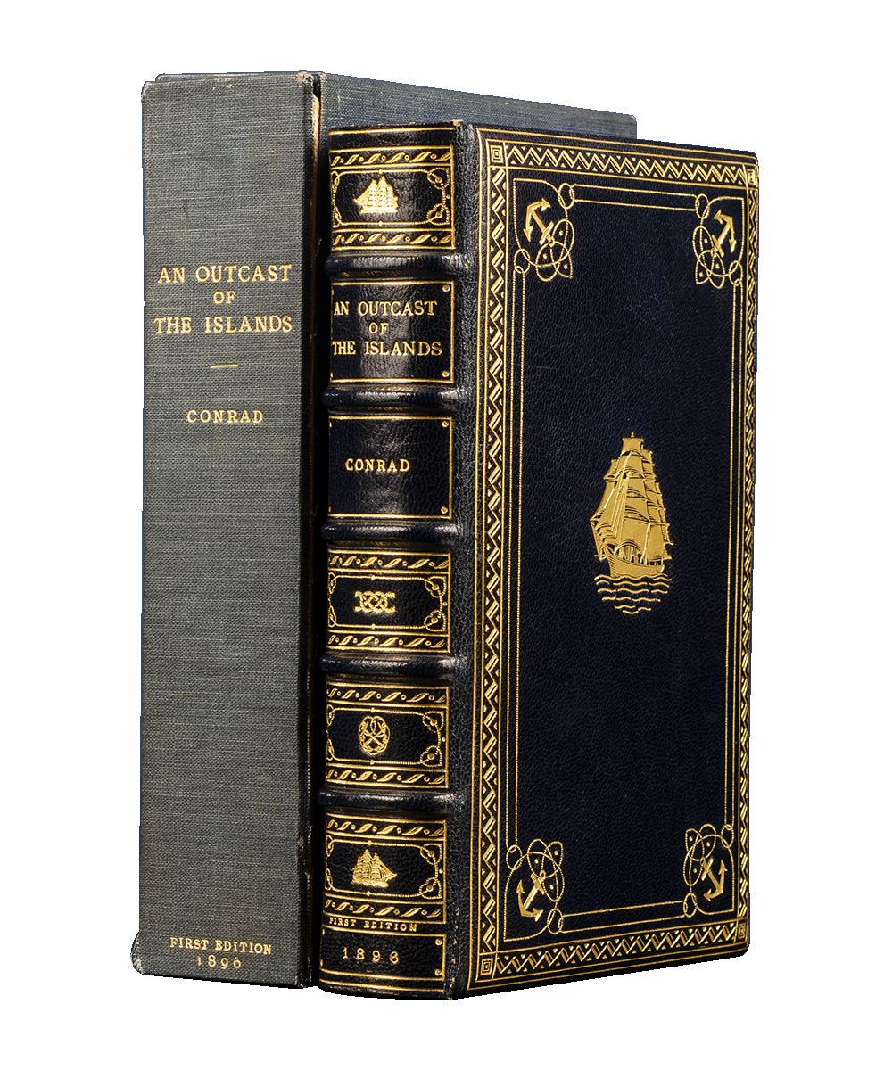 London: T. Fisher Unwin, 1896. First edition. Fine. Octavo (7 3/4 x 4 7/8 inches; 197 x 124 mm.). [ii, ads], [vi], 391, [1] pp. First issue, with "this" for "their" on p. 26, line 31; "Absolution" for "ablution" p. 110, line 12; "9" missing on p. 129; and "hate" for "fate" on p. 356, line 26. Title-page in red and black. Bound ca, 1940 by Sangorski & Sutcliffe, stamp-signed in gilt on rear turn-in. A Fine copy, bound in full dark blue crushed levant morocco over beveled boards, covers elaborately bordered in gilt with decorative anchor corner-pieces, front cover with a sailing ship in gilt. Spine with five raised bands, decoratively tooled and lettered in gilt in compartments, gilt-ruled board-edges and turn-ins, blue watered silk endleaves. Inside front cover with a large rectangular panel of green morocco with a superb and exquisite oval portrait miniature of Joseph Conrad (3 x 2 3/8 inches) under glass and surrounded by a gilt metal frame. Original green cloth covers and spine bound in at end. Housed in the original fleece-lined blue cloth clamshell case, spine lettered in gilt. Front hinge of clamshell case neatly repaired, rear hinge starting.