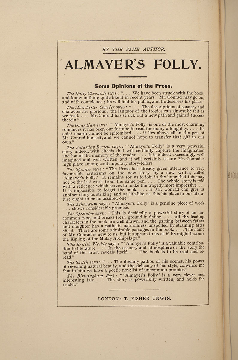 Joseph Conrad (1857-1924) was a Polish-British writer whose reputation as one of the greatest English-language novelists holds true today. Conrad’s prose is infused with a unique sensibility blurring the boundaries between modernism and realism; he was never afraid to depict the darkness of the humanity. In much of his fiction Conrad drew from his experiences as a sailor, such as in his second novel An Outcast of the Islands (1896), which recounts the downfall of Peter Willems. As in his more famous Heart of Darkness, Conrad relishes in this jungle setting.