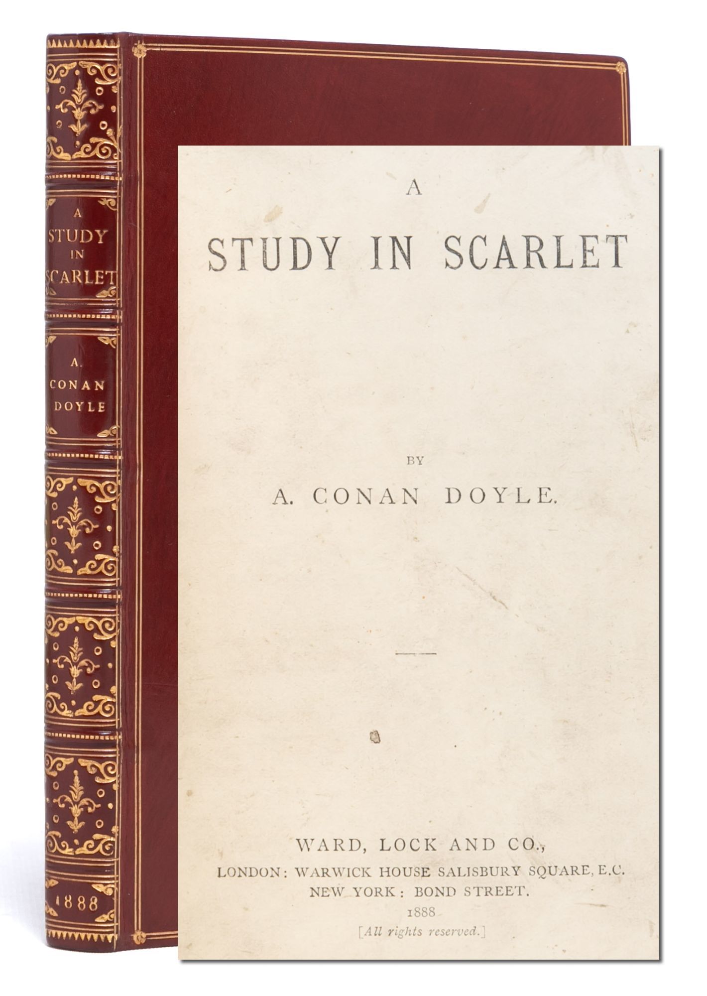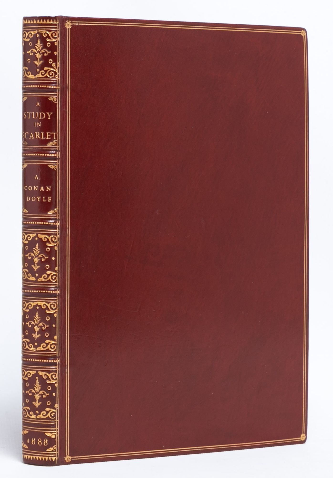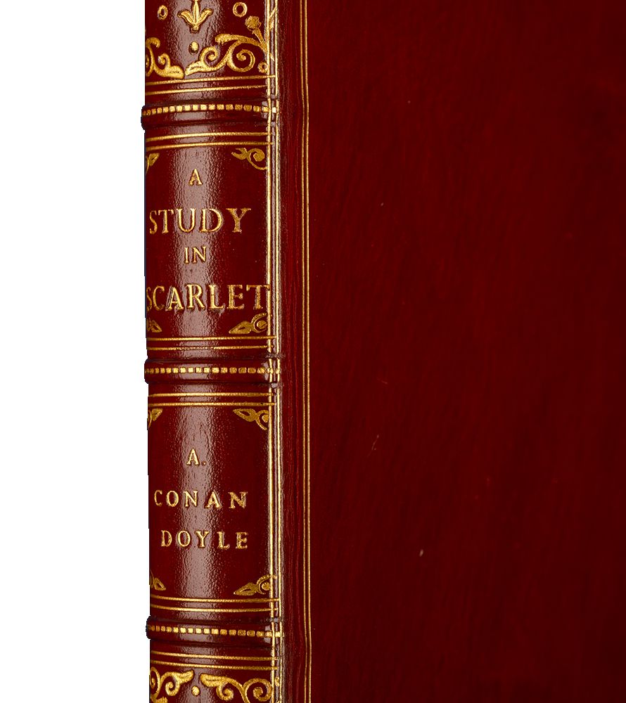 London: Ward, Lock and Co, 1888. First edition, second printing. First edition in book form of the first Sherlock Holmes story (preceded only by the story’s appearance in Beeton’s Christmas Annual in 1887). Second impression with mis-spelling “youuger” for younger in the second paragraph of the publisher’s preface. A fine copy. Octavo (7 1/4 x 4 3/4 inches; 185 x 121 mm.). [iii] title; [iv] blank; [v] publisher’s preface (with paragraph 2, line 3: youuger); [vi] blank; [vii] contents; [viii] blank [1]- [169]; [170] blank; advertisements; [171- 182] pp. With six line drawings within the text by Charles Doyle, the author’s father, on pp. 32, 57, 64, 98, 124, 158. The title-page has been very neatly repaired at the edges and pp. 75-78 with very slight fore marginal loss not affecting text. Bound without the leaf of advertisements preceding the title-page and the last leaf of advertisements at the end (pp. 183/4). Handsomely rebound in late nineteenth century style full red polished calf, covers double-ruled in gilt, spine with five raised bands decoratively tooled and lettered in gilt in compartments, gilt decorated board edges and turn-ins, cockerel endpapers, all edges uncut.