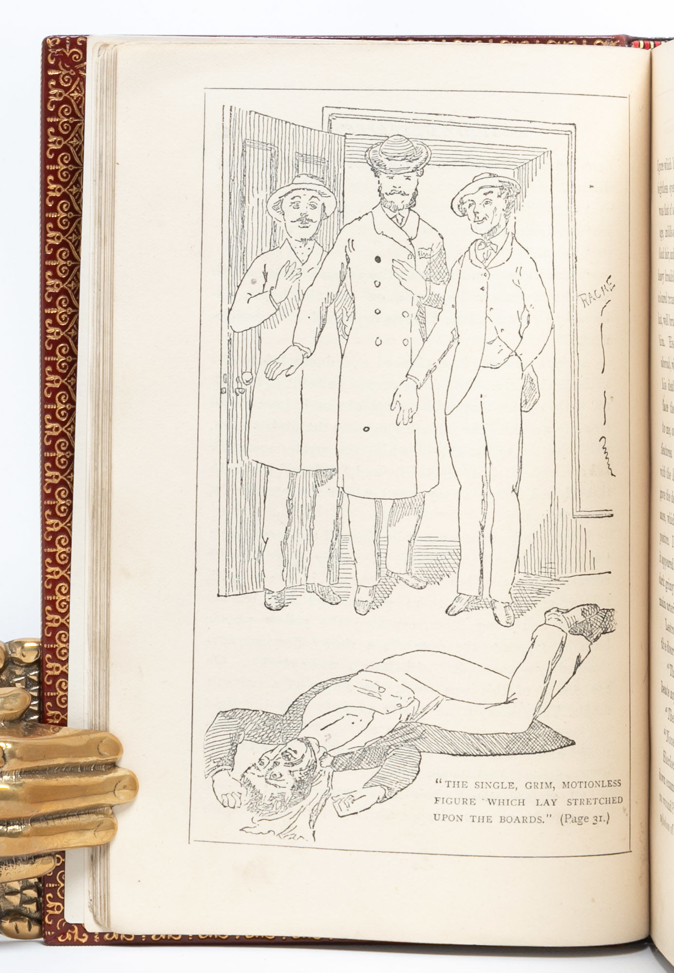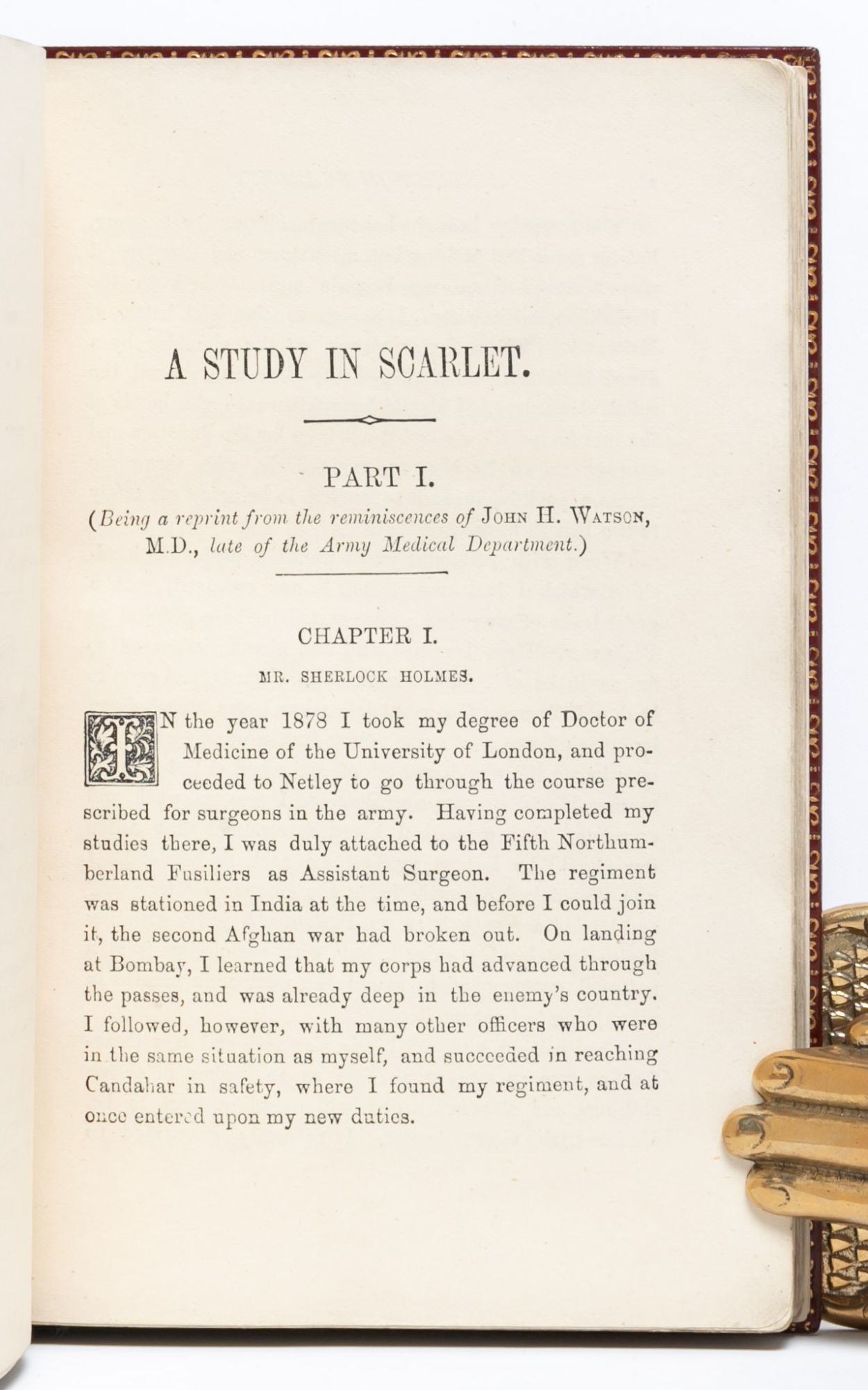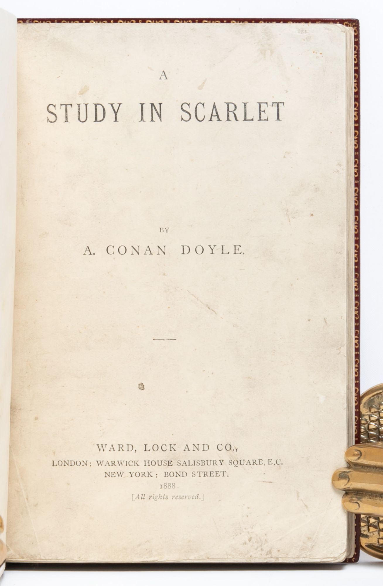 London: Ward, Lock and Co, 1888. First edition, second printing. First edition in book form of the first Sherlock Holmes story (preceded only by the story’s appearance in Beeton’s Christmas Annual in 1887). Second impression with mis-spelling “youuger” for younger in the second paragraph of the publisher’s preface. A fine copy. Octavo (7 1/4 x 4 3/4 inches; 185 x 121 mm.). [iii] title; [iv] blank; [v] publisher’s preface (with paragraph 2, line 3: youuger); [vi] blank; [vii] contents; [viii] blank [1]- [169]; [170] blank; advertisements; [171- 182] pp. With six line drawings within the text by Charles Doyle, the author’s father, on pp. 32, 57, 64, 98, 124, 158. The title-page has been very neatly repaired at the edges and pp. 75-78 with very slight fore marginal loss not affecting text. Bound without the leaf of advertisements preceding the title-page and the last leaf of advertisements at the end (pp. 183/4). Handsomely rebound in late nineteenth century style full red polished calf, covers double-ruled in gilt, spine with five raised bands decoratively tooled and lettered in gilt in compartments, gilt decorated board edges and turn-ins, cockerel endpapers, all edges uncut.
