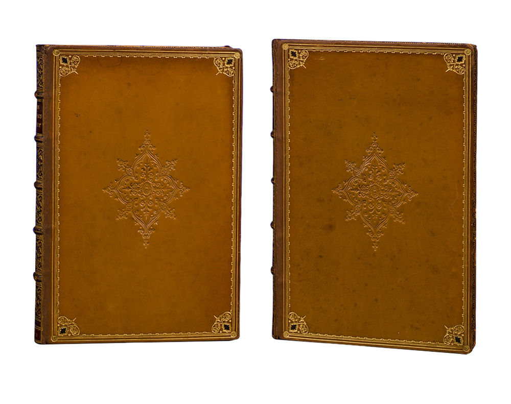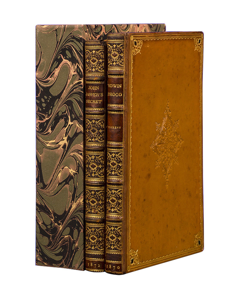 First English edition in book form. Octavo (7 7/8 x 5 1/4 inches; 201 x 133 mm.). [iv], 252 pp. Twenty wood-engraved plates. Uniformly bound ca. 1920 by Zaehnsdorf for the Gardenside Bookshop, Boston (stamp-signed in black on verso of front free- endpapers). Full polished tan calf, covers decoratively bordered in gilt. Gilt corner pieces with small floral onlays in black morocco, decorative center pieces stamped in blind. Spines with five raised band decoratively tooled in gilt in compartments with small brown morocco floral onlays. Edwin Drood with two brown morocco labels lettered in gilt, John Jasper's Secret with one brown morocco label lettered in gilt. Gilt ruled board edges, decorative turn-ins, marbled end-papers, top edge gilt. Joints a little rubbed but quite sound. A very attractive example housed together in a felt-lined fitted marbled board slipcase.