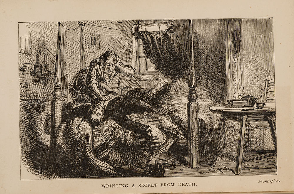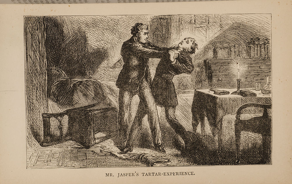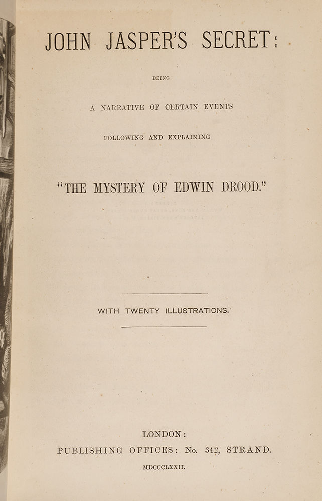 [Edwin Drood], Morford, Henry, attributed to]. John Jasper’s Secret: Being a Narrative of Certain Events Following and Explaining “The Mystery of Edwin Drood.” With Twenty Illustrations. London: Publishing Offices, 1872.