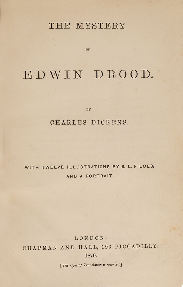 Chapman and Hall, 1870. First edition. First edition in book form. Octavo (8 3/16 x 5 1/4 inches; 208 x 133 mm.). vii, [1, “Illustrations”], 190 pp. Frontispiece portrait of Dickens (“Engraved by J.H. Baker, from a Photograph taken in 1868, by Mason & Co.”), wood-engraved vignette title by J. Brown, and twelve wood-engraved plates, two by the firm of Dalziel Brothers, ten by Charles Roberts, all after Samuel Luke Fildes. Occasional marginal staining, wood-engraved plate facing p. 98 with small (1/4 inch) marginal tear. A very good copy.