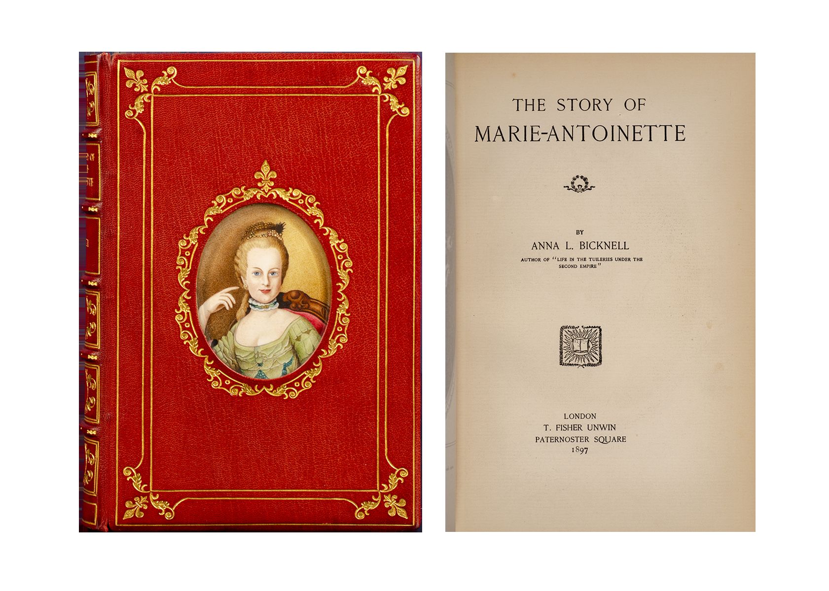 London: T. Fisher Unwin, 1897. First edition. Fine. Octavo (8 3/8 x 5 3/4 inches; 212 x 146 mm.). [i]-xiv, [2], 334, [2, blank] pp, twenty-seven photogravure plates. Bound ca 1960 in full red crushed levant morocco, covers decoratively bordered in gilt, front cover with a central gilt design surrounding a fine oval hand-painted portrait miniature of Marie-Antoinette (3 1/4 x 2 1/2 inches; 82 x 63 mm.), set under glass. Spine with five raised bands elaborately tooled and lettered in gilt in compartments. Double-ruled gilt board edges and wide turn-ins, red silk liners and endleaves, all edges gilt. A Fine copy overall. Housed in the original fleece-lined, red cloth clamshell case, spine lettered in gilt. The binding is unsigned but is very similar to the Cosway-Style bindings that were done by Sangorski & Sutcliffe for Asprey's.