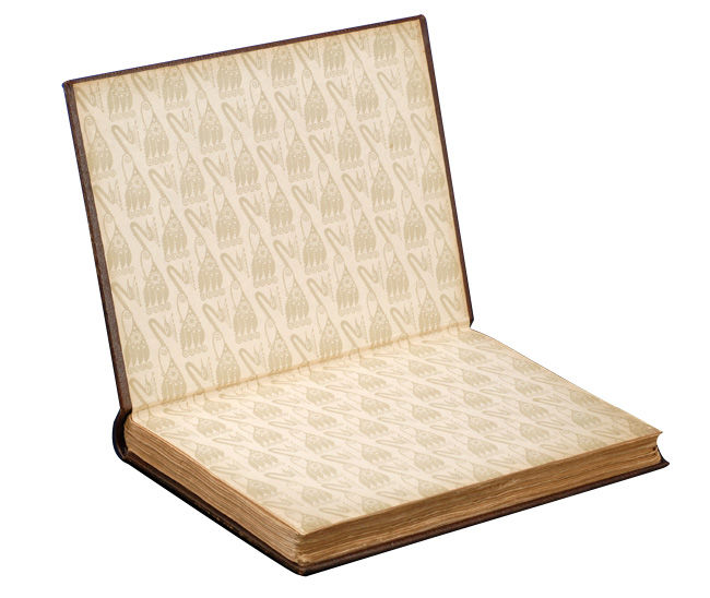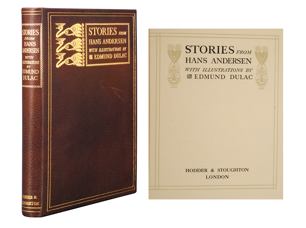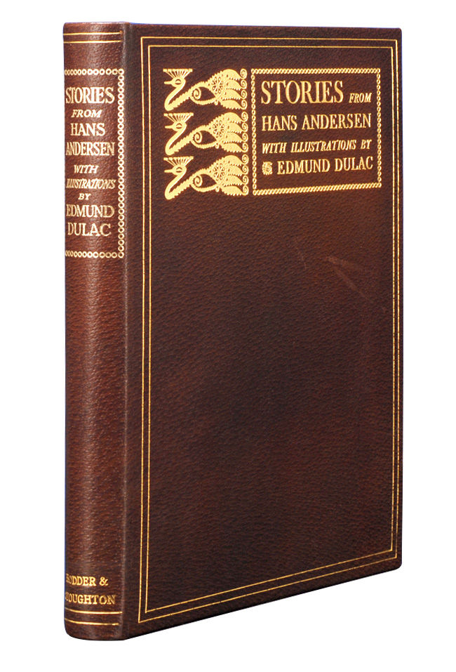 During his lifetime, Hans Christian Andersen, whose fairy tales have become a classic, was second only to Charles Dickens as the most popular author in the Western world. Here, his famed narratives get the artistic treatment of Dulac, who brings characters to life for the reader. A stunning copy, unique, and arguably the finest copy of the Deluxe Edition. The binding and endpapers do not conform to Hughey's description, and appear to be unique to this handsome copy. As she notes, the pigskin binding, ("brandy colour," not dark chocolate-brown, as here), should only have two thin gilt rules as frame, gilt lettering, date 1911 on spine, and white endpapers, not illustrated as here and in the trade edition. Hughey, who had only seen two copies of the Edition De Luxe, William Randolph Hearst's and another viewed at a Washington book fair, suggested that this copy was “done close to original printing time, November 1911. There were a lot of oddball copies done then...The title was sold very quickly - all sold by December 1911.” The endpapers here were available at the time of the trade edition, and it is possible that someone or the firm did this for copy #20. Hughey also said that this “copy's binding design on front cover is clearly an adaptation of the endpapers but I do not think by Dulac as it does not appear in any of his other editions of Hans Andersen's work. Someone may not have liked the plain cover..." This copy is better for the personalization.