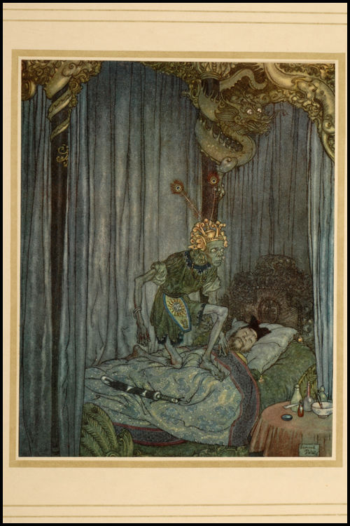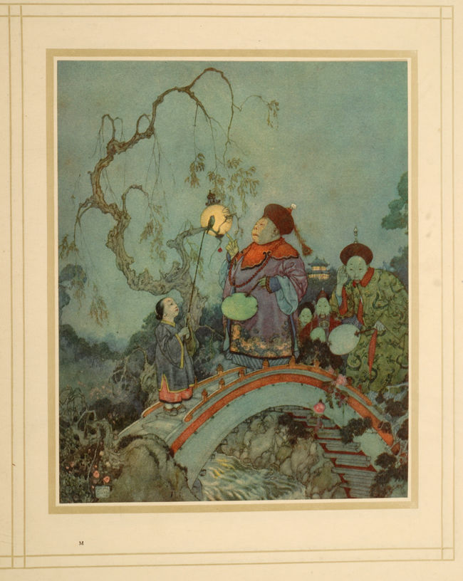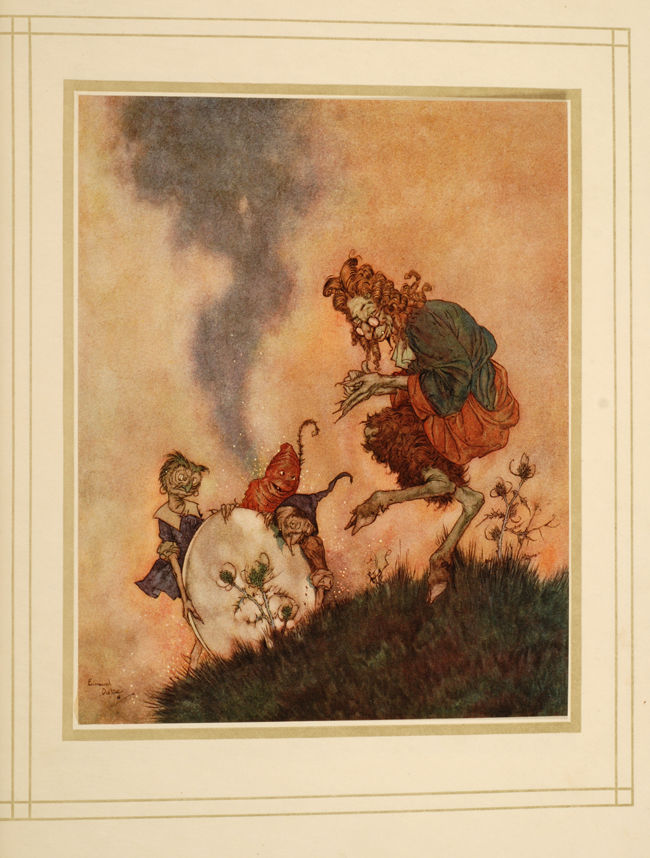 French-born anglophile Edmond Dulac (1882-1953) was one of the most prized artists of the “golden age” of book illustration. A gifted artist, especially in the medium of watercolor, Dulac’s ability to render luxurious detail and subtle emotions is otherworldly. He is best known for his illustrations for books and magazines, although he also designed for the stage and wrote music; in moments of financial insecurity he produced serialized cartoons and became an authority on postage stamp design (White).