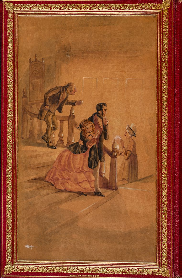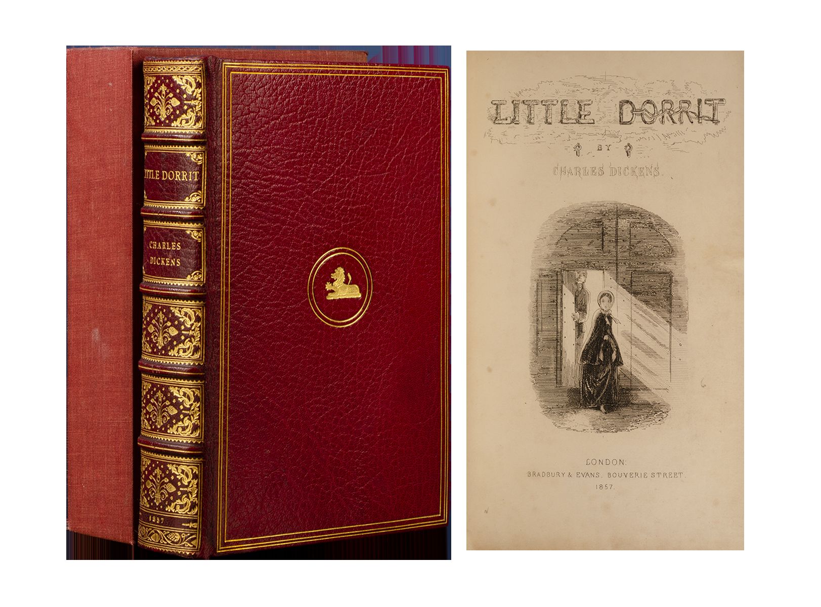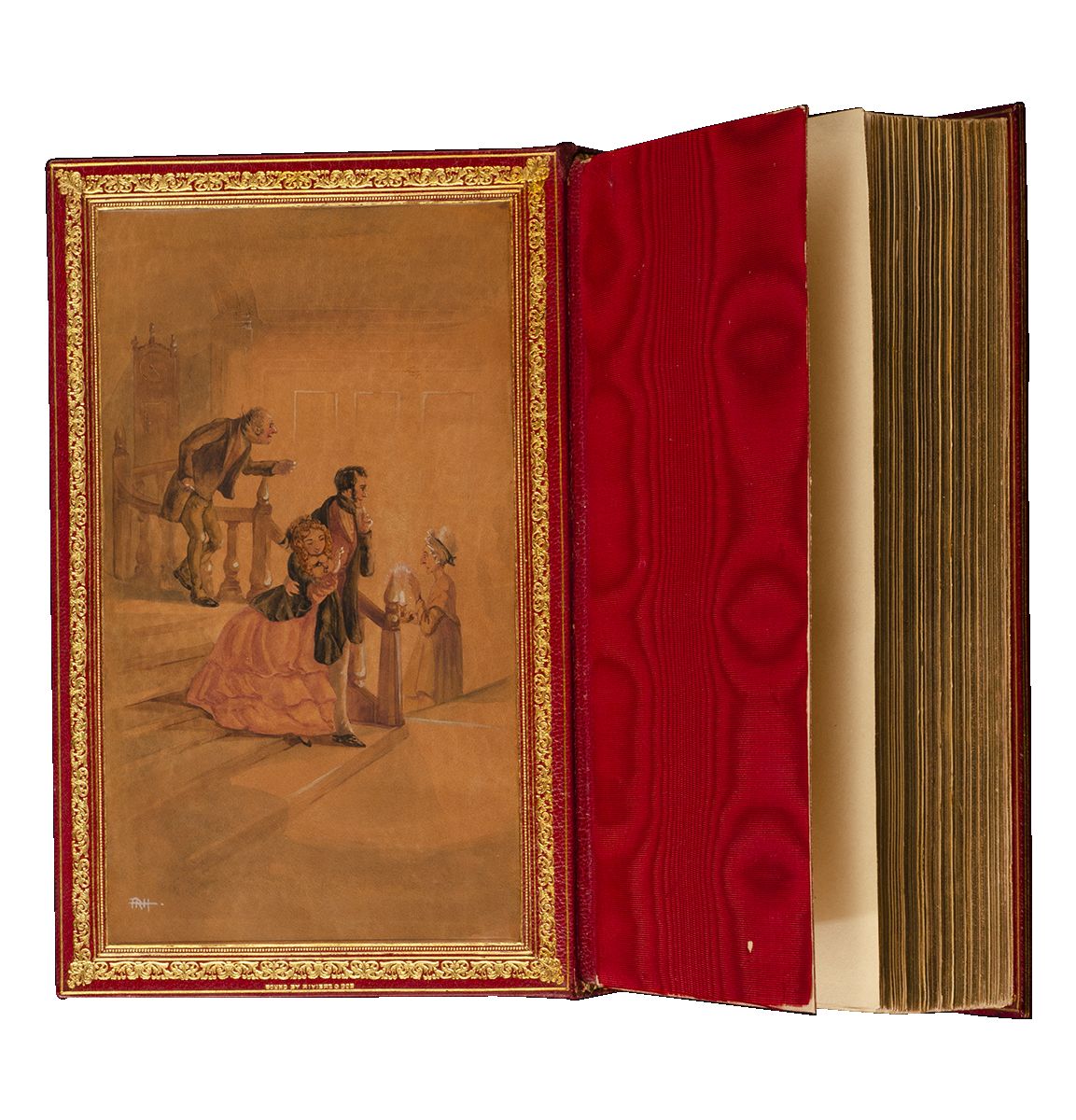 London: Bradbury & Evans, 1857. First edition. Near Fine. First issue with all twenty-one internal text flaws as noted by Smith. Octavo. (8 1/2 x 5 1/2 in; 216 x 138 mm). xii, 625, [1, blank] pp. Forty engraved plates by "Phiz" (H.K. Brown), including frontispiece and engraved vignette title page. With an inserted preliminary leaf printed "With Water Colour Drawing on Calf Doublure by" [signed] Helen R. Haywood. Bound ca. 1930 by Rivière and Son (stamp signed to upper doublure) in full wine crushed morocco. Gilt French fillets. Gilt vignette to upper board. Five gilt ruled raised bands. Gilt lettered and decorated compartments. Original watercolor painting, ca.1930, by Helen R. Haywood reproducing in color the Phiz plate "Flora's Tour of inspection" found opposite to page 519, on calf to upper doublure (signed "HRH" at lower left corner) with gilt rolled decorative borders. Red moire silk endpapers. Red moire silk to lower doublure with gilt rolled borders. All edges gilt. Neat ink inscription on front blank "Louise Dalton Kirk./from/Mother and Dad-/1936-." Expertly rebacked with the original spine panel laid down. Housed in the binder's original fleece-lined red cloth slipcase. A unique copy.