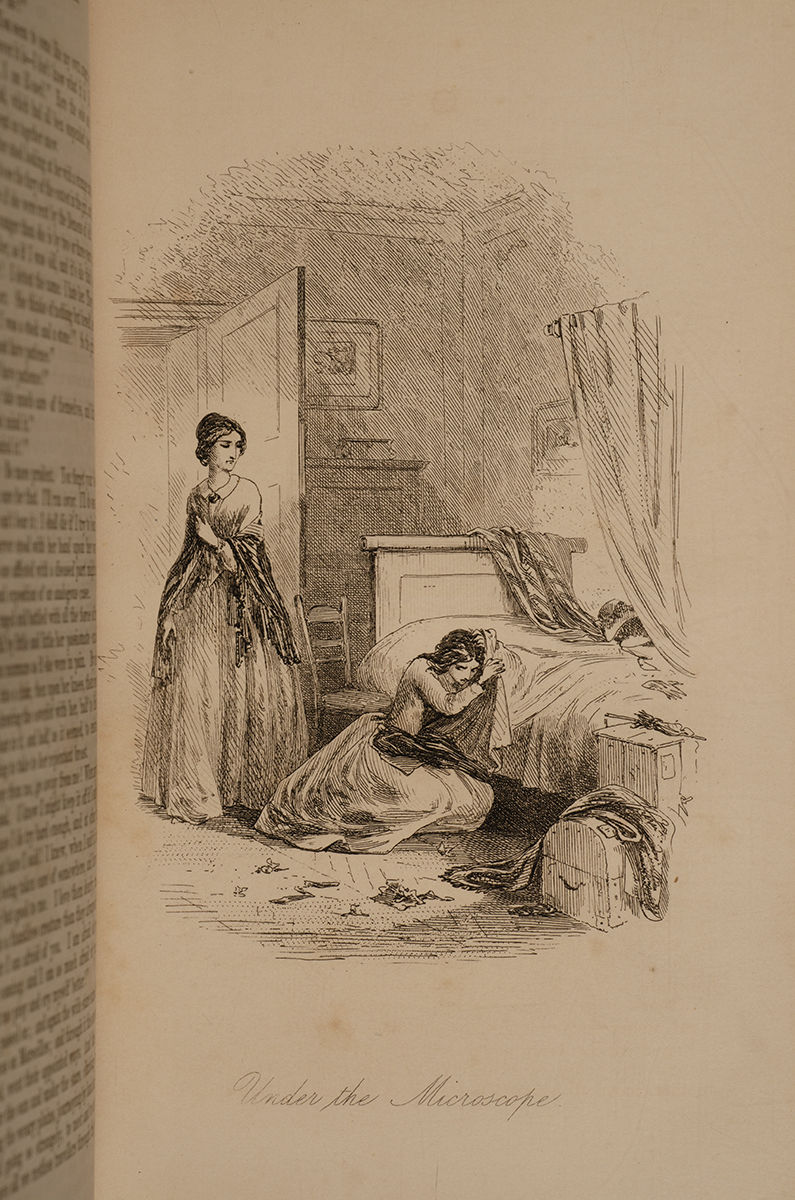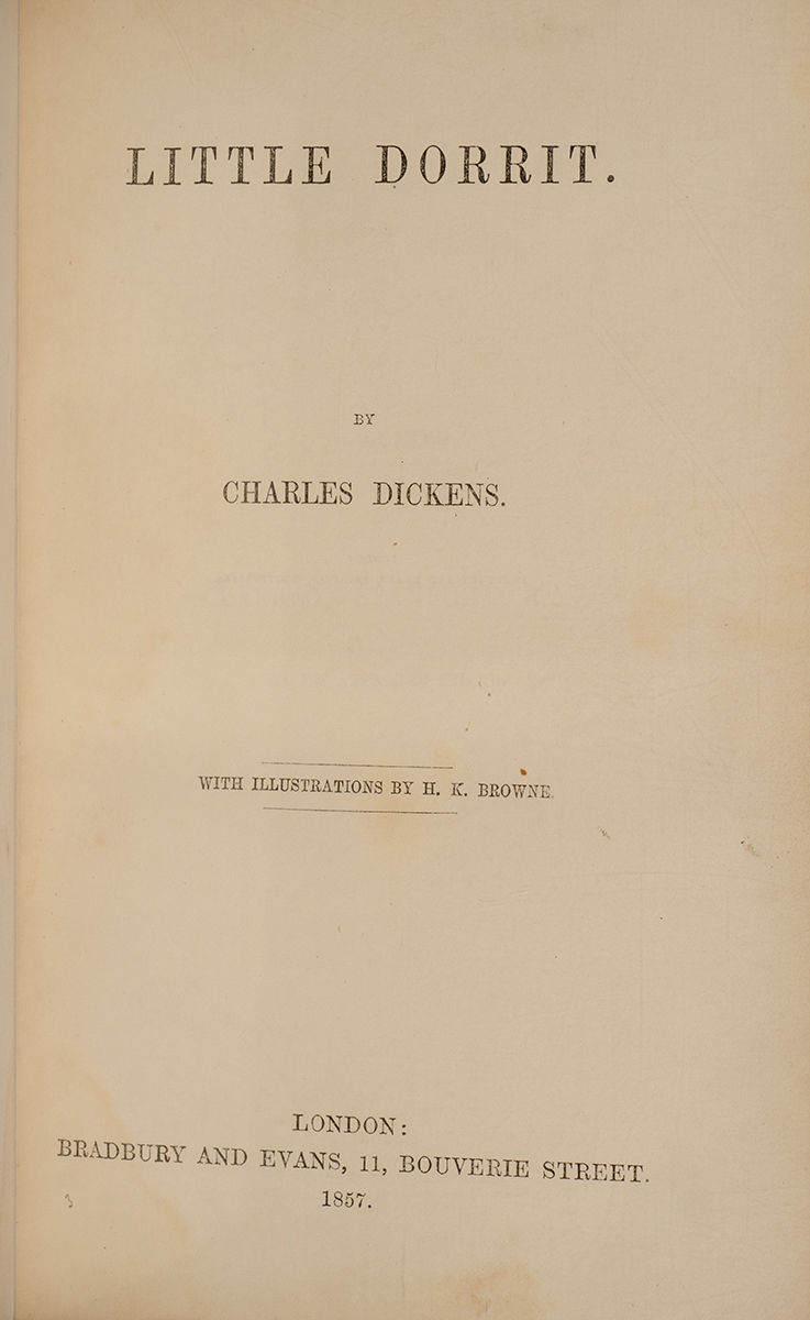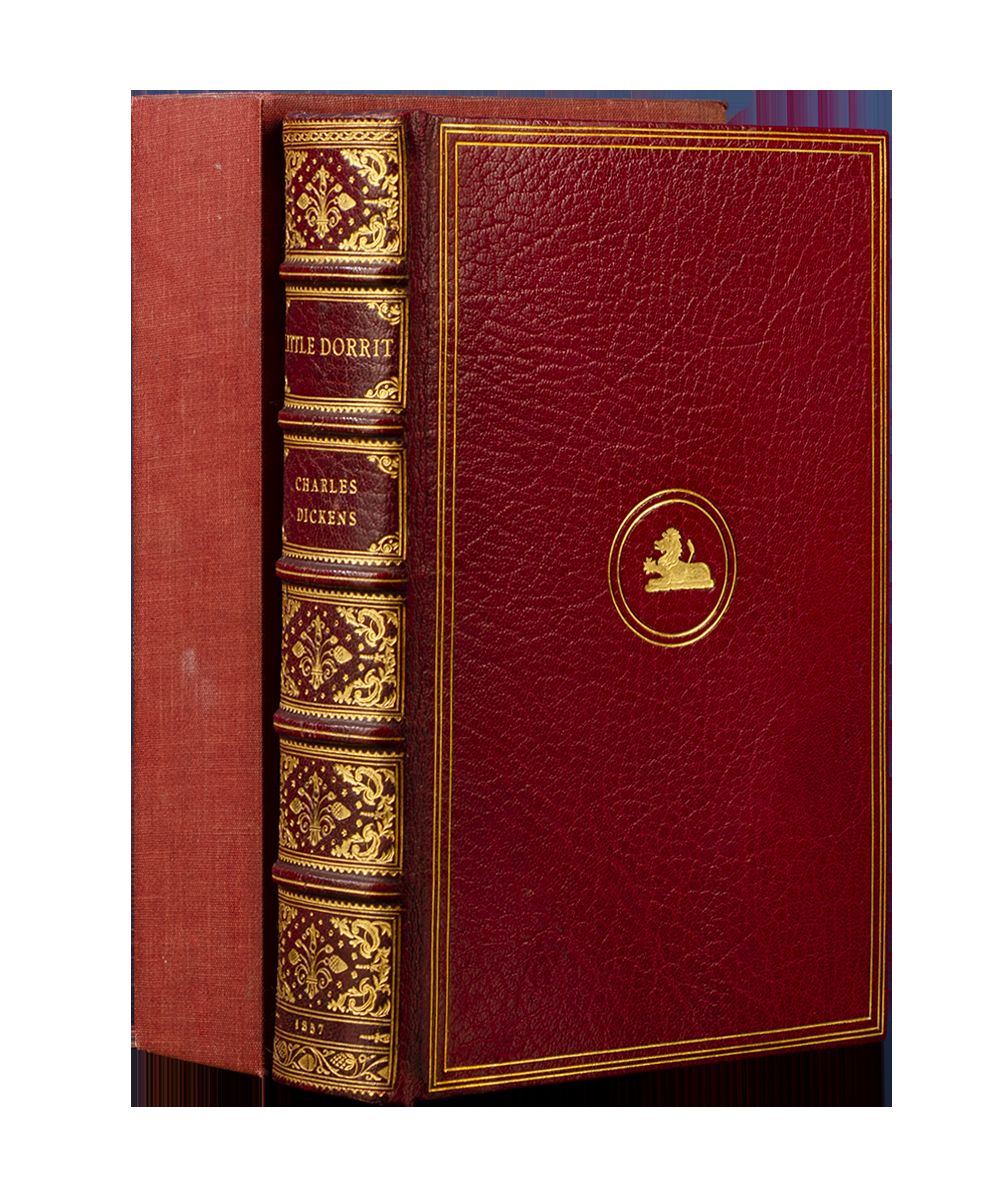 London: Bradbury & Evans, 1857. First edition. Near Fine. First issue with all twenty-one internal text flaws as noted by Smith. Octavo. (8 1/2 x 5 1/2 in; 216 x 138 mm). xii, 625, [1, blank] pp. Forty engraved plates by "Phiz" (H.K. Brown), including frontispiece and engraved vignette title page. With an inserted preliminary leaf printed "With Water Colour Drawing on Calf Doublure by" [signed] Helen R. Haywood. Bound ca. 1930 by Rivière and Son (stamp signed to upper doublure) in full wine crushed morocco. Gilt French fillets. Gilt vignette to upper board. Five gilt ruled raised bands. Gilt lettered and decorated compartments. Original watercolor painting, ca.1930, by Helen R. Haywood reproducing in color the Phiz plate "Flora's Tour of inspection" found opposite to page 519, on calf to upper doublure (signed "HRH" at lower left corner) with gilt rolled decorative borders. Red moire silk endpapers. Red moire silk to lower doublure with gilt rolled borders. All edges gilt. Neat ink inscription on front blank "Louise Dalton Kirk./from/Mother and Dad-/1936-." Expertly rebacked with the original spine panel laid down. Housed in the binder's original fleece-lined red cloth slipcase. A unique copy.