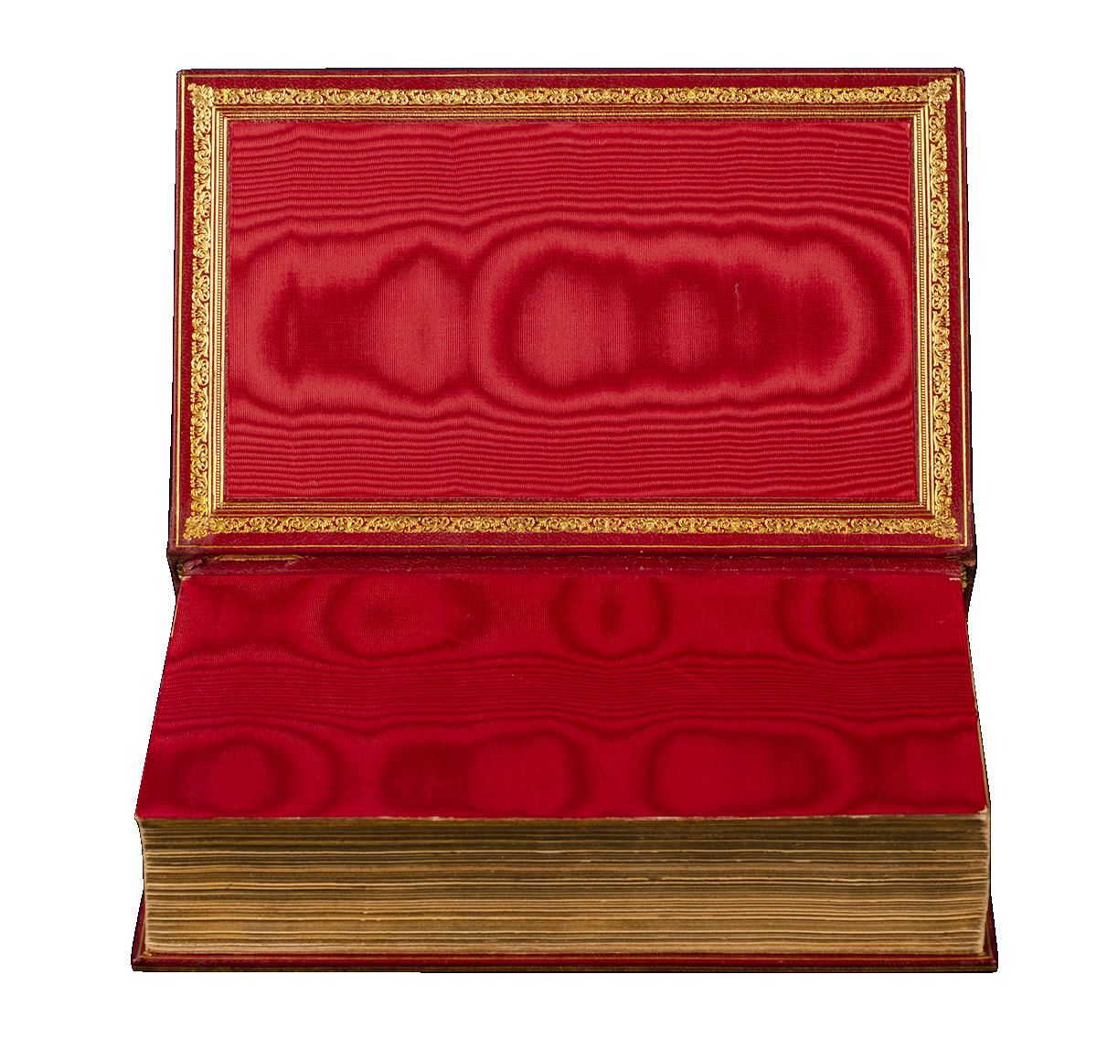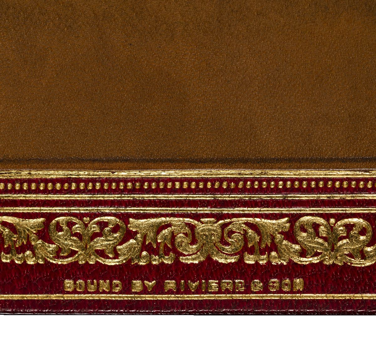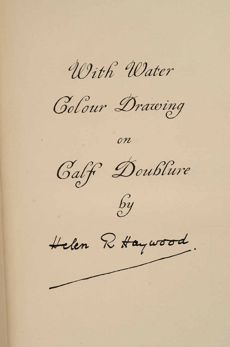 Helen R[iviere] Haywood (1908-1995), was an English painter, children's book illustrator, and writer, best known for her foredge paintings. She came from a book-binding family: Haywood was the granddaughter Robert Riviere, founder of the great bindery, which executed this lovely binding, and her uncle (who also worked for the firm) introduced her to foredge and double foredge painting. Between the 1930s-1970s she completed multiple commissions for Inman's Books, a New York City based antiquarian book dealer. From her intertest in science, anthropology, and naturalism, Haywood developed a keen attention to the world’s natural elements; this talent for observation and specificity found its way into her artwork. “The Riviere Bindery was one of the most notable and prolific shops in London's West End from about 1840 through 1939” (Princeton). Bath-based Bayntun Bindery acquired the firm in 1939, transforming into the “Bayntun-Riviere bindery,” which is still in existence and family owned.