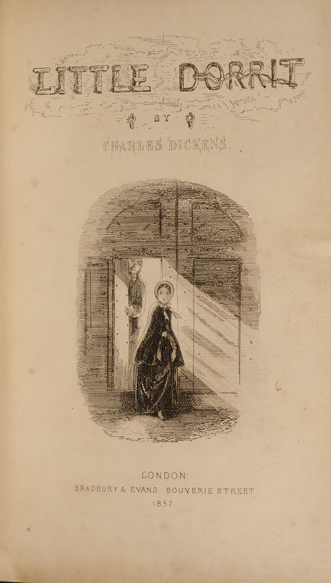 With Amy Dorrit as his case study, Dickens reveals how a parents' financial shortcomings can detrimentally affect their daughters' lives -- forcing women into unsafe or unsavory employment and preventing them from finding husbands or forming families of their own. And he suggests that only through goodness and self sacrifice can women rise up from these conditions. "On any other terms than those of allegory, angelic Amy Dorrit would be squirmingly hard to swallow. As it is, her goodness is indispensable to the story. Born in the Marshals debtor's prison, she is the only character whose wishes are wholly unselfish and whose unbreakable will to love and be loved frees her metaphorically from every prison, literal and social. All the other major characters are imprisoned by discontent, by poverty, by ignorance, by personal ambition, even by ill-judged kindness; but most conspicuously by an insatiable desire for money, power and status" (Stevenson). No other Dickens novel tackles more overtly the burdens women bear in the face of economic hardship, nor so highly glorifies its female characters for their endurance. "Little Dorrit originally appeared in twenty numbers, bound in nineteen monthly parts, the last part forming a double number, from December 1855 - June 1857. It was published in book form on May 30, 1857" (Smith).