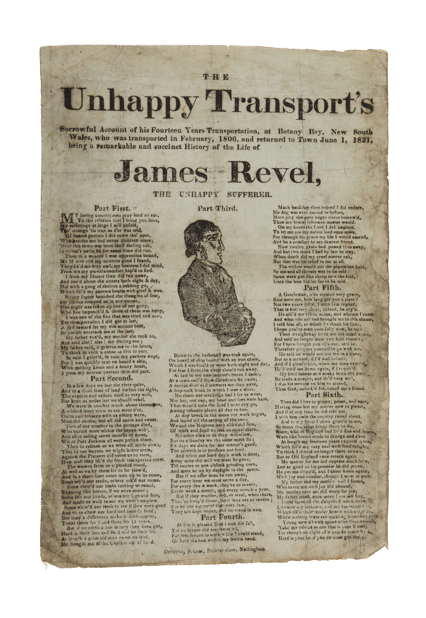 1821. James Revel, The Unhappy Sufferer" [Broadside]. [Transportation]. Revel, James. The Unhappy Transport's Sorrowful Account of His Fourteen Years Transportation, At Botany Bay, New South Wales, Who was Transported in February, 1806, And Returned to Town June 1, 1821, Being a Remarkable and Succinct History of the Life of James Revel, The Unhappy Sufferer. Nottingham: Ordoyno, Printer, [1821]. 14-3/4" x 9-3/4" broadside mounted to backing sheet, text in triple columns below headline, woodcut portrait at head of second column. Moderate toning and soiling, light foxing in a few places, light creasing and edgewear. Rare. $4,500. * The fable of James Revel's fourteen-year sentence began as an eighteenth-century chapbook ballad documenting Revel's transportation to Virginia in the American colonies. (The earliest copies were printed in London, probably in the 1750s or 1760s.) As society and the logistics of transportation changed, the language of the ballad changed to suit the circumstances, with the dates of Revel's departure and return altered appropriately to lend authenticity. The ballad's text mixes conventional signifiers of the American and Australian colonies. References to a "seven months" journey to Port Jackson and other details correspond to Australia, but references to plantations, tobacco plants and "the poor negro slaves" come from the American version of the ballad. Transportation broadsides like these provide interesting cultural insight into public perceptions of the penal system and its relationship to the expanding British Empire. The printer of this broadside, "Ordoyno" of Nottingham, is Charles Sambrook Ordoyno (1766-1826) who was a successful publisher and printer in Nottingham, specializing in salacious pamphlets describing trials, murders and hangings. This imprint is rare and appears to be unrecorded. No copies located on OCLC or LibraryHub. We located other Revel broadsides set in Botany Bay with varying imprints and dates from 1821-1824 at 5 institutions worldwide (Mitchell Library, National Library of Scotland, British Library, Oxford University, National Library of Australia).