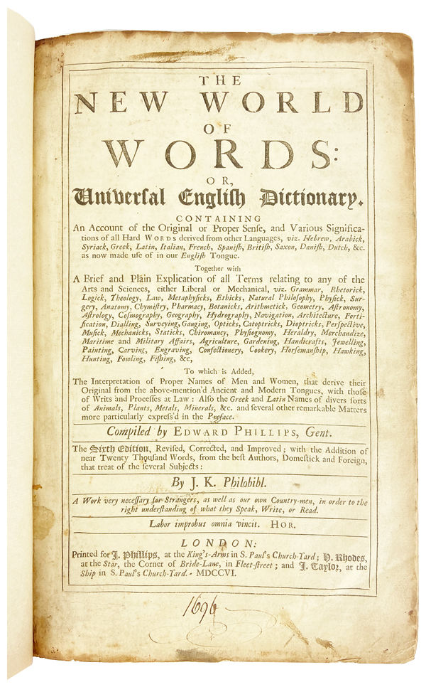 The New World of Words: Or, Universal English Dictionary. Containing An Account of the Original or Proper Sense, and Various Significations of all Hard Words derived from other Languages, viz. Hebrew, Arabick, Syriack, Greek, Latin, Italian, French, Spanish, British, Saxon, Danish, Dutch, &c. as now made use of in our English Tongue