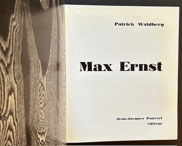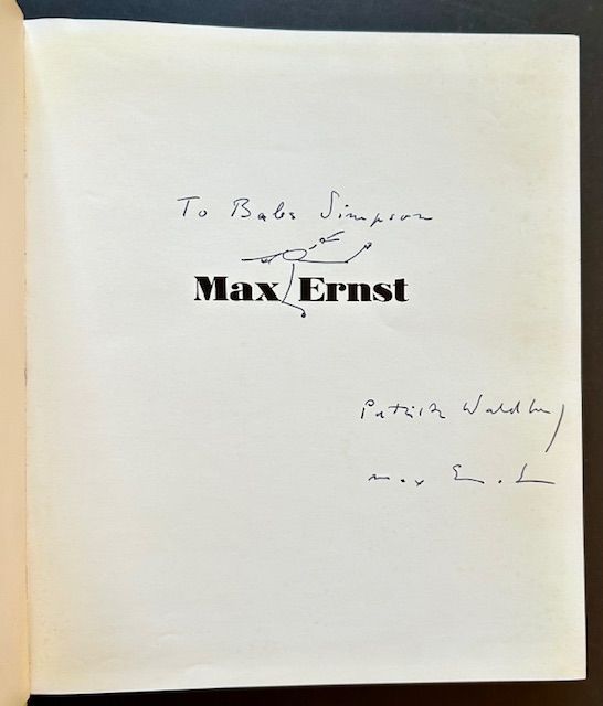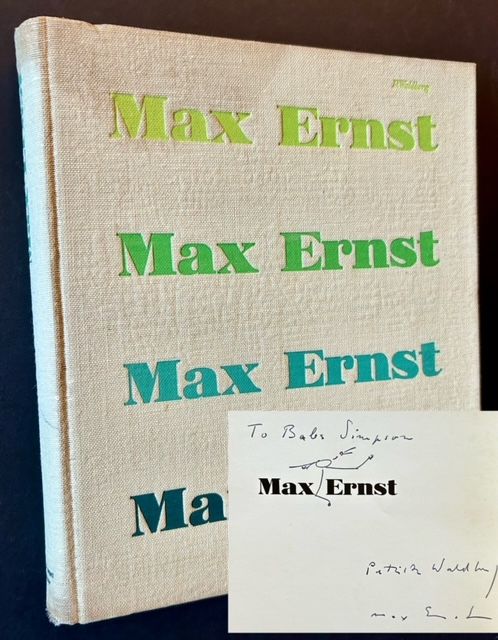Paris: Societe des Editions Jean-Jacques Pauvert, 1958. Decorative Cloth. Very Good +. INSCRIBED BY BOTH MAX ERNST AND THE AUTHOR, PATRICK WALDBERG, on the half-title. ALSO INCLUDES A DRAWING OF A STICK-FIGURE MAN, IN MAX ERNST'S HAND, near the 2 signatures, SEPARATING THE "MAX" FROM THE "ERNST". A very solid copy to boot of the 1958 1st edition of this impressive monograph on Max Ernst, with an abundance of illustrations (a handful of them in color) supplementng Patrick Waldberg's text. Tight and VG+ in its beige cloth, with a bit of light staining to the upper front panel and spine crown, and very mild, subtle bowing at the front panel. Square quarto, photographs by Lee Miller, Frederic Sommer, etc. Very uncommon as such, graced with Max Ernst's signature and a tiny original sample of his art.