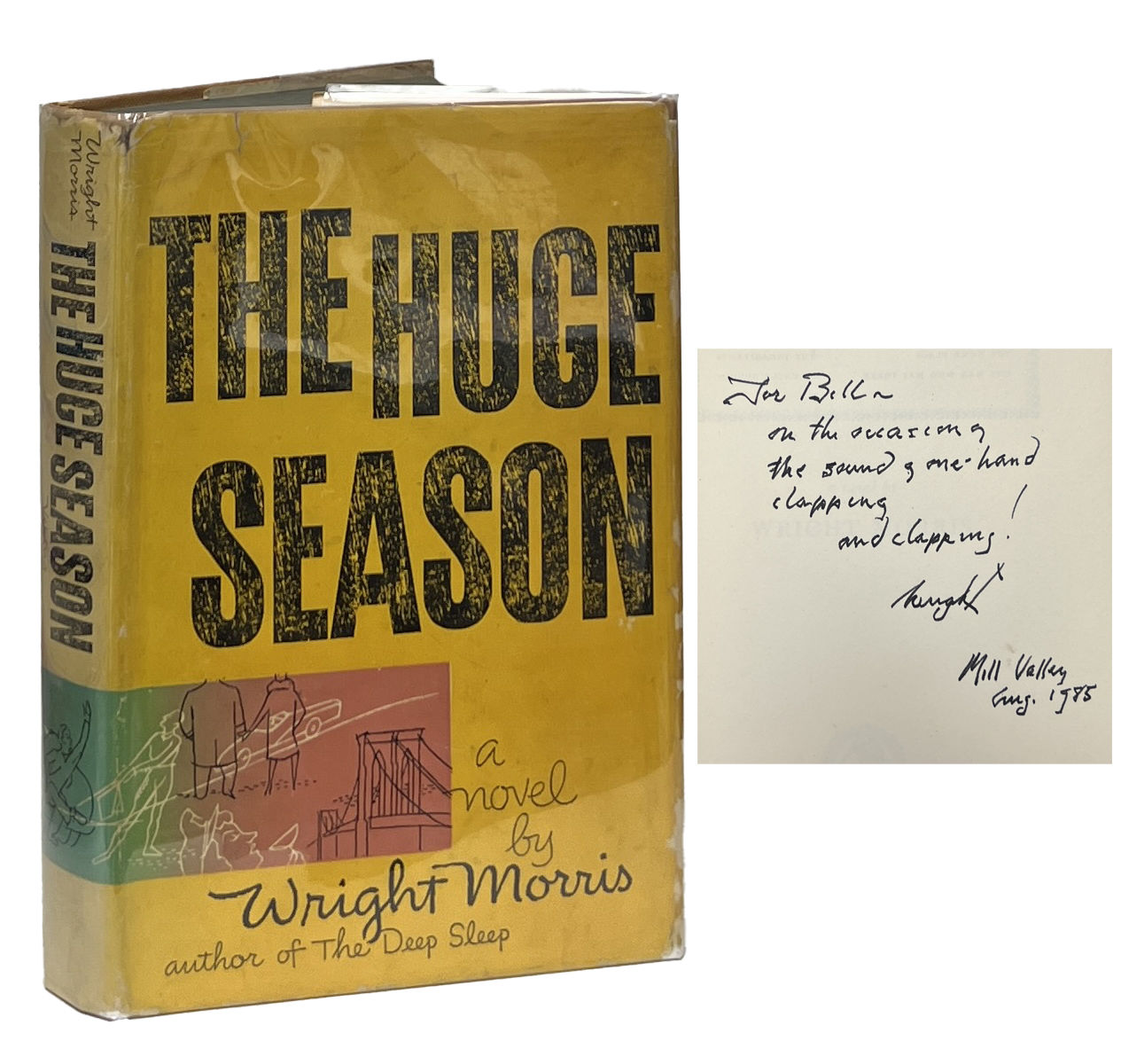 New York: The Viking Press, 1954. First Edition. Hardcover. Very Good/Very Good. Inscribed by Morris on the half-title. Very Good in a Very Good jacket, unclipped ($3.75), generally toned and soiled, a few chips at the folds. Yellow cloth, toned at the edges, with red ink panels and black ink lettering and designs on the spine and front board. Square and firmly bound with a black top stain, gift inscription on the front endpaper, clean otherwise. Morris's novel about "some characters today who have survived from Fitzgerald's and Hemingway's twenties, characters who might have been kinsmen of Jake an Lady Brett and Gatsby.
