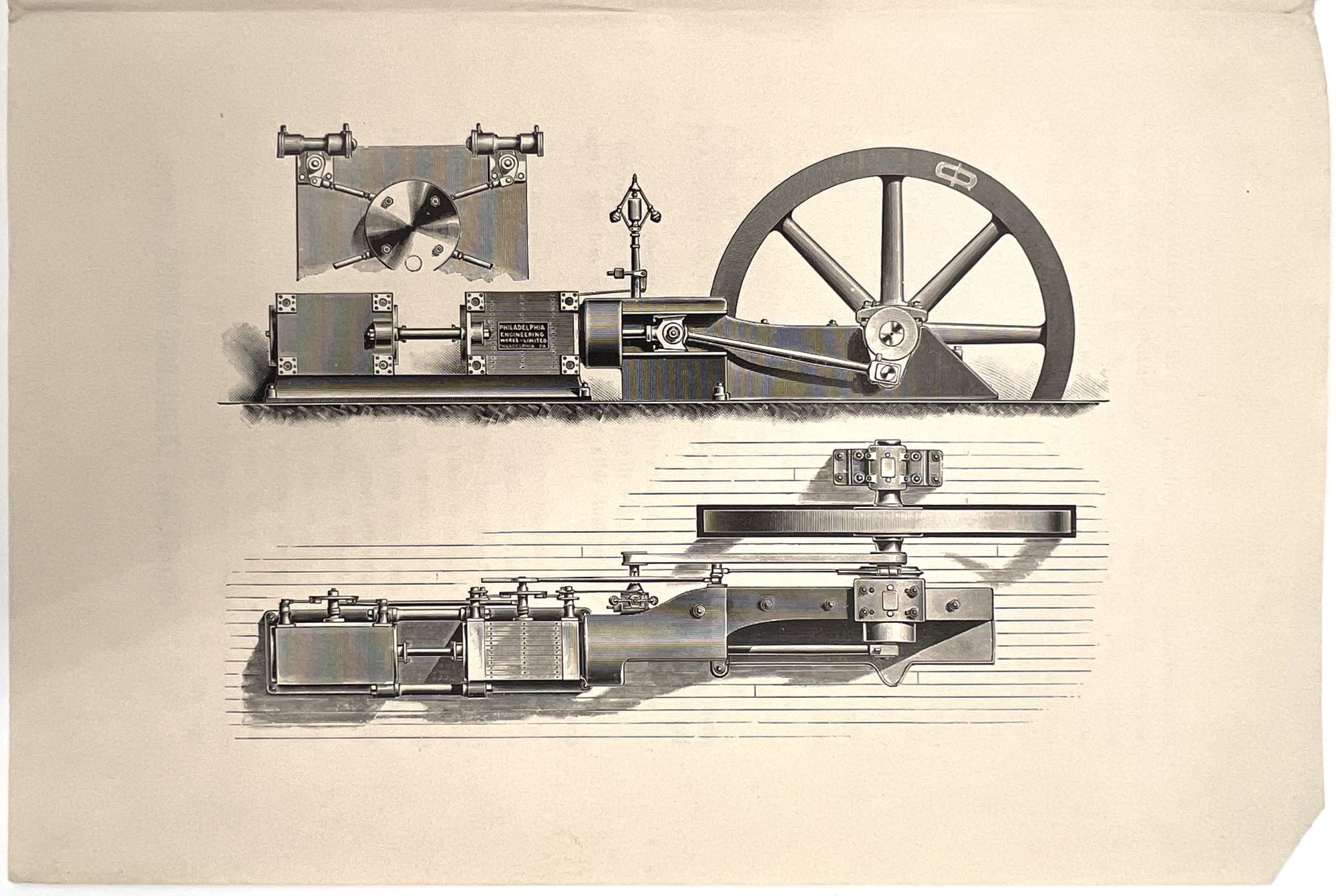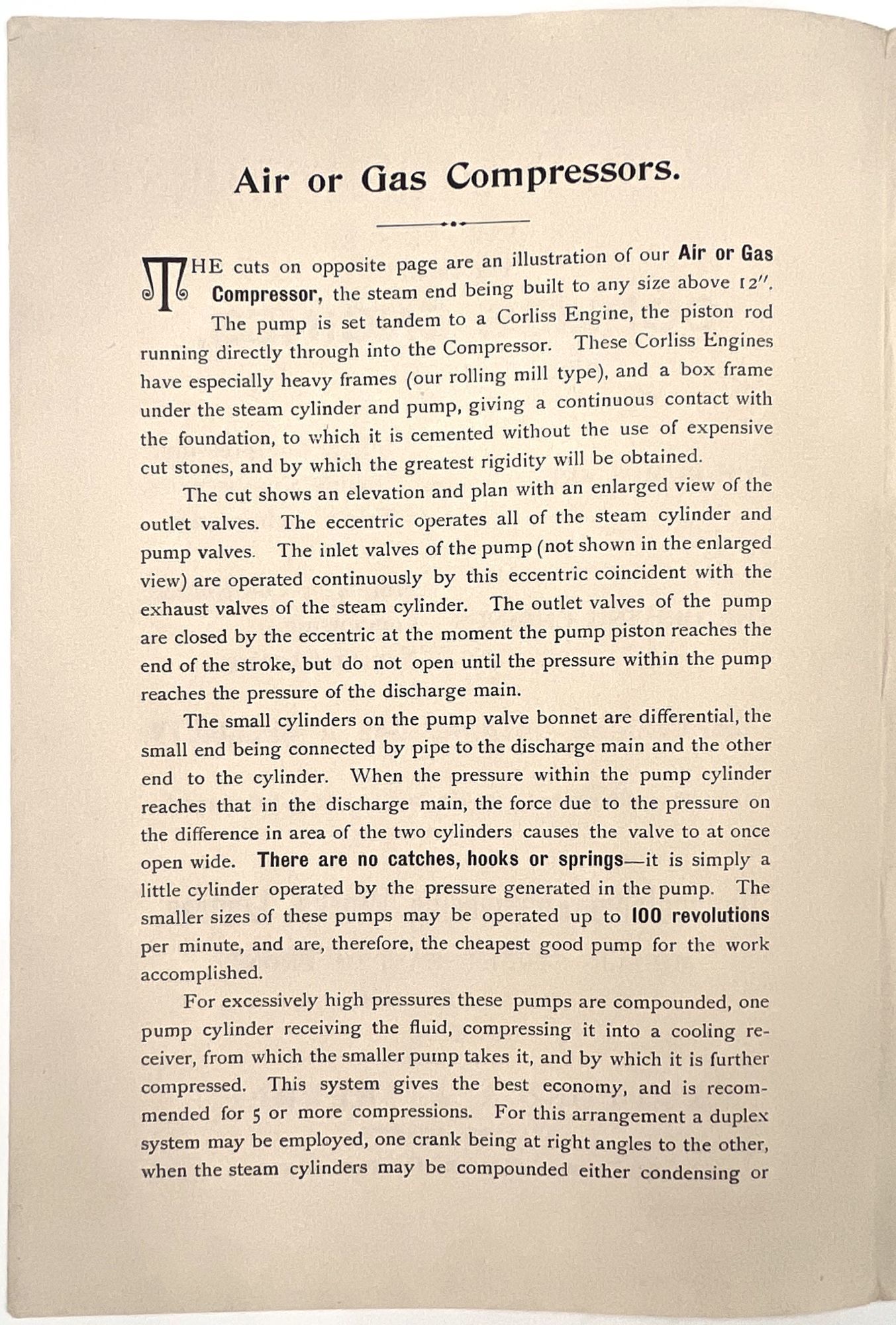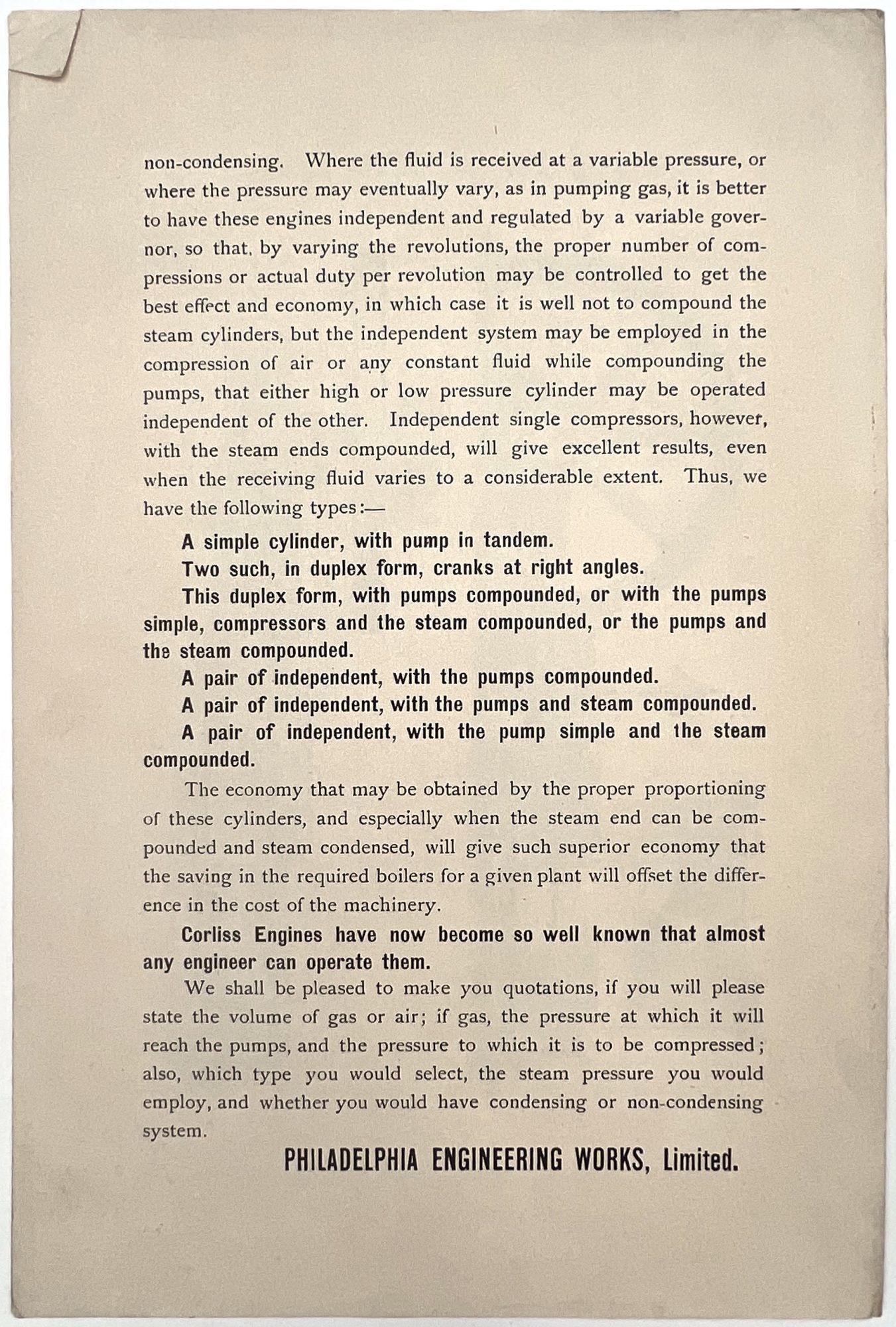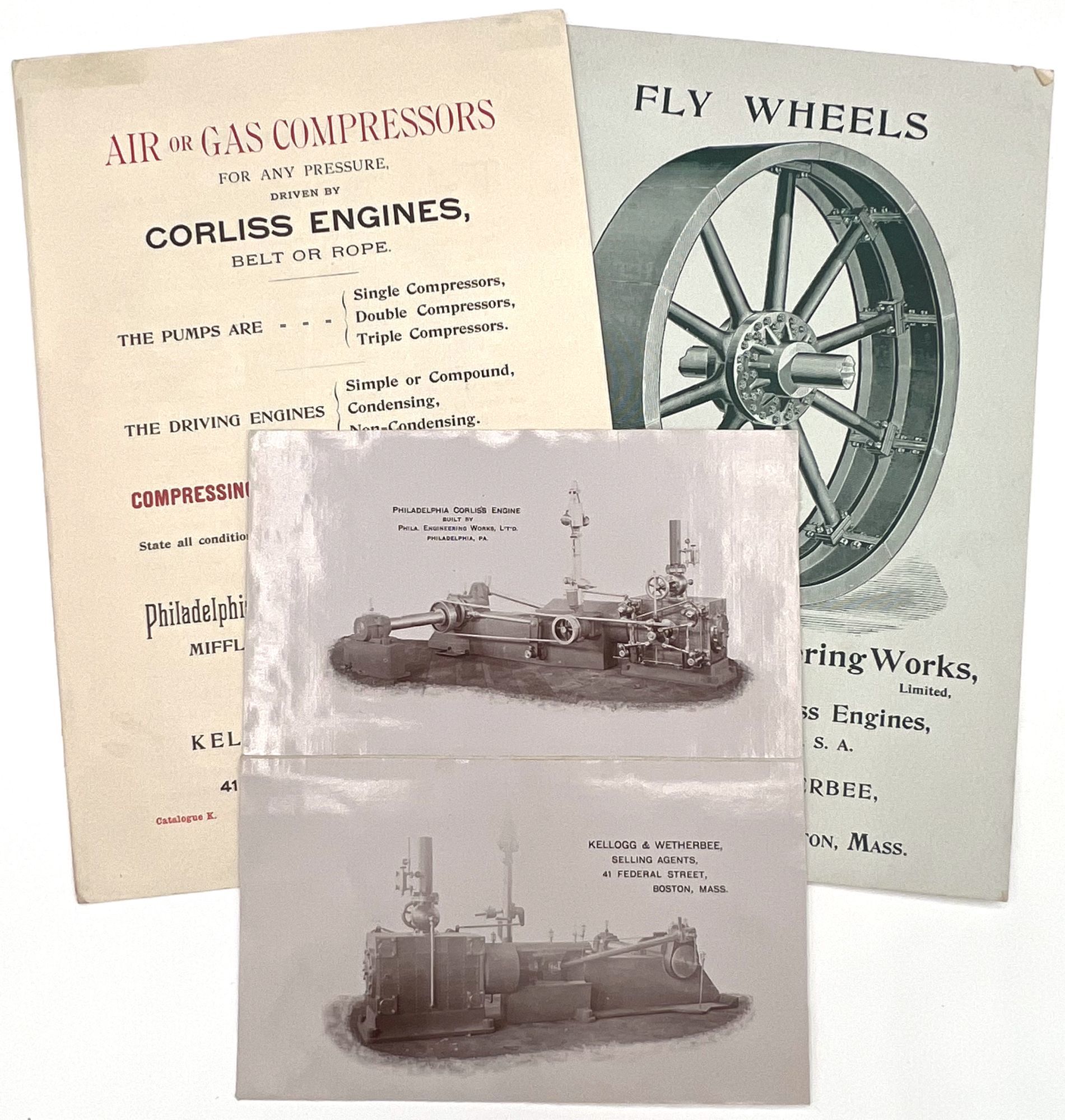 "Air or Gas Compressors for any Pressure, Driven by Corliss Engines, Belt or Rope". Philadelphia: Philadelphia Engineering Works, Limited, c.1890. Printed bifolium (9.25" by 6") with full-page image of engine. Brief trade catalogue advertising engine parts for the Corliss Engine.