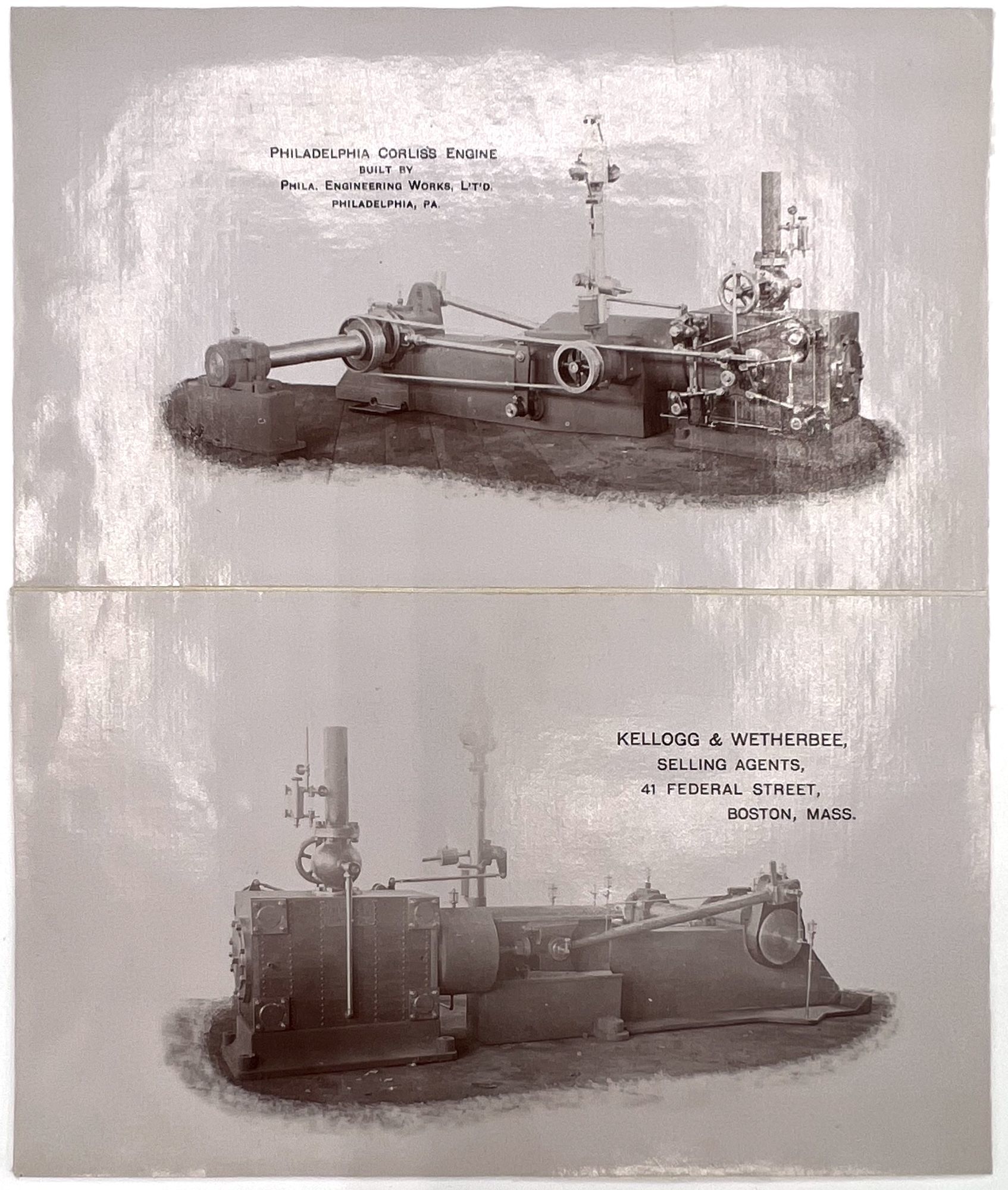 Two (2) photographs of Corliss Engines, mounted to a single piece of canvas measuring approx. 7" by 6", captioned with the manufacturer (Philadelphia Engineering Works) and sales agent (Kellogg & Wetherbee). Philadelphia, c.1890.