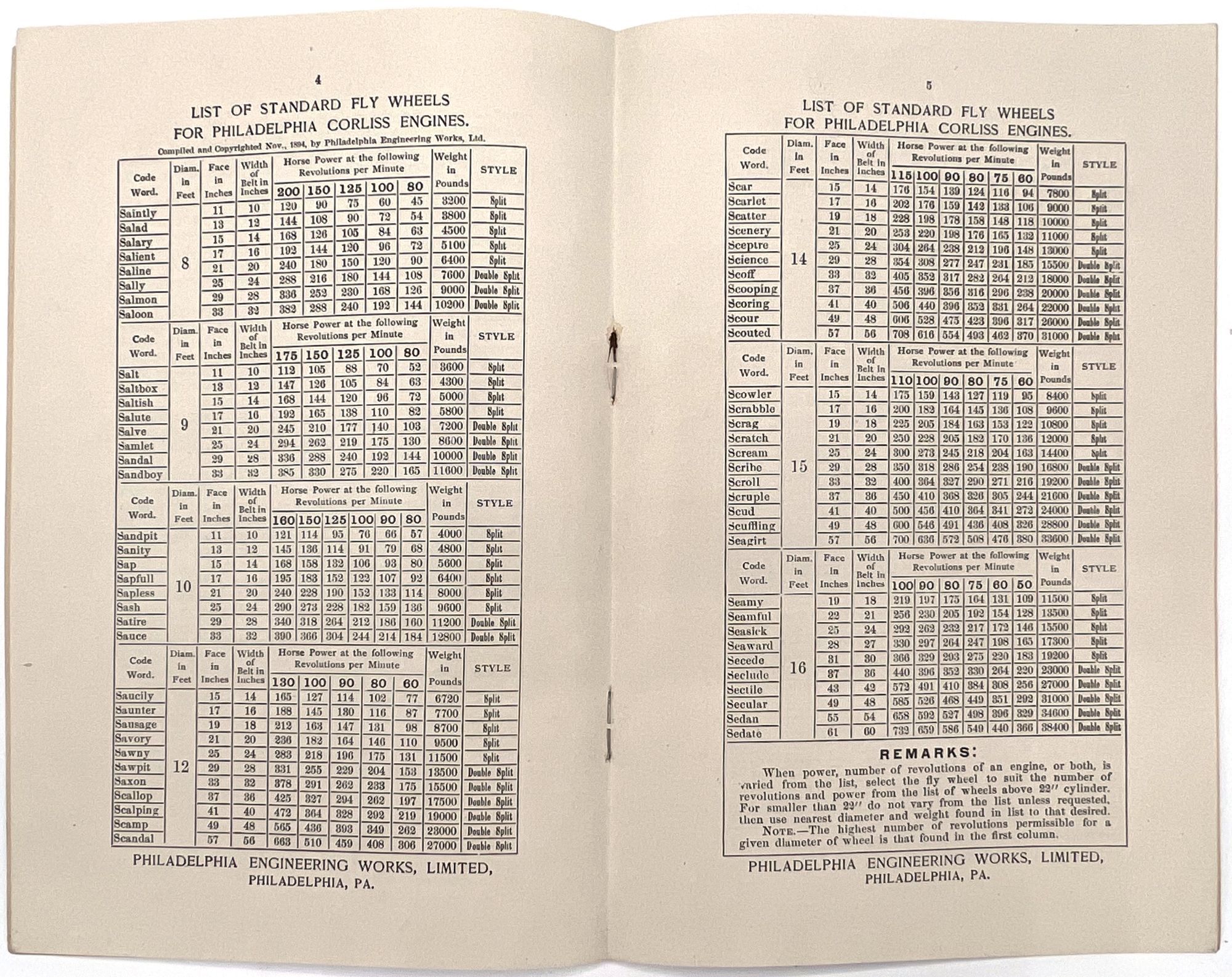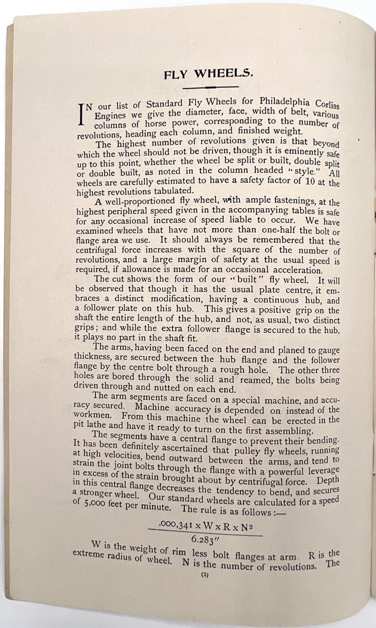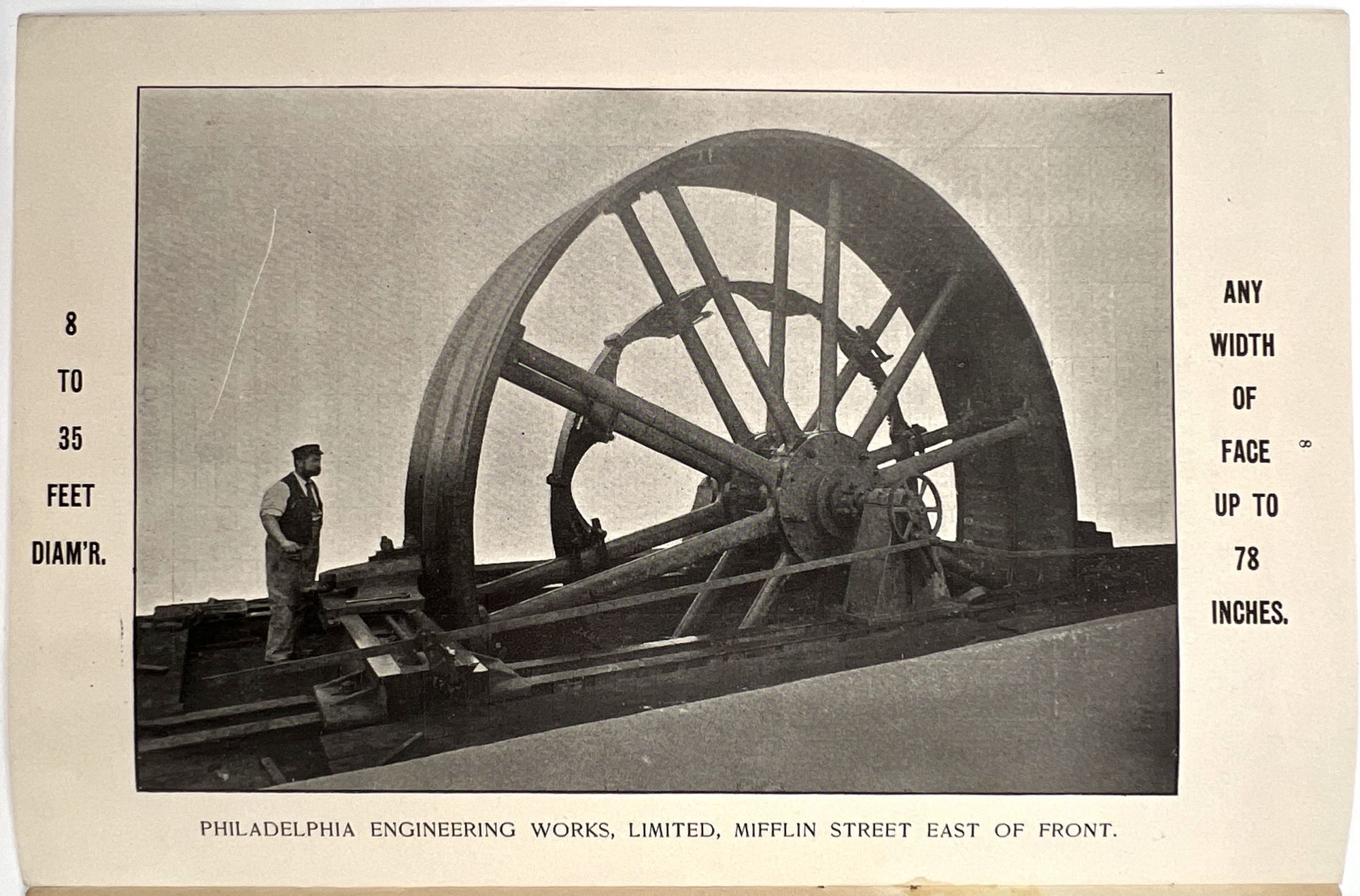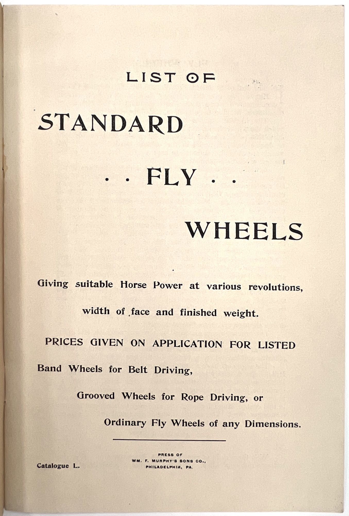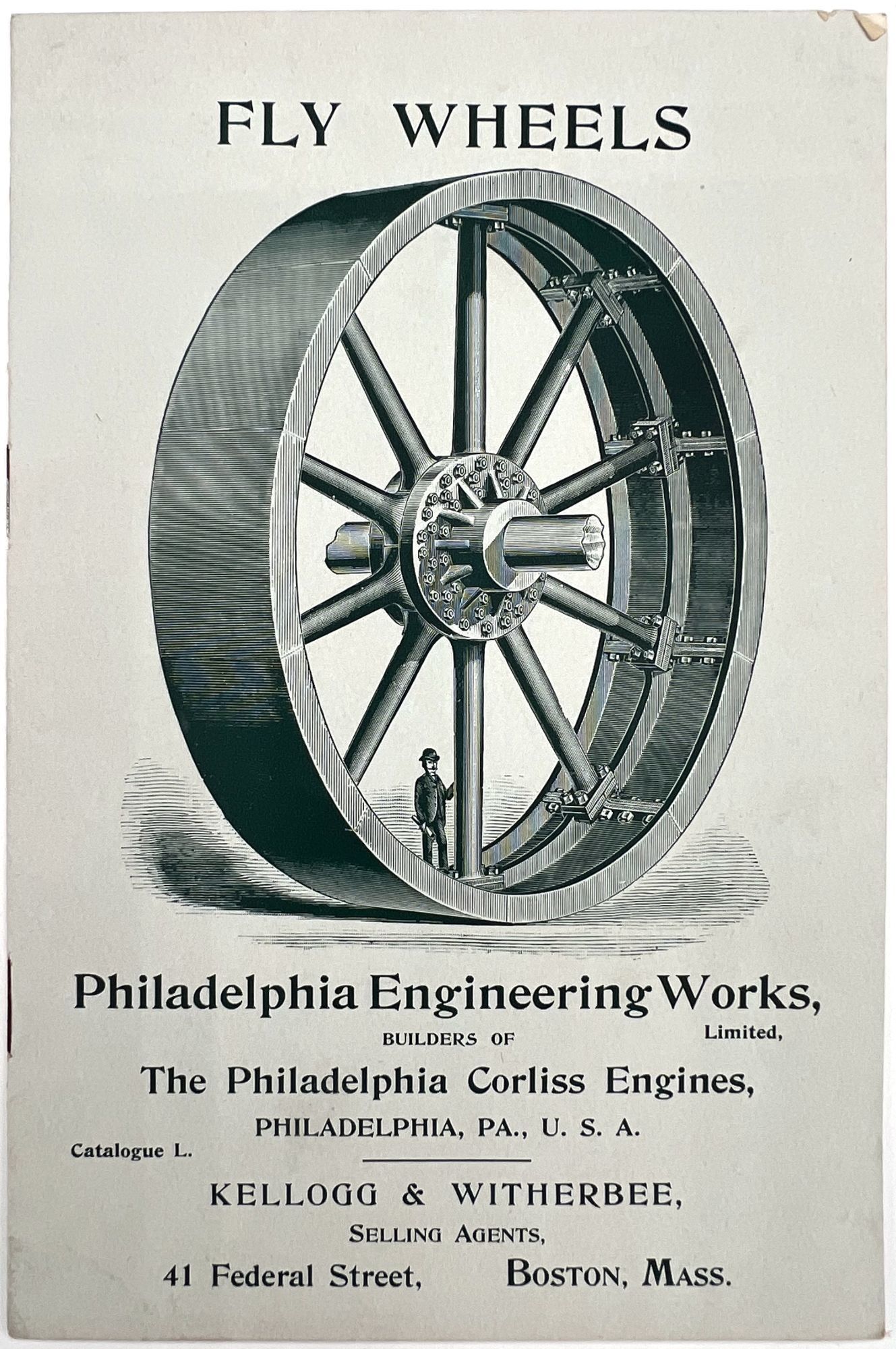 "Fly Wheels". Philadelphia: Philadelphia Engineering Works, Limited, c.1890. Single vol. (9" by 6"), pp. 8, original illus. wrps. Trade catalogue advertising large wheels for Corliss Engines.
