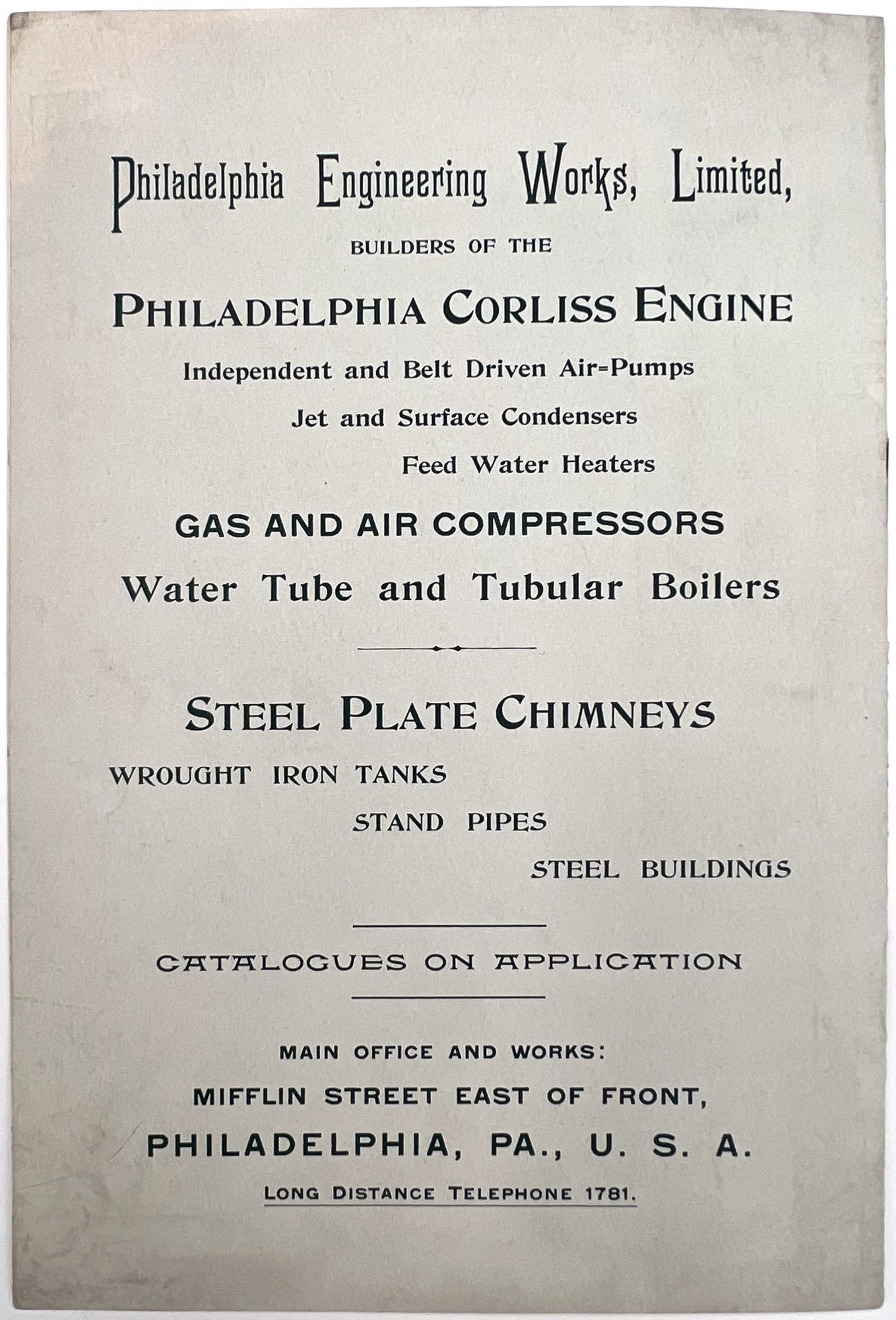 Philadelphia, Pennsylvania: Philadelphia Engineering Works, Limited, 1890. Very good. Some toning, discoloration.. Three (3) items advertising the Corliss Engine, an improved steam engine debuted at the 1876 Centennial Exposition in Philadelphia by its creator, George Henry Corliss. The engine was viewed as a major breakthrough and improvement on previous steam engines, and went on to power looms, mills, and factories of all descriptions. The three items include:
