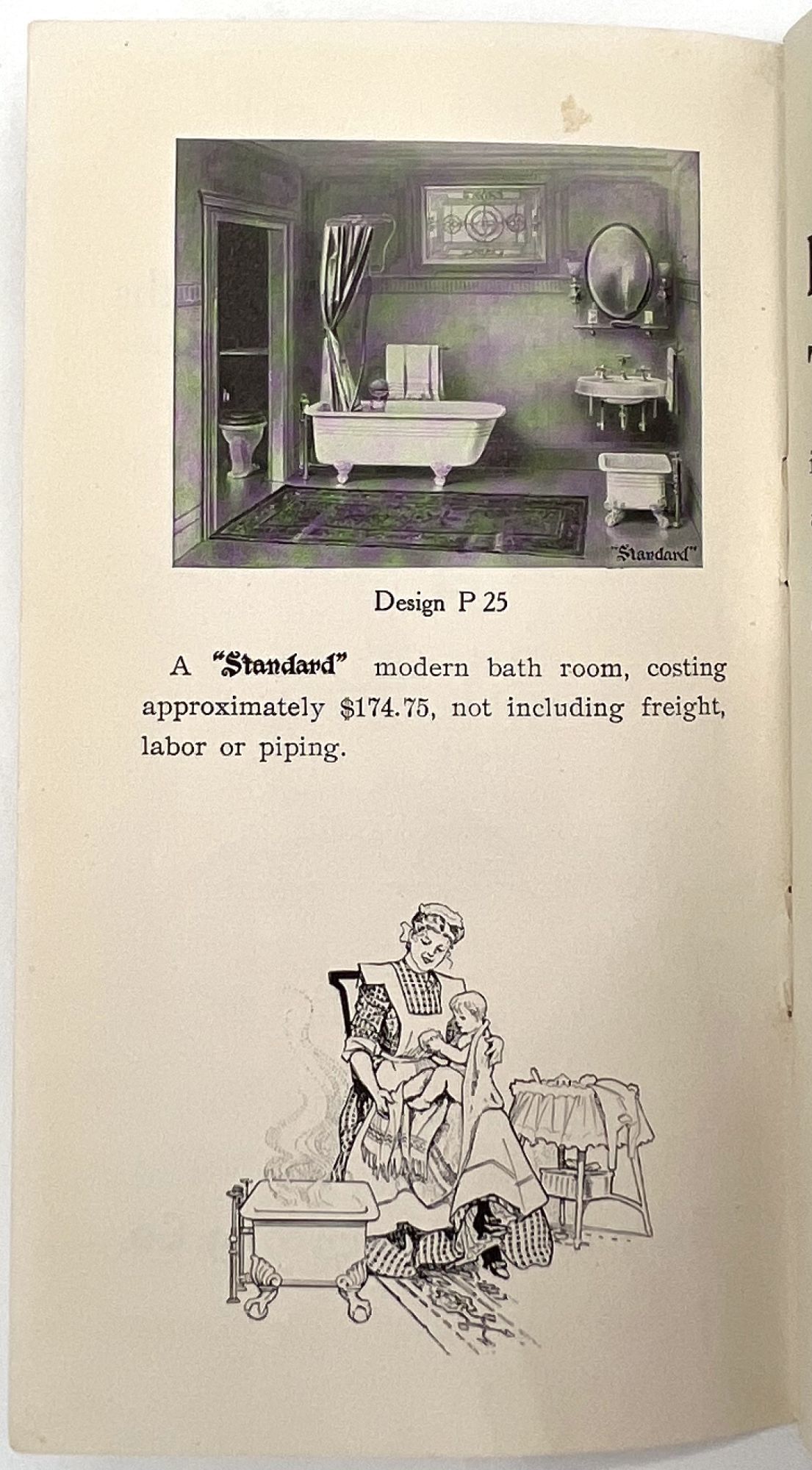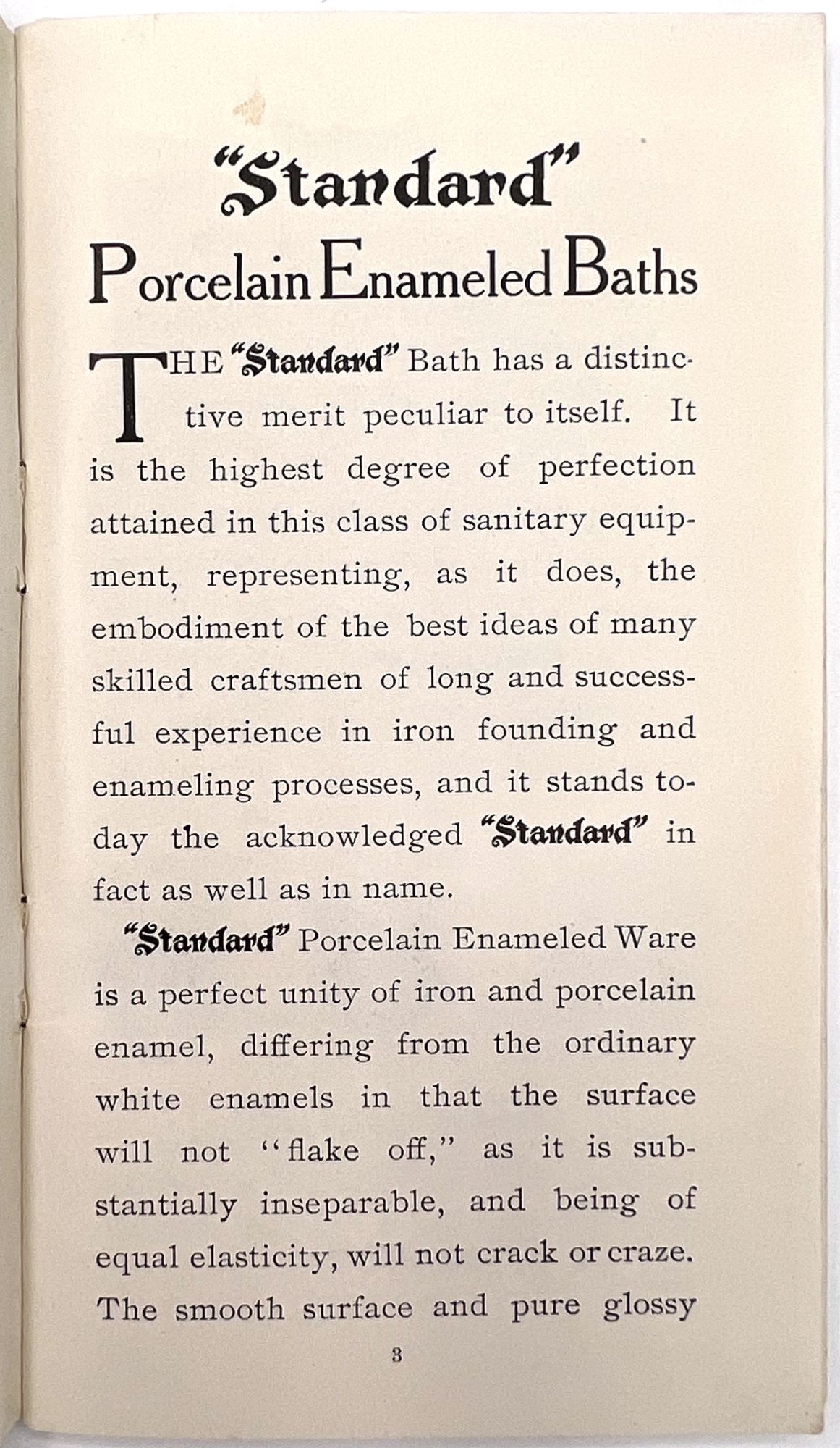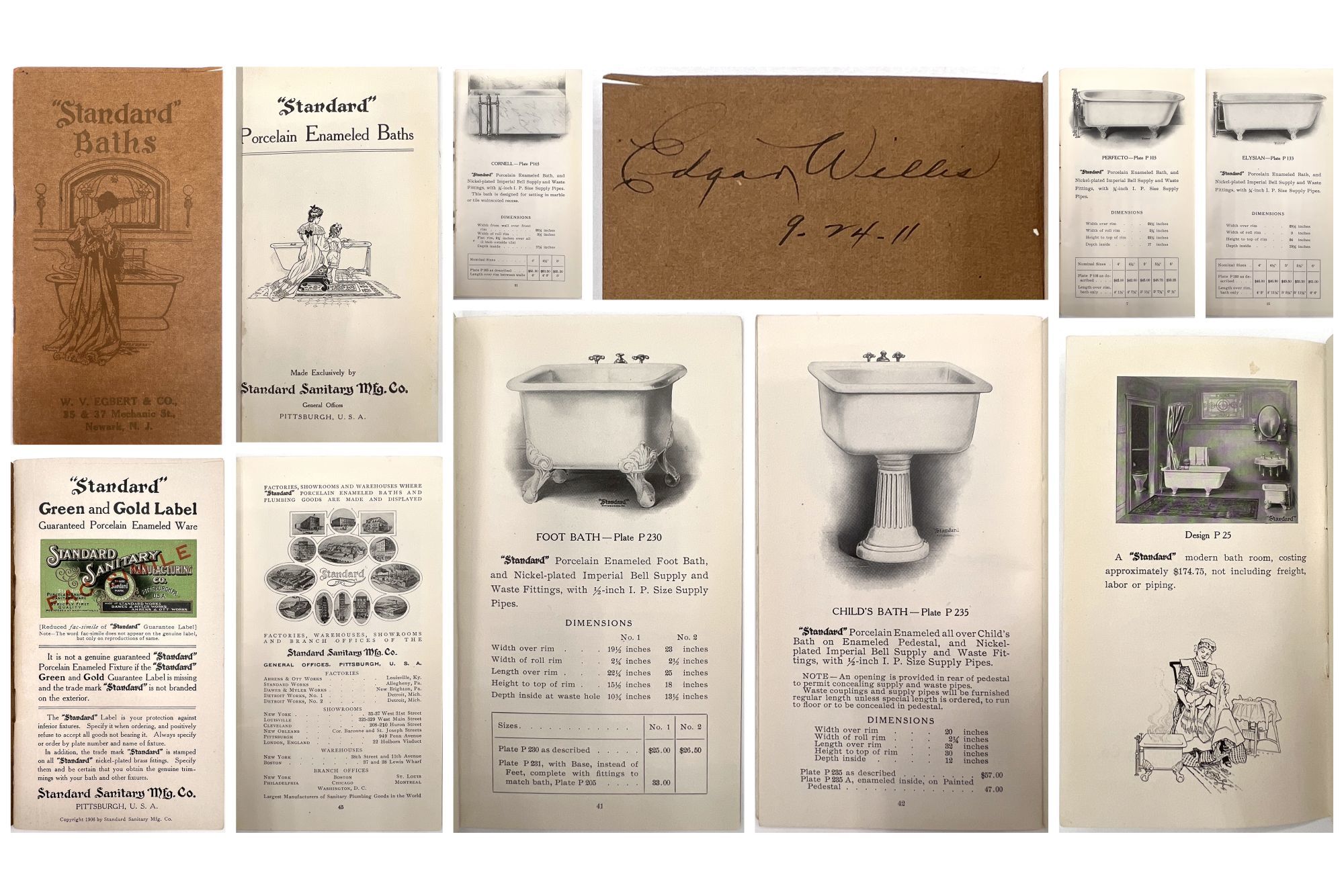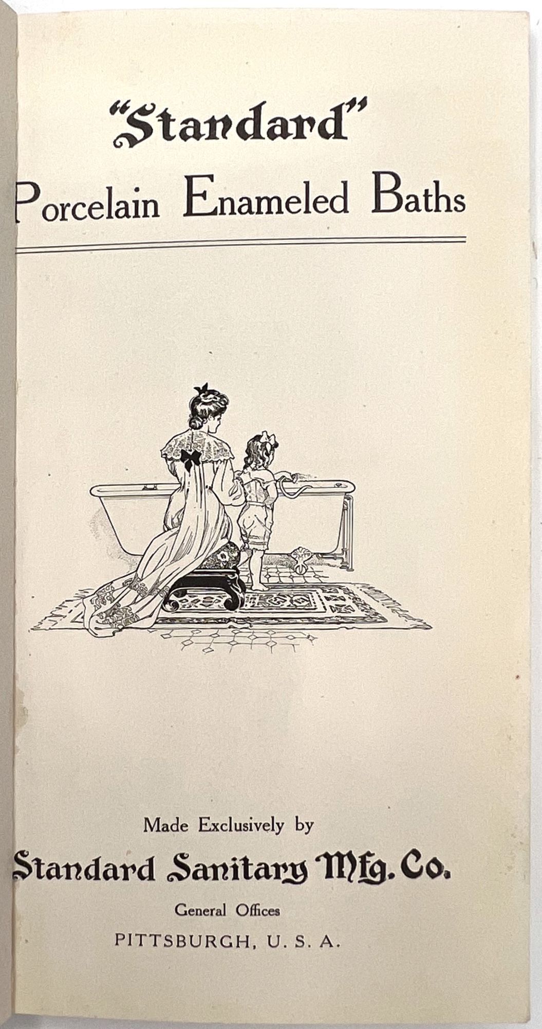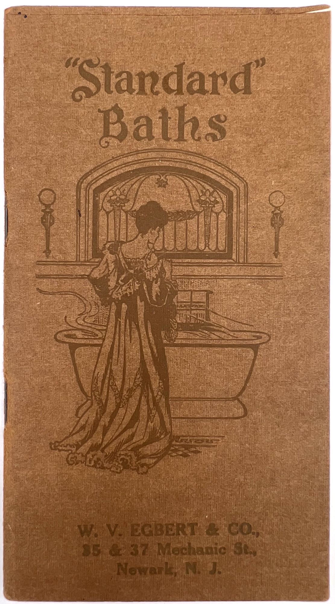 Pittsburgh, Pennsylvania: Standard Sanitary Mfg. Co, 1906. Near-fine. Two leaves in center of gathering detached but present.. A trade catalogue advertising "Standard" brand porcelain enameled baths, featuring images, sizing, and pricing for over thirty-five different styles of baths. Each lavish bath is softly lit and styled to attract high-end clients. Features an image of a beautiful young woman drawing a bath in front of an Art Nouveau-style window on the upper wrapper. Single vol. (6" by 3.25"), pp. 46, [2], illus., stapled in original illus. brown wrps. Ownership signature in ink ("Edgar Willis") dated 1911 to recto of upper wrapper. Ink stamp of Newark, New Jersey sales agent to upper wrapper.