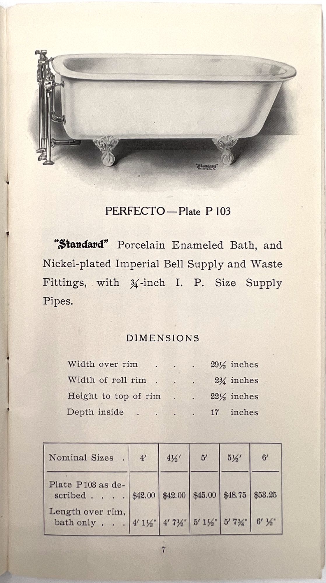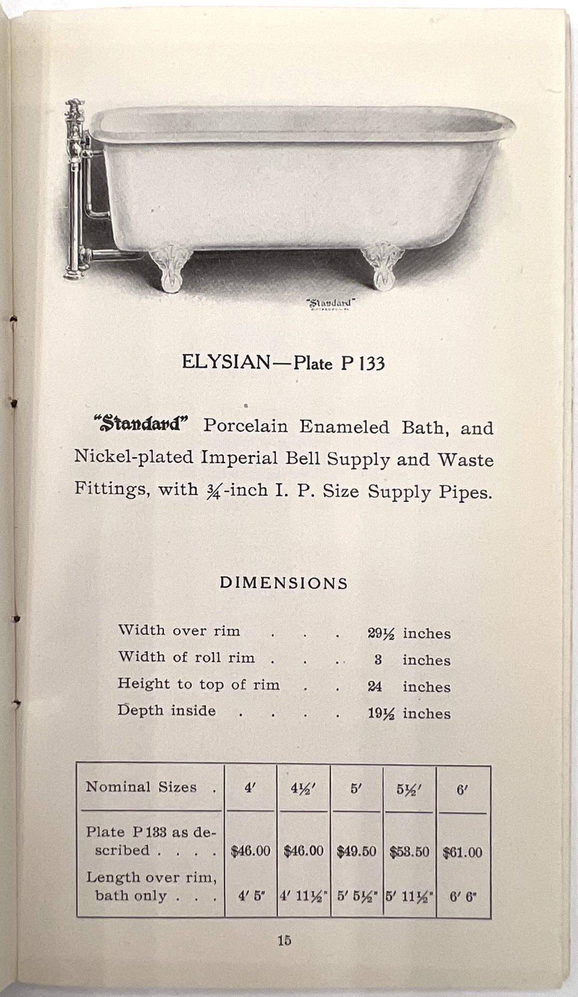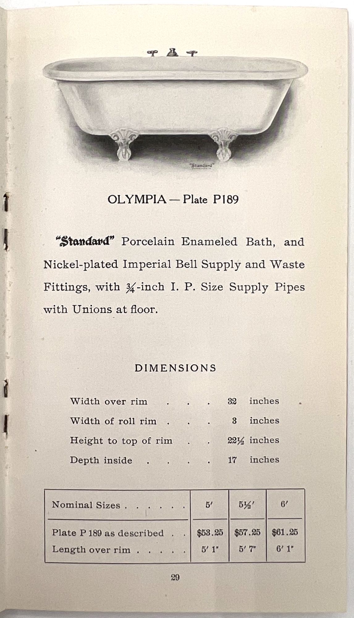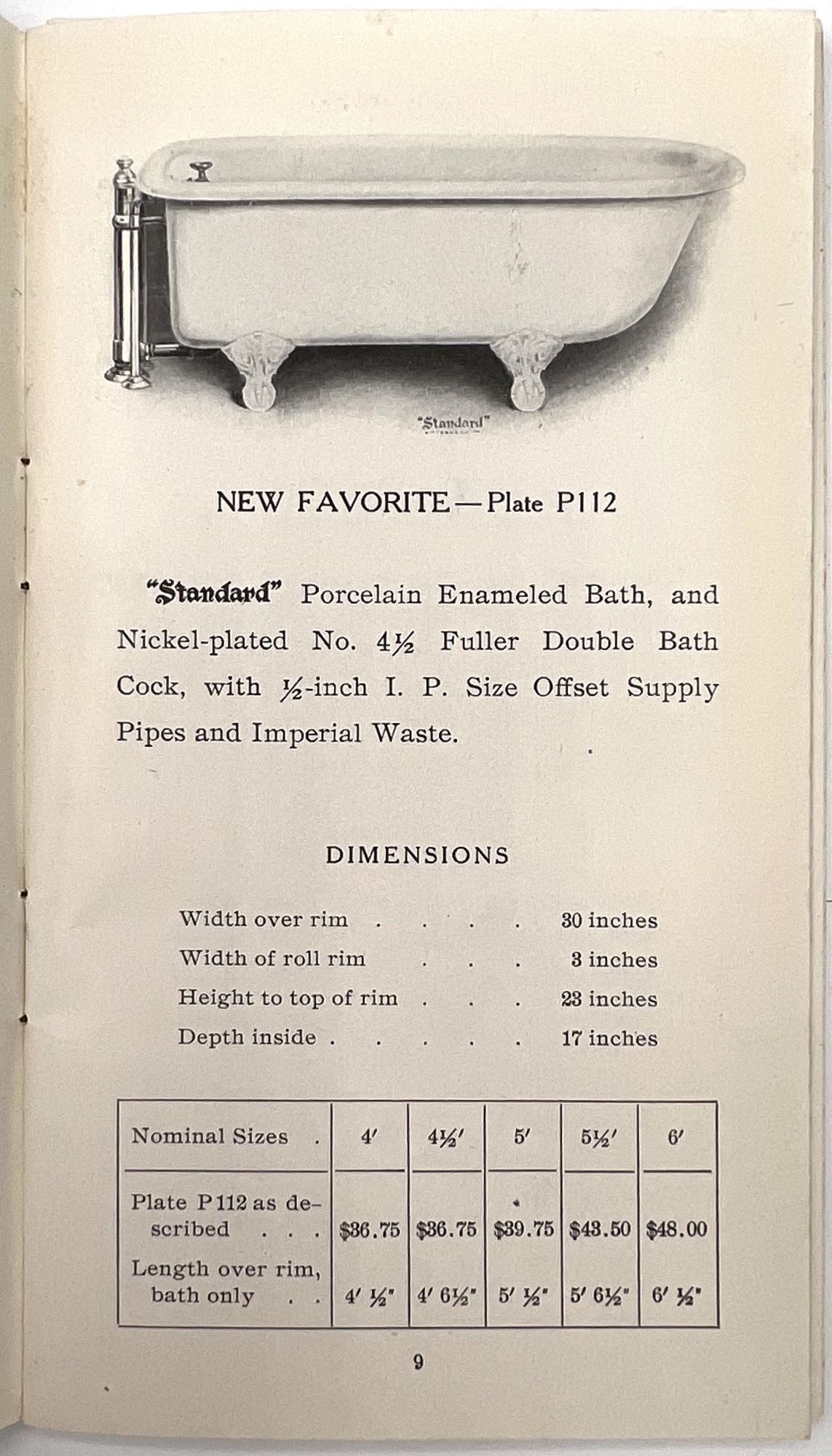 Pittsburgh, Pennsylvania: Standard Sanitary Mfg. Co, 1906. Near-fine. Two leaves in center of gathering detached but present.. A trade catalogue advertising "Standard" brand porcelain enameled baths, featuring images, sizing, and pricing for over thirty-five different styles of baths. Each lavish bath is softly lit and styled to attract high-end clients. Features an image of a beautiful young woman drawing a bath in front of an Art Nouveau-style window on the upper wrapper. Single vol. (6" by 3.25"), pp. 46, [2], illus., stapled in original illus. brown wrps. Ownership signature in ink ("Edgar Willis") dated 1911 to recto of upper wrapper. Ink stamp of Newark, New Jersey sales agent to upper wrapper.