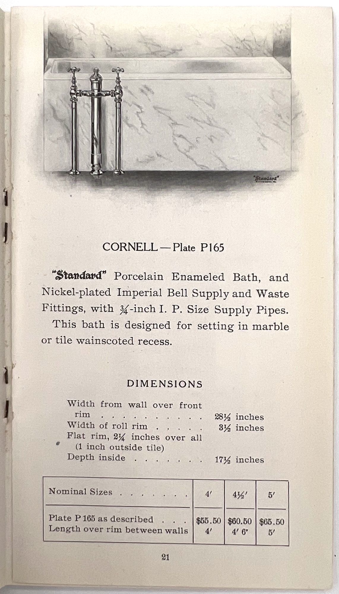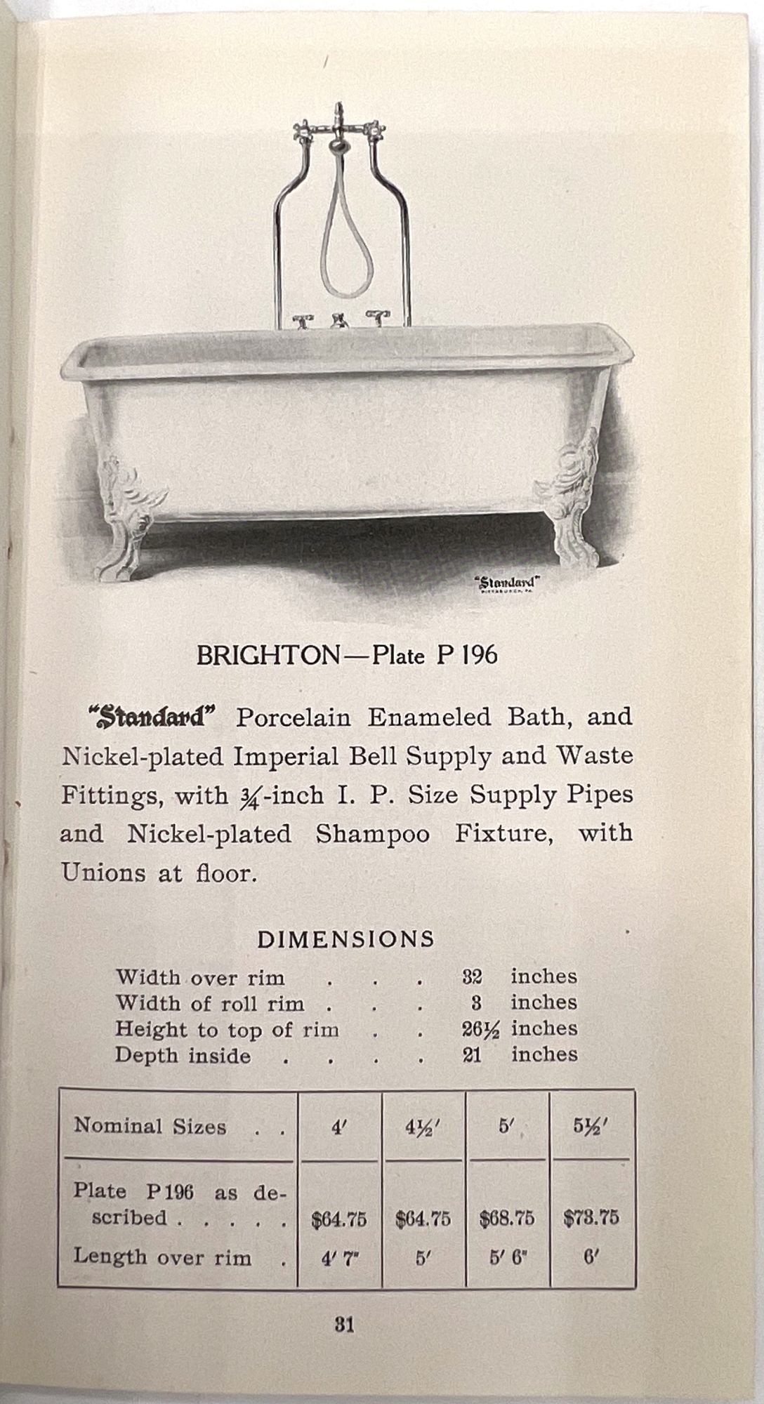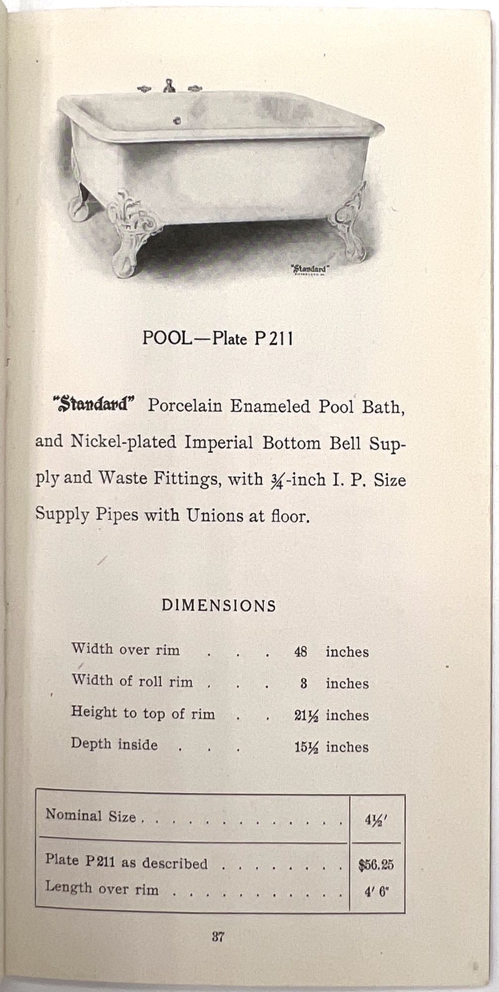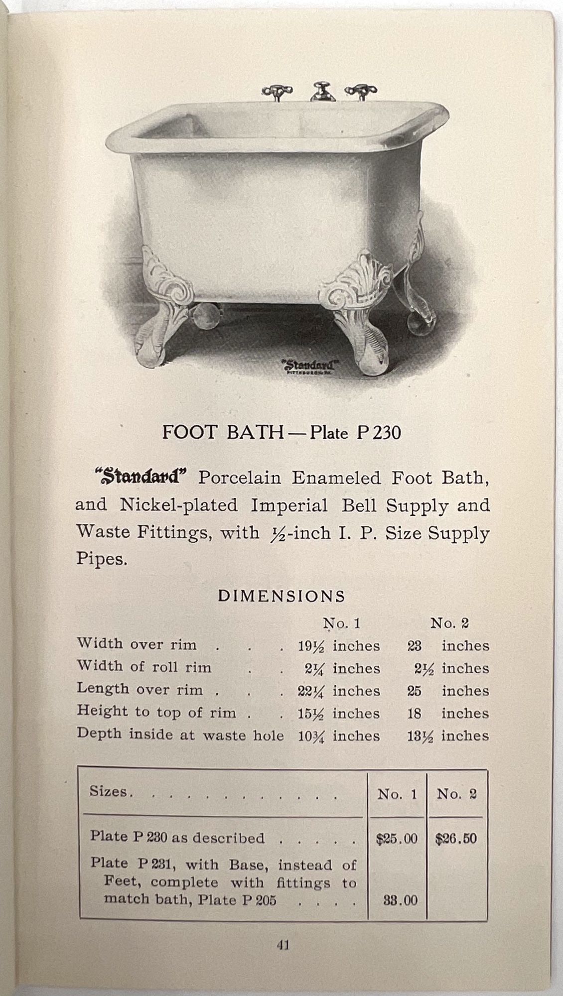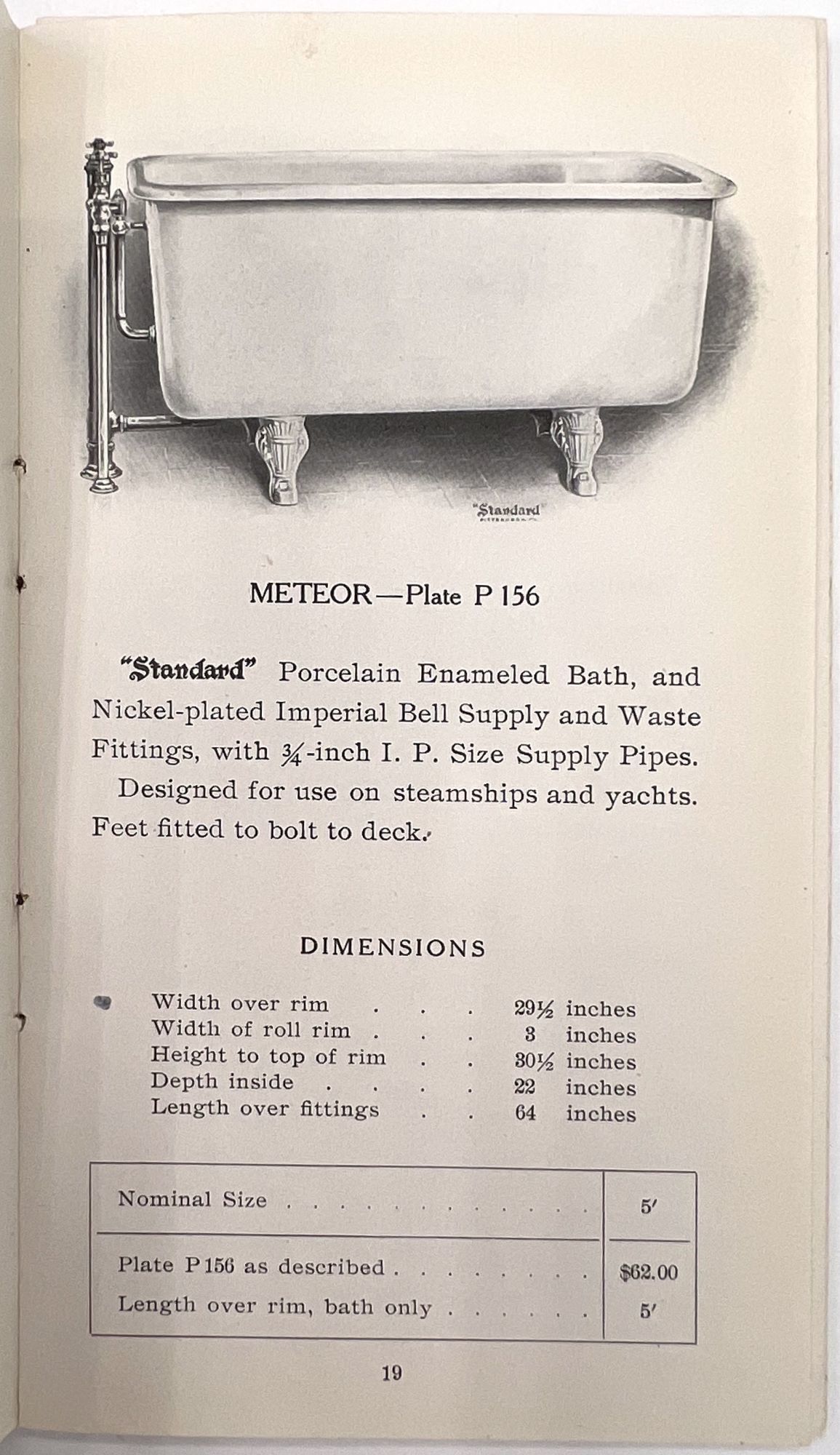 Pittsburgh, Pennsylvania: Standard Sanitary Mfg. Co, 1906. Near-fine. Two leaves in center of gathering detached but present.. A trade catalogue advertising "Standard" brand porcelain enameled baths, featuring images, sizing, and pricing for over thirty-five different styles of baths. Each lavish bath is softly lit and styled to attract high-end clients. Features an image of a beautiful young woman drawing a bath in front of an Art Nouveau-style window on the upper wrapper. Single vol. (6" by 3.25"), pp. 46, [2], illus., stapled in original illus. brown wrps. Ownership signature in ink ("Edgar Willis") dated 1911 to recto of upper wrapper. Ink stamp of Newark, New Jersey sales agent to upper wrapper.