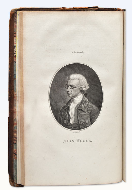London: Printed for George Nicol, 1785. Second Edition. Illustrated with 8 engraved plates designed by Kauffman, Thomas Stothard, Metz and Hamilton (3 plates in Vol. I; 1 plate in vol. II; 2 in Vol. III; and 1 each in vols. IV & V) including the plate (facing p. 164 of volume 3) engraved by William Blake after the drawing by Thomas Stothard. 5 vols. 8vo. Full contemporary tree calf, spines with gilt onrnaments and red and black labels. Bindings a bit rubbed at joints, small chips , internally near fine. Blake, William. Second Edition. Illustrated with 8 engraved plates designed by Kauffman, Thomas Stothard, Metz and Hamilton (3 plates in Vol. I; 1 plate in vol. II; 2 in Vol. III; and 1 each in vols. IV & V) including the plate (facing p. 164 of volume 3) engraved by William Blake after the drawing by Thomas Stothard. 5 vols. 8vo. Hoole’s translation, in decasyllabic rhymed couplets, first appeared in 1783 with these illustrations. The Blake engraving dramatically illustrates Orlando brandishing an uprooted tree, for which Blake altered the original Stothard drawing in interesting ways (cf. Essick, figs. 34 & 35). Most notably, Blake enlarged the roots of the uprooted pine dramatically, with an effect far more ‘furious’ than the original. Essick XII; Bentley (1977) 417; Keynes (1921) 96; Easson and Essick II; Lowndes 64