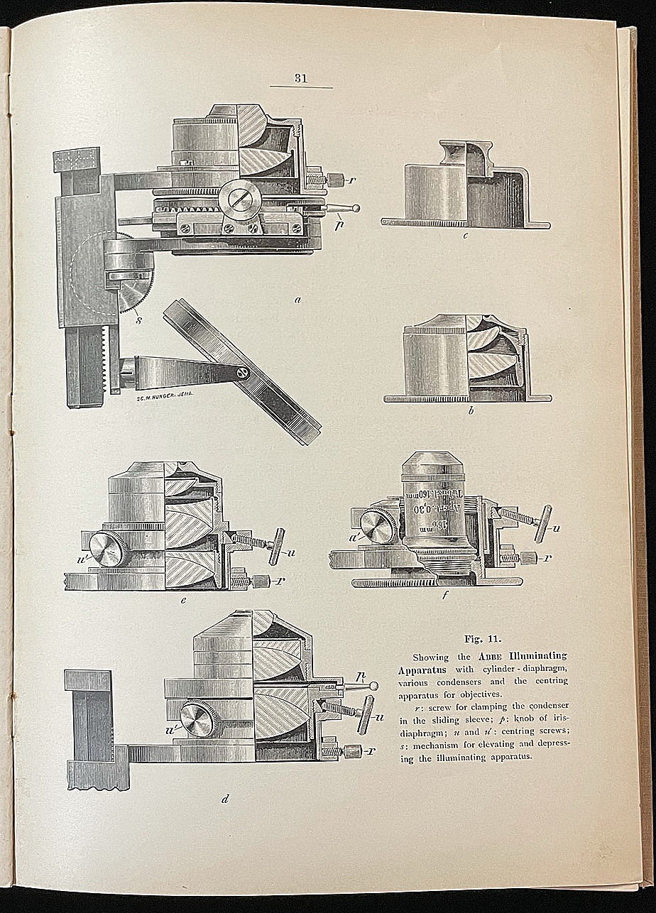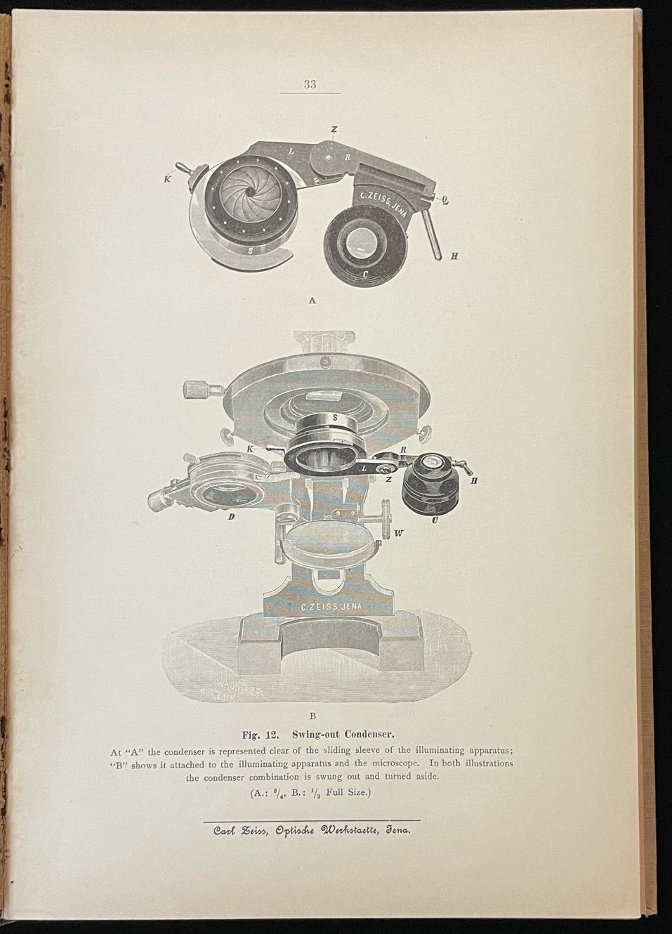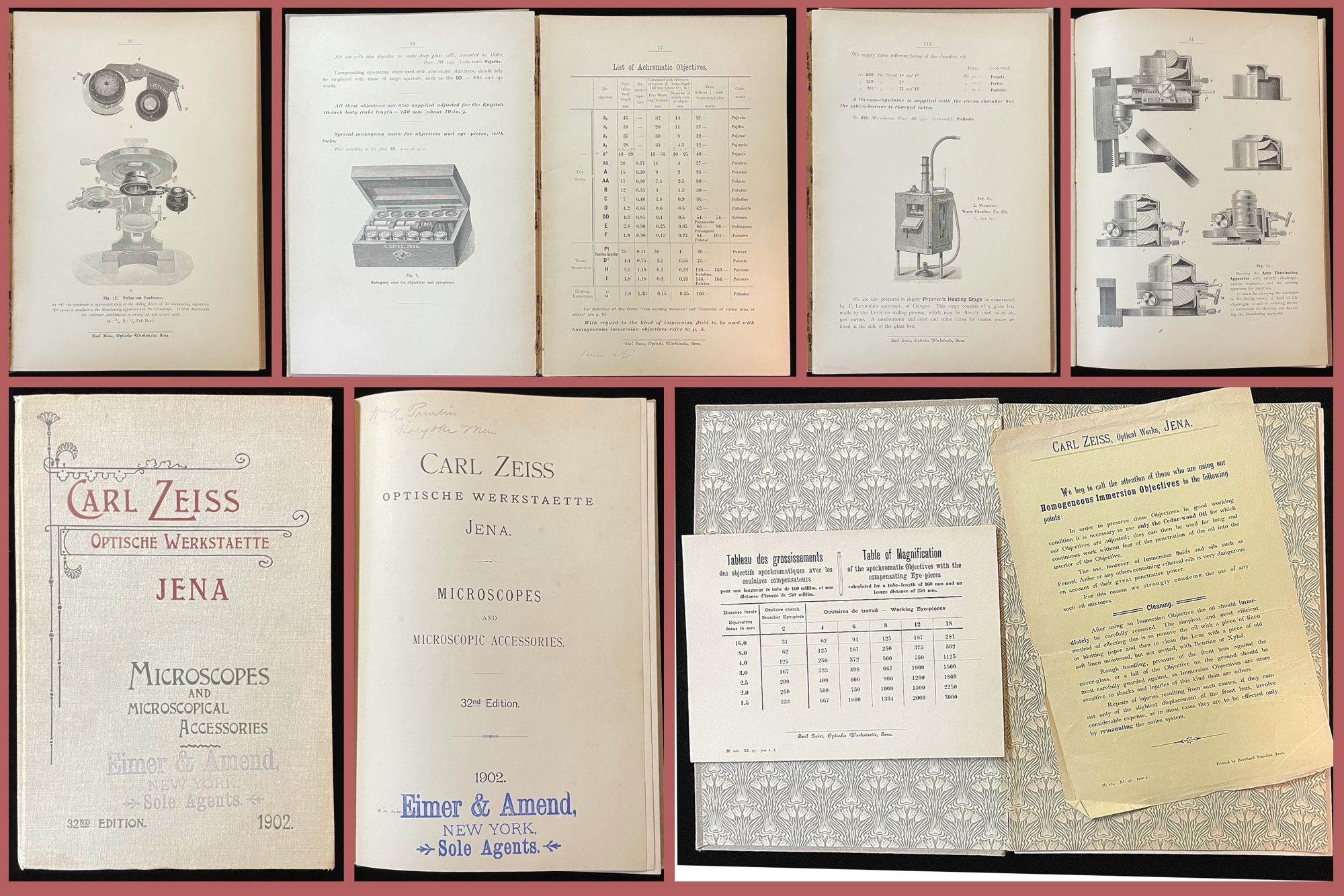 Jena: Optische Werkstate, 1902. Text block slightly loose but attached.. Illustrated trade catalog for Carl Zeiss, Optische Werkstaette "Microscopes and Microscopical Accessories" 32nd Edition. Cloth board cover, 164pp. Content includes Objectives and Eyepieces, Dissecting lenses and Hand-Magnifiers, Stands, Accessory Apparatus, Special Price List and Complete Microscope Outfits with comprehensive narrative and detailed illustrations of the available products. 10 3/4" x 7 1/2