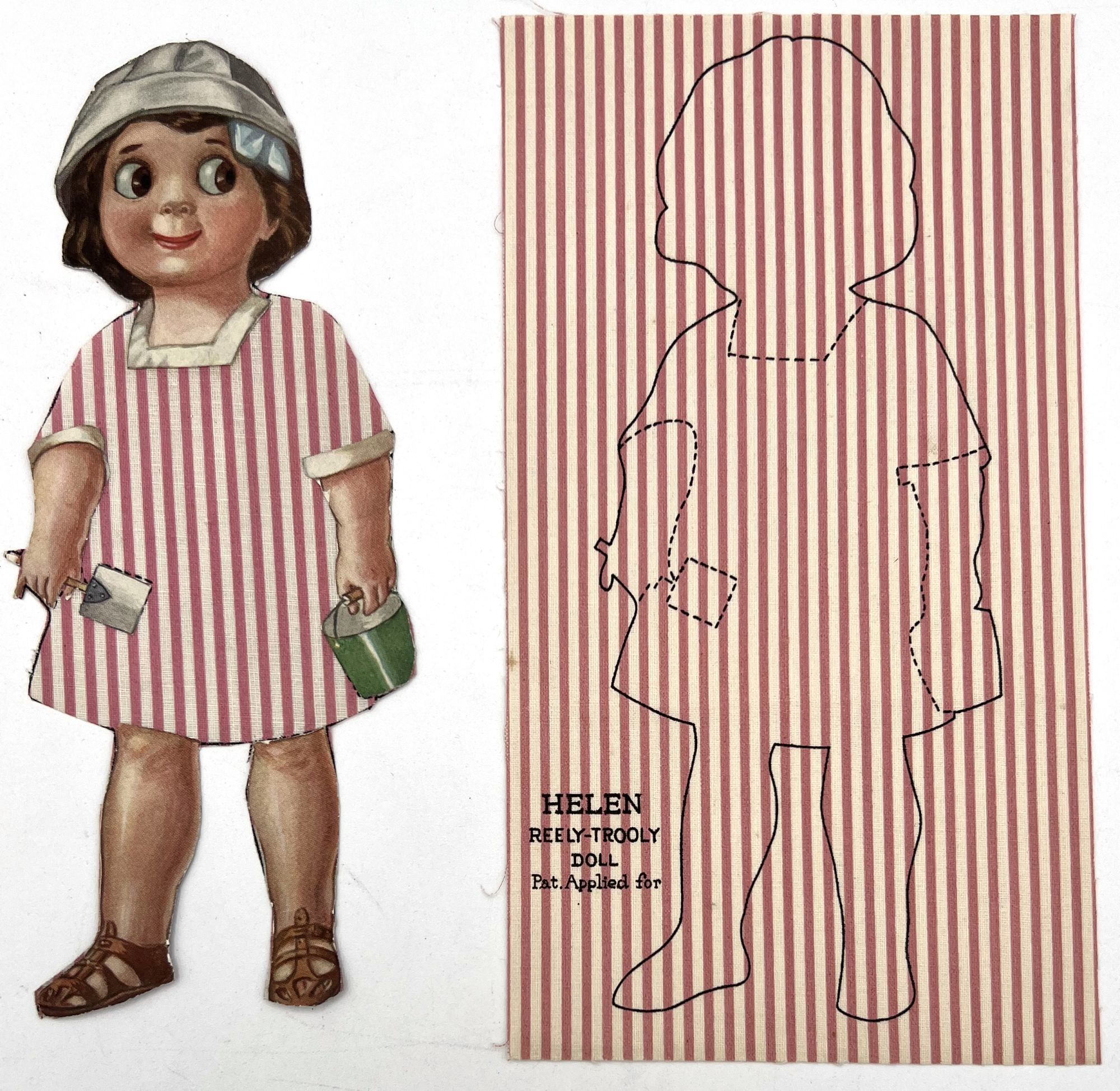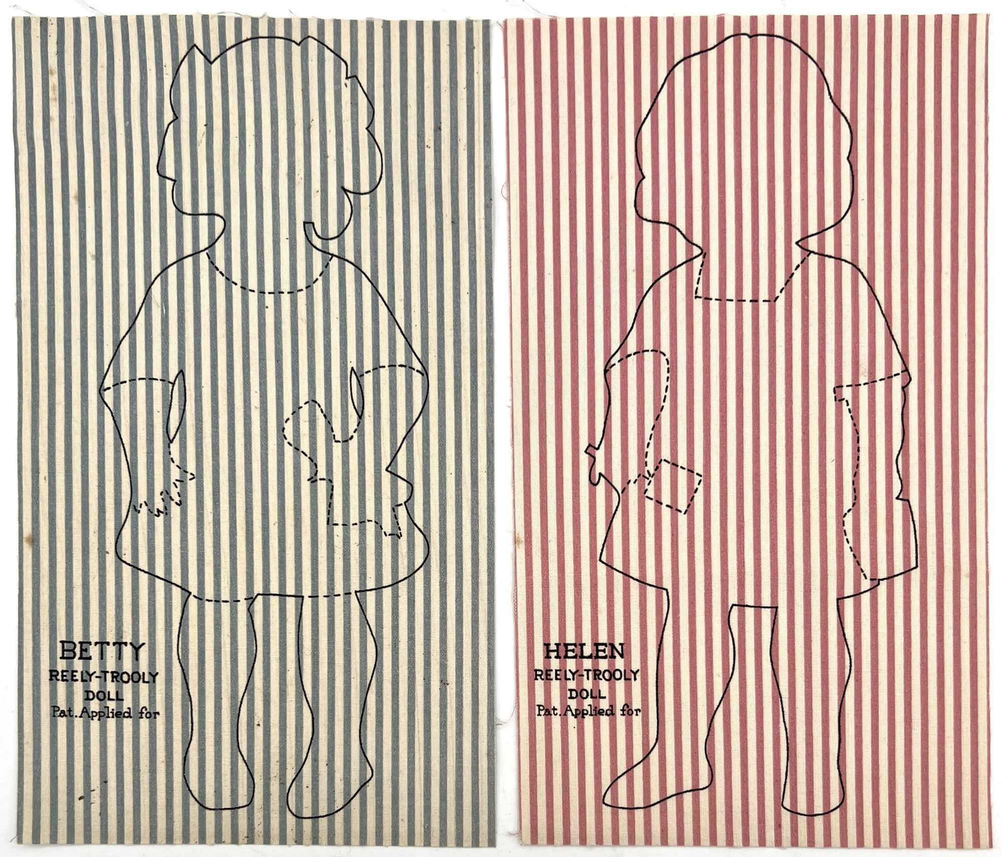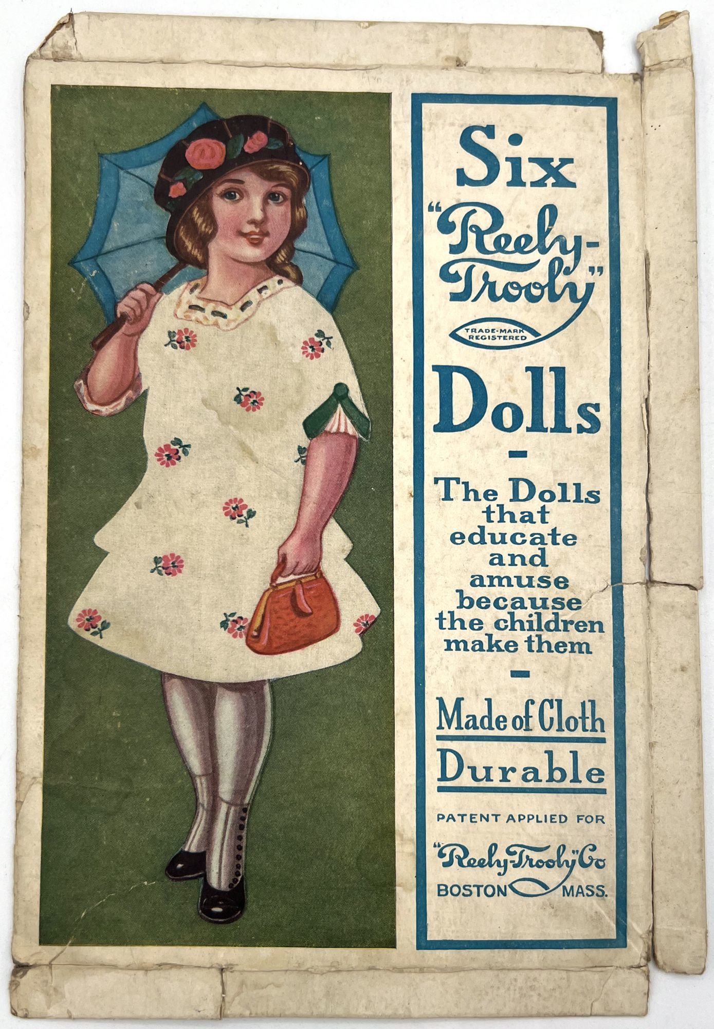 Boston, Massachusetts: Reely-Trooly Co, 1915. Very good. Cut, with some light dust soiling or spotting. A scarce cut set of "Six Reely-Trooly Dolls", a do-it-yourself style of paper doll that children could make themselves by cutting real cloth templates for the outfits. Markets itself as a durable set of "Dolls that educate and amuse because the children make them". This set includes five of the six required 8.5" dolls (Dorothy, Ruth, Virginia, Helen and Myra are present, while Betty is missing), and has three additional variations (for Ruth, Dorothy, and Virginia). Each doll consists of a cut cloth outfit with printed limbs, a head, legs and a thick card strip in the back to help them stand up. Includes printed directions on the back of the card box lid, which measures approx. 10.5" by 6.5