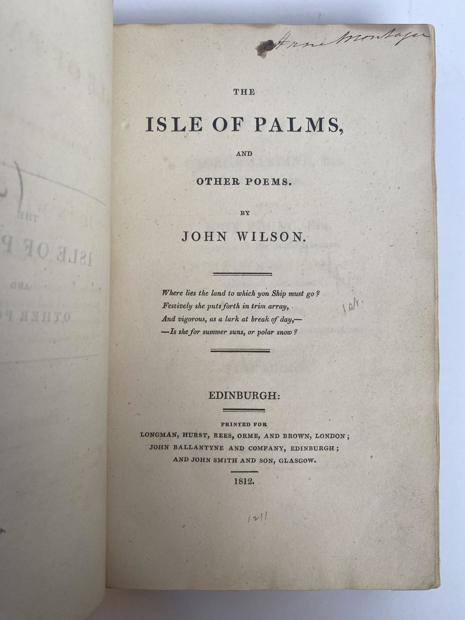 Edinburgh: John Ballantyne and Company, 1812. First Edition. Hardcover. Octavo, ix, 415, 10 pages. In Very Good minus condition. Bound in half red leather and marbled paper boards with gilt lettering on paneled spine. Mild shelf wear. Soiling to leather on front and rear covers. Light rubbing to front hinge. Top edge of textblock gilt. Marbled endpapers. Age-toning and foxing to interior pages. With 10 pages of advertisements in rear. Shelved in Room G. 1382593. Special Collections.