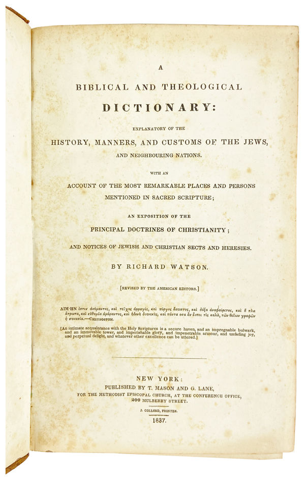 New York: Published by T. Mason and G. Lane, 1837. Very Good. New York: Published by T. Mason and G. Lane, 1837. Revised Later Edition. Octavo. 1003 pp. Five fold-out maps. Bound in full sheep; four raised bands and red leather title label to spine. Boards worn with brief exposure and some flaking; couple chips and black discoloration to rear. Binding sound. Bookplate of two former owners to front pastedown; brief tape remnants and moderate spotting to endpapers; marginal spotting to interior but legible throughout; maps toned and chipped along edges, overall a Very Good and relatively well-preserved copy.