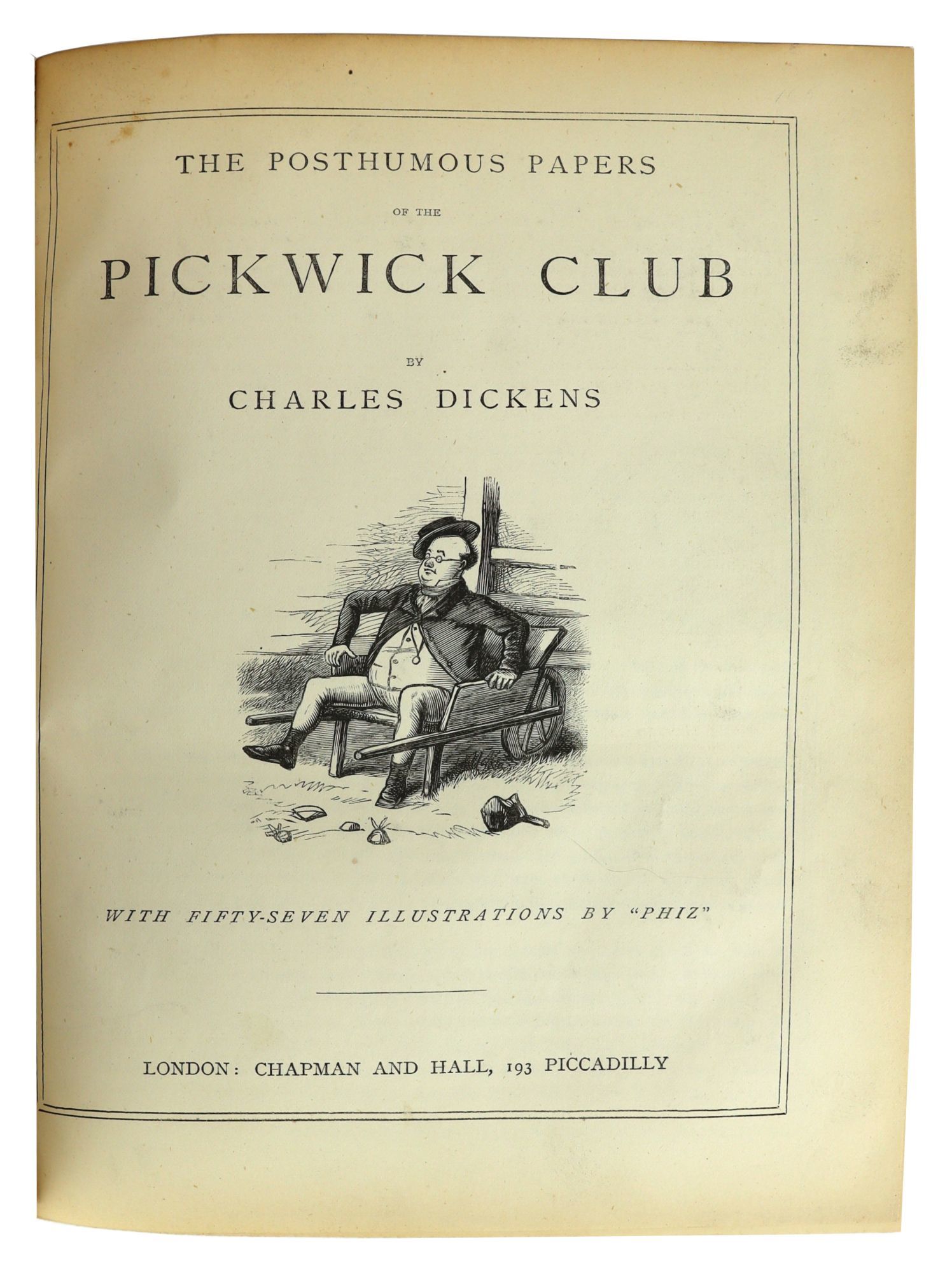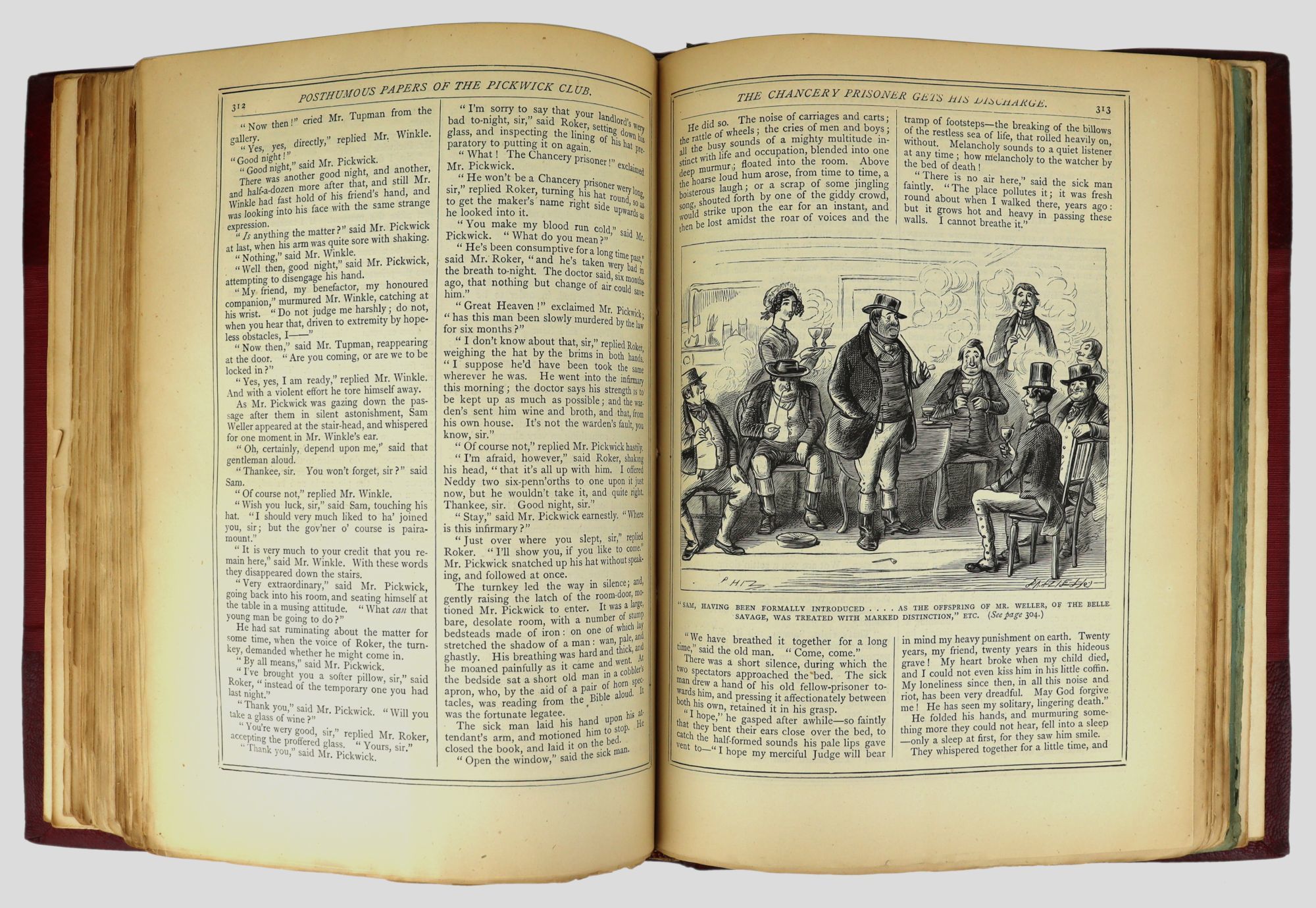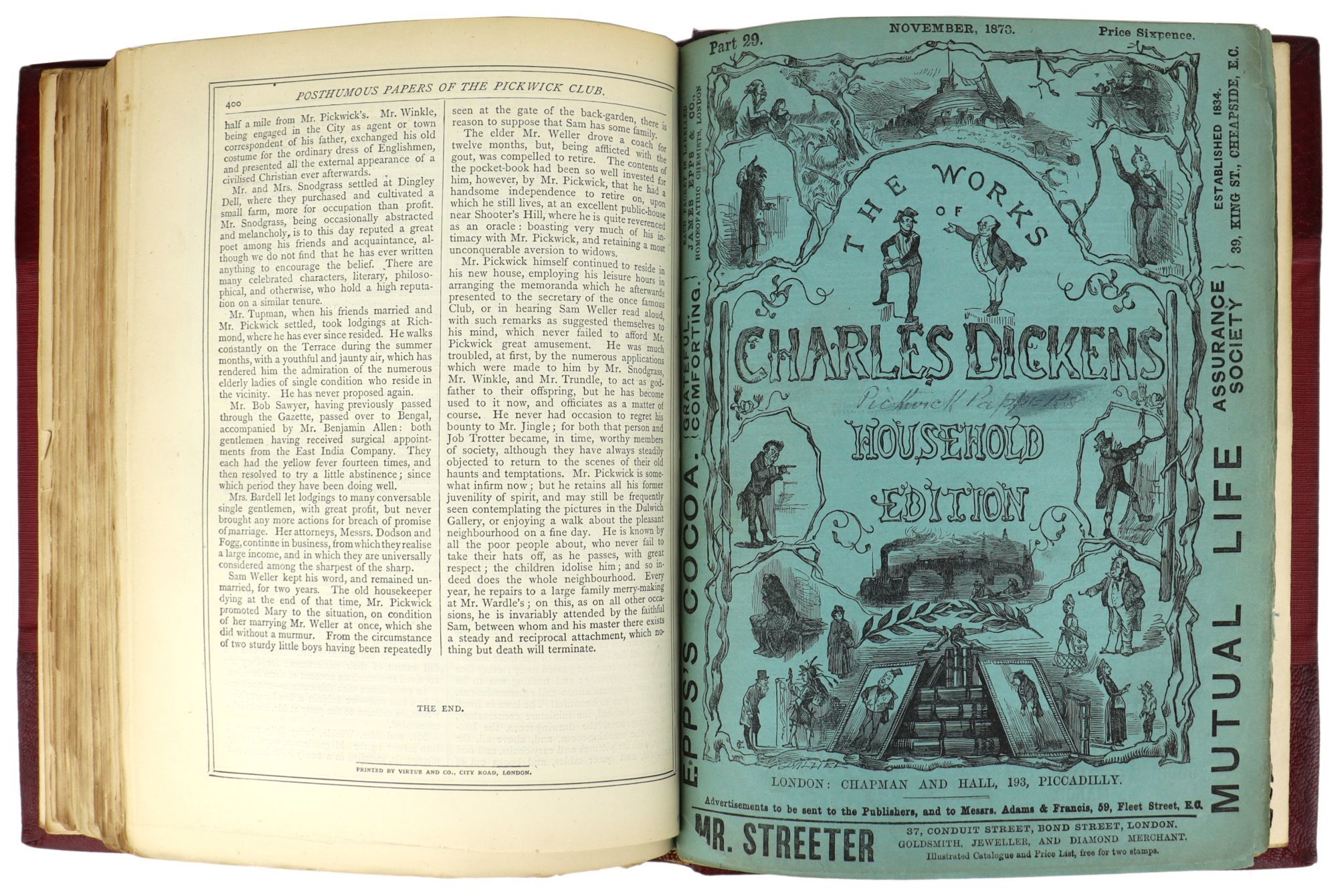 London: Chapman and Hall, 1874. Very Good. London: Chapman and Hall, 1873-74. Publisher's “Household Edition,” here parts 29-34 from November ’73 through April ’74 and constituting the whole of Pickwick. Large octavo. 400 pp. Illustrations by Phiz, complete. Rebound in red quarter morocco with five raised bands and gilt lettering to spine; top edge gilt; marbled endpapers. Original blue-green paper wraps for each volume retained and bound in at rear. Light wear and dust soiling to edges. Binding sound. Small dampstain at head of front free endpaper verso and flyleaf at gutter; tear to frontis with tape repair; patch of dampstaining to top front corner of plate facing p. 101, just barely touching illustration; prior ownership stamp [Wilson H. Kimnach] on front pastedown; interior otherwise unmarked and legible throughout; a Very Good copy in a handsome binding.