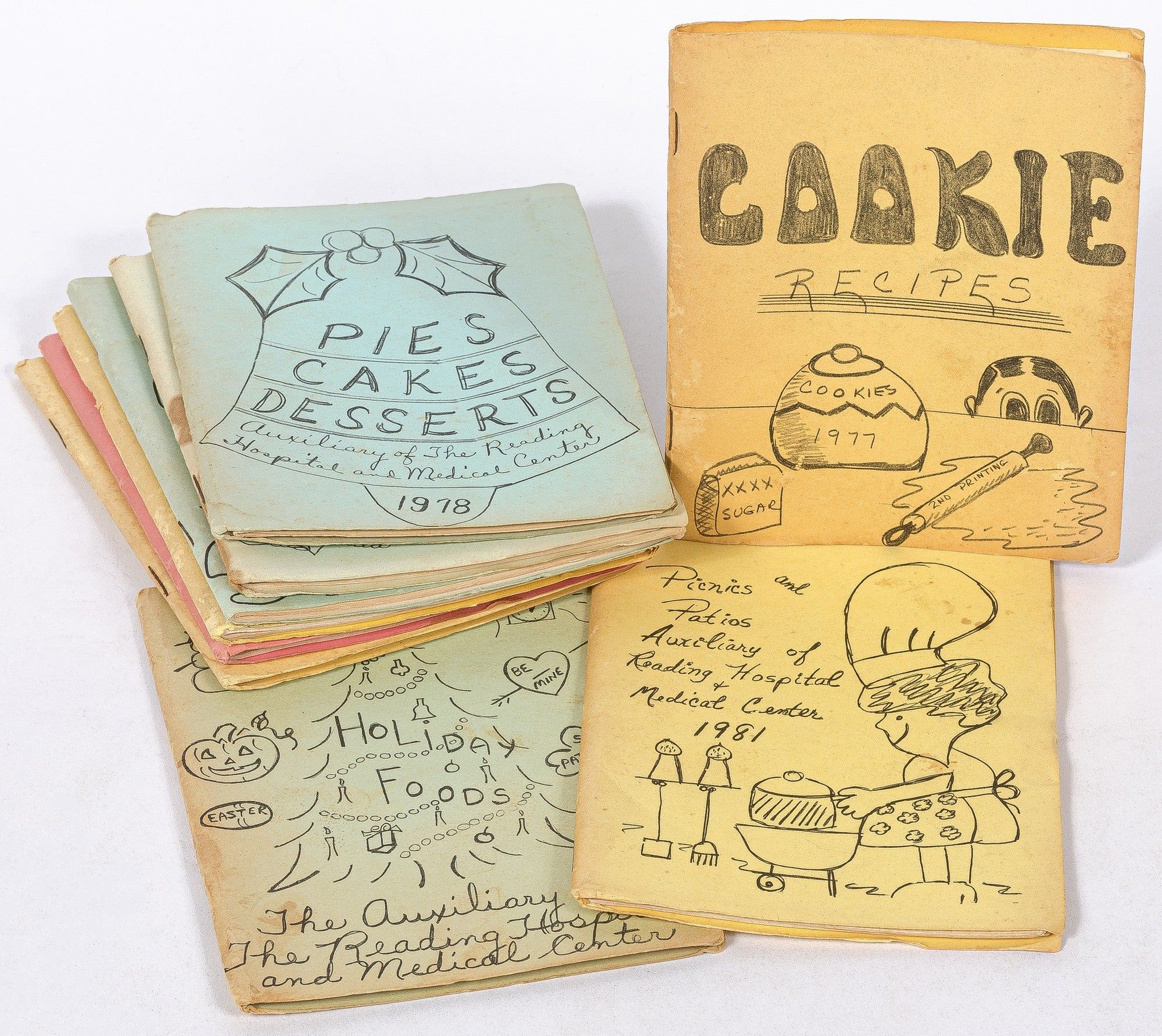 Reading, Pennsylvania: The Auxiliary of the Reading Hospital and Medical Center, 1981. Softcover. Very Good. Nine volumes; three are second editions (with, to the best of our understanding have completely different recipes than the first) and one second printing, the others are first editions. Slim 24mos. Approximately 64 pages each. Illustrated stapled wrappers with wear and soil, one lightly foxed, a couple of staple a bit oxidized, sound and just about very good. The mimeographed text is bright and nicely preserved. A charming collection of small cookbooks published by The Auxiliary of the Reading Pennsylvania Hospital and Medical Center in the late 1970s and early 1980s (six are dated). The topics of the cookbooks are: Holiday Foods, Picnics and Patios, Breakfast Cakes and Breads, two on Cookies (a second printing of the first edition and a second edition with different recipes), Pies and Desserts, Salads and Hors d'oeuvres (two undated copies with slightly different covers and recipes), and Casseroles and One-Dish Meals. Very uncommon; *OCLC* locates a single copy of one volume ("Casseroles & One-Dish Meals") at Penn.