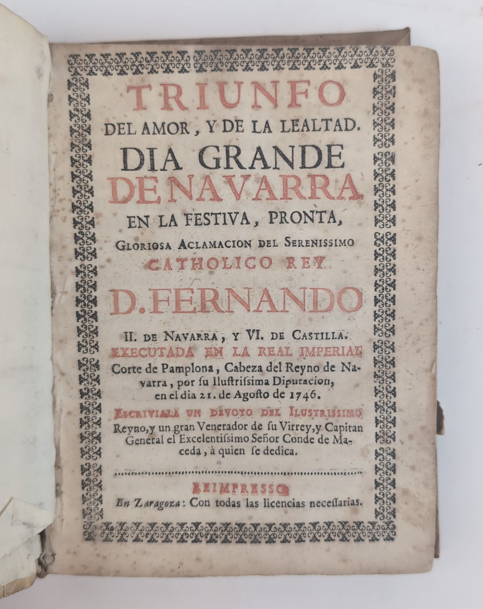 TRIUNFO DEL AMOR, Y DE LA LEALTAD. DIA GRANDE DE NAVARRA EN LA FESTIVA, PRONTA, GLORIOSA ACLAMACION DEL SERENISSIMO CATHOLICO REY D. FERNANDO. Zaragoza: [N.p.], 1746. [12], 68, [4], 40 pages.