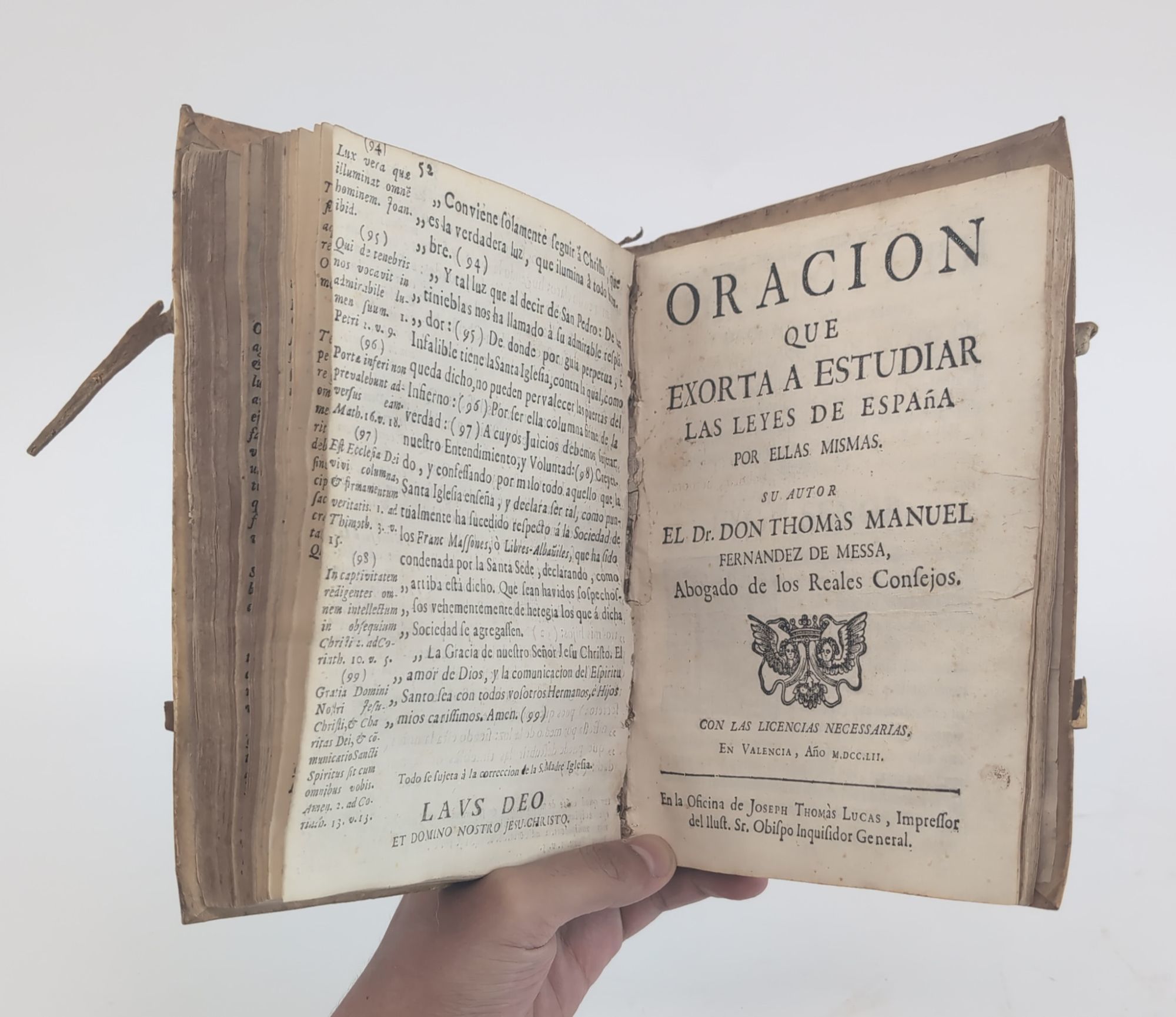 Fernandez de Messa, Thomàs Manuel. ORACION QUE EXORTA A ESTUDIAR LAS LEYES DE ESPAÑA POR ELLAS MISMAS. Valencia: Joseph Thomàs Lucas, 1752. [12], 17, [1] pages.