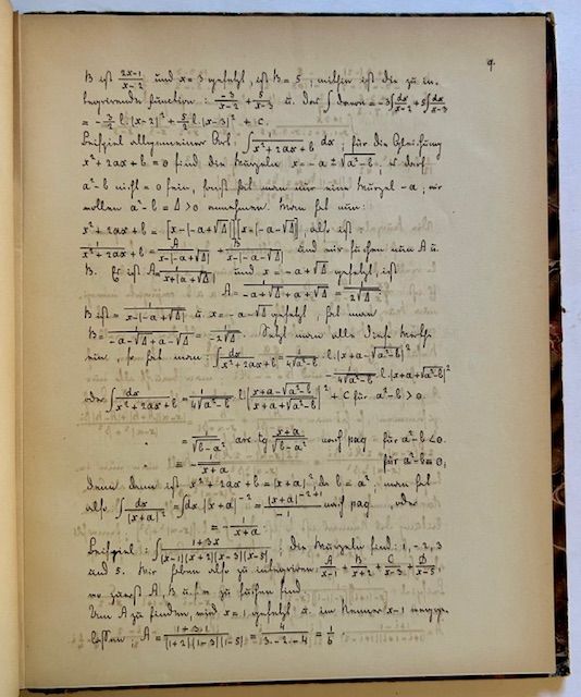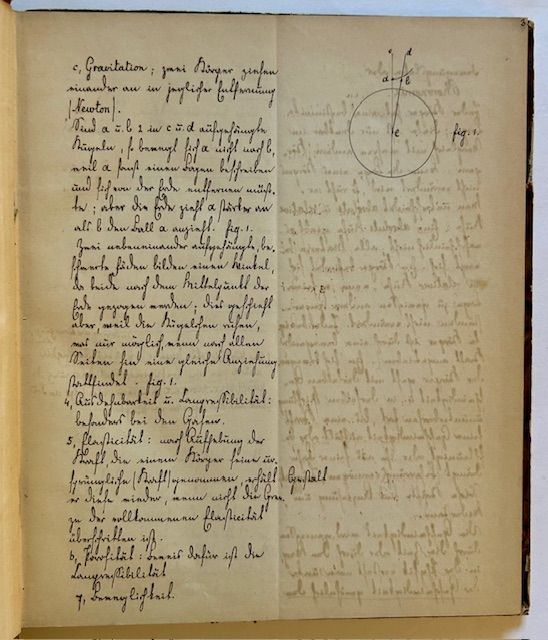 Marbled boards. Very Good. Here offered are six handwritten notebooks of O. Olshausen, an advanced student at both the University of Berlin and the University of Heidelberg from 1859-1861.The notebooks span the 1859-1860 winter and summer semesters in Berlin through the Heidelberg summer semester of 1861. Olshausen confidently took meticulous notes in ink as a student of physics, differential calculus, organic chemistry, analytical geometry, and analytical mechanics. He studied with noted scholars of science and mathematics, including Professor Heinrich Gustav Magnus (an experimental physicist renowned for his research and teaching lab at the University of Berlin) and Professor Ernst Kummer (a mathematician who specialized in ballistics). The notebooks are in German, with hundreds of diagrams and formulas in Olshausen's hand. The 6 notebooks, all uniform octavos, are sturdy and very presentable. Tight and VG in their marbled boards over spines lightly worn to varying degrees. Still though, the notebooks are very well-preserved, especially given their age -- and, internally, are all-but-pristine, with clear, remarkable penmanship on display throughout. Other professors to whom Olshausen devoted an entire notebook include: Dr. Arndt (Differential Calculus and Analytical Geometry) and Dr. Schneider (Organic Chemistry).