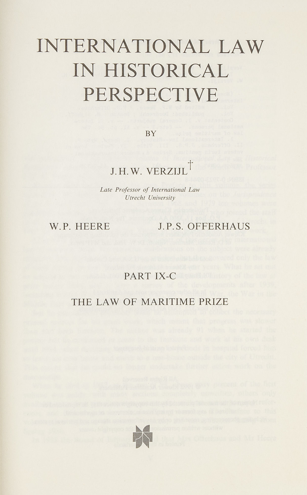 1992. Verzijl, J.H.W.; Heere, W.P.; Offerhaus, J.P.S. International Law in Historical Perspective: Part IX-C, the Law of Maritime Prize. Dordrecht [etc.]: Nijhoff, 1992. xvi, 729 pp. Hardcover, moderate shelfwear to boards and spine. Internally clean and bright. $100. * Nova et Vetera Iuris Gentium. Series A: Modern international law. Number 16.